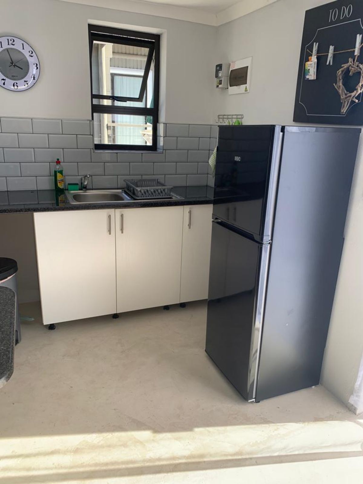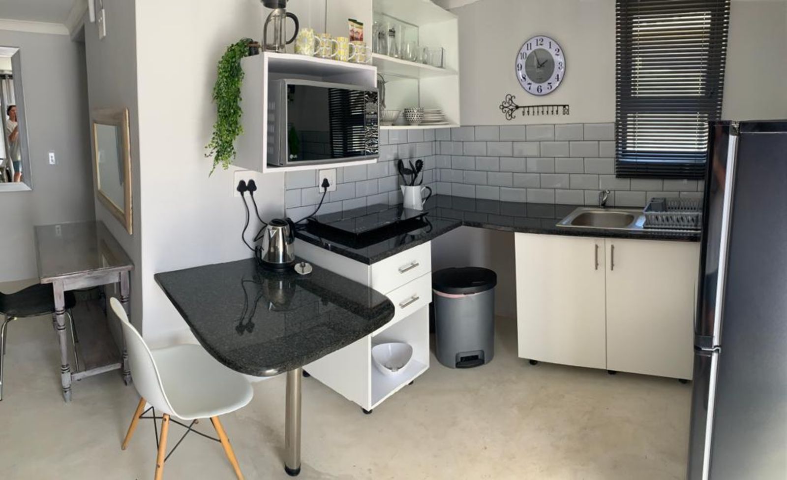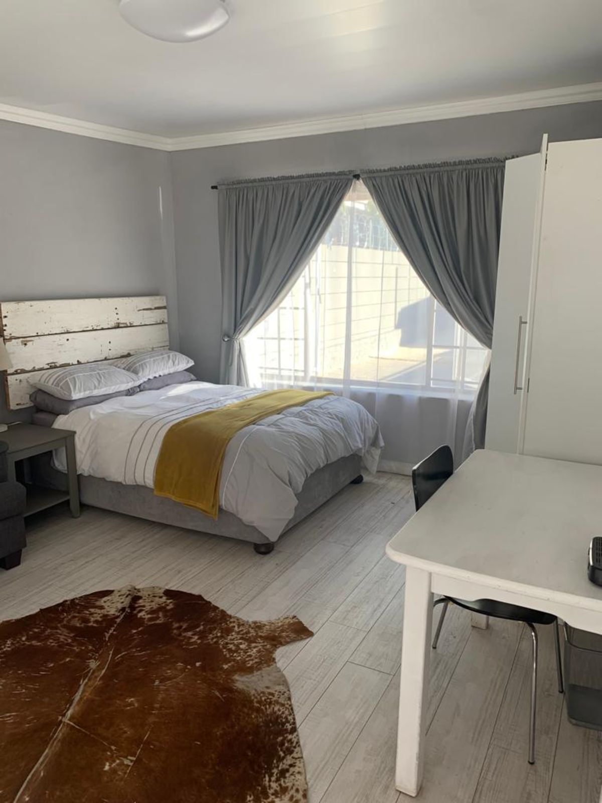 The unit consist of a bedroom with built in cupboards, and open plan kitchenette and a bathroom that has a shower and a toilet. The room is fitted with an air-conditioner.
