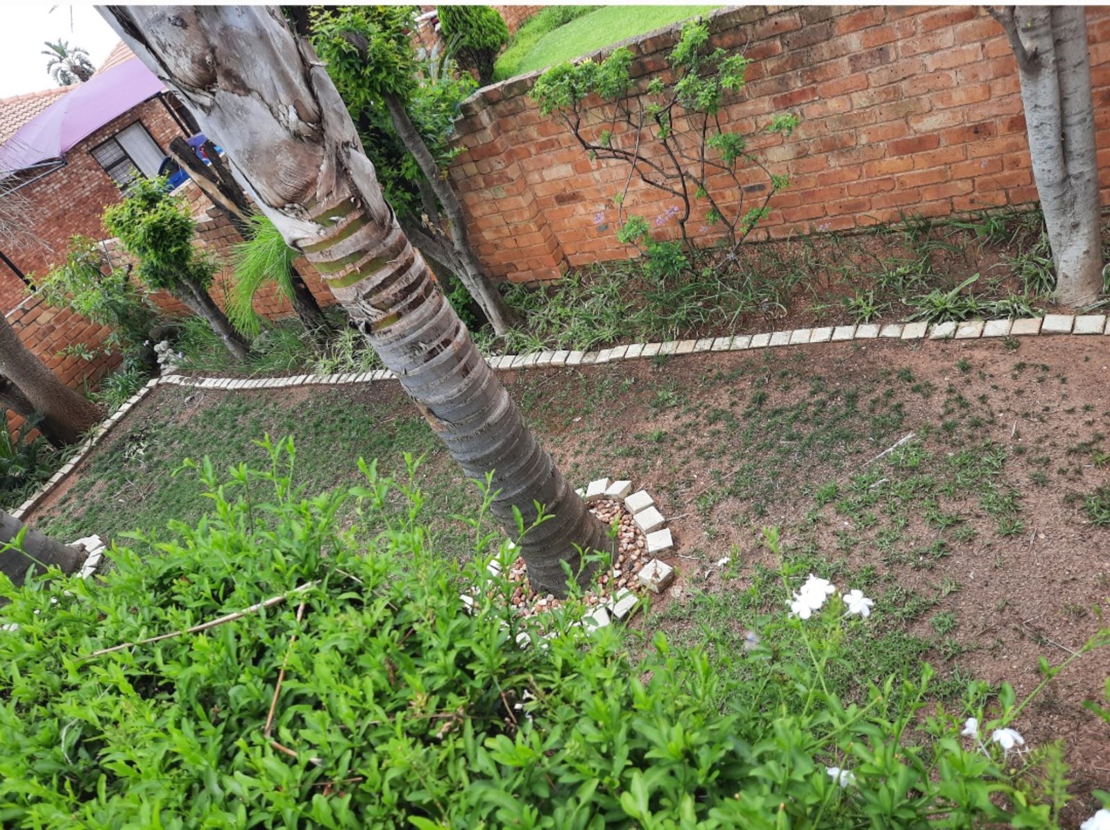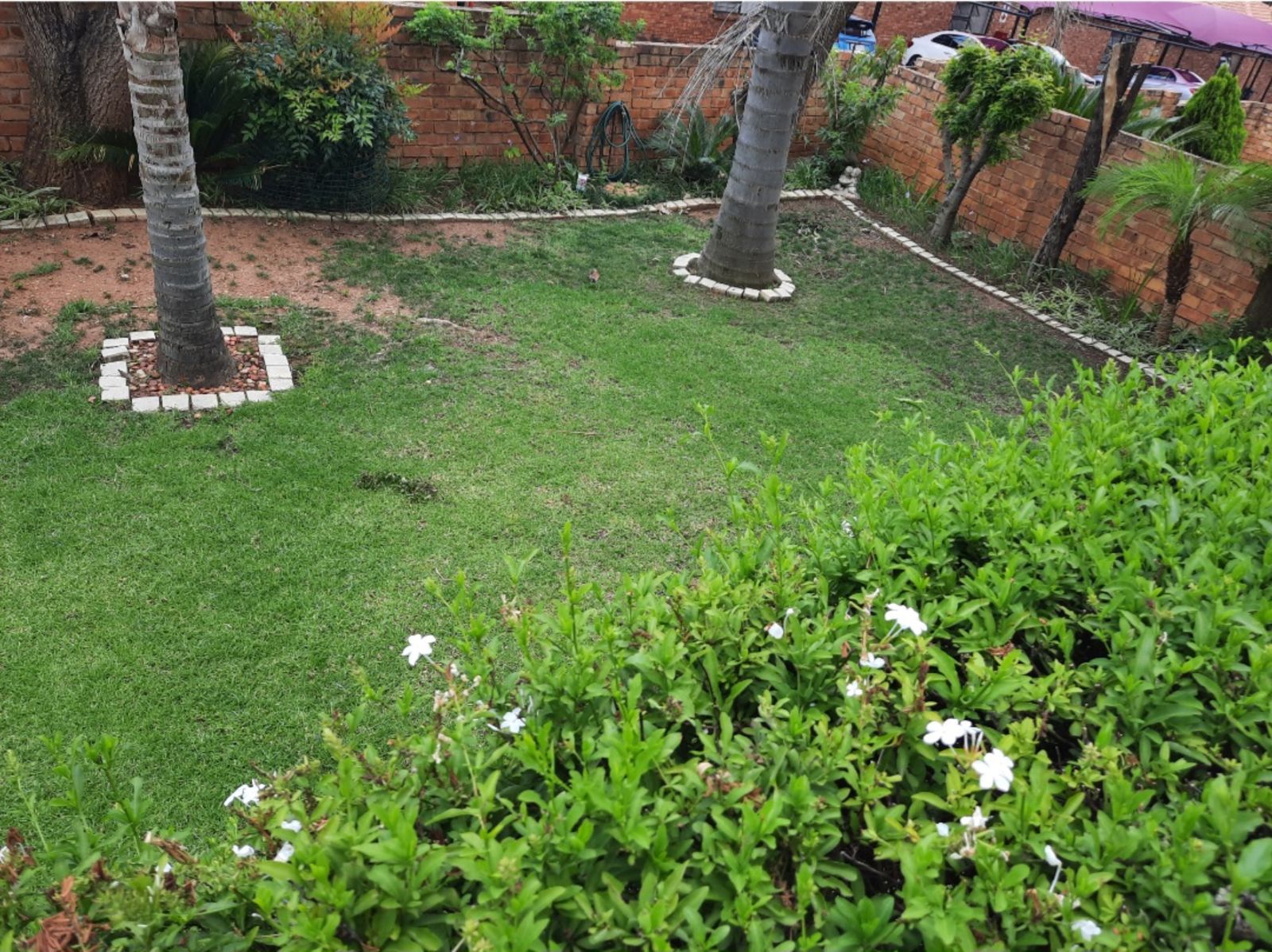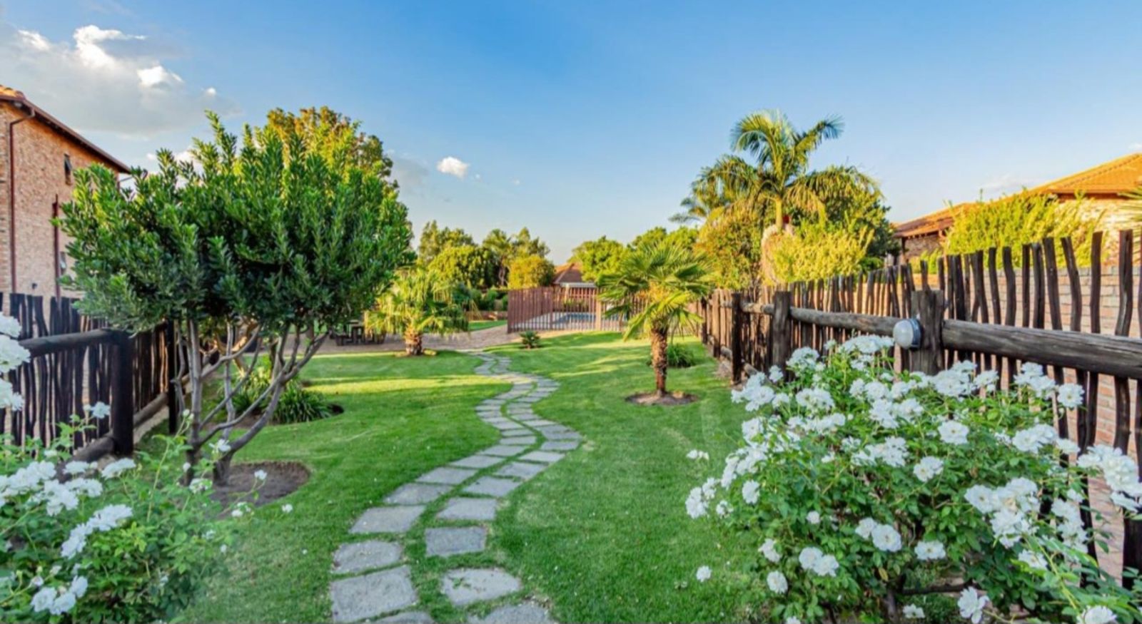 The master bedroom includes an en-suite bathroom and generous cupboard space, ensuring both privacy and practicality. From the lounge, sliding doors open onto a large patio that steps down into a quaint, well-kept garden framed by beautiful palm trees—perfect for relaxing outdoors or entertaining guests.