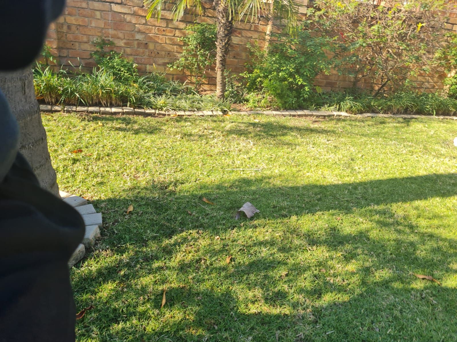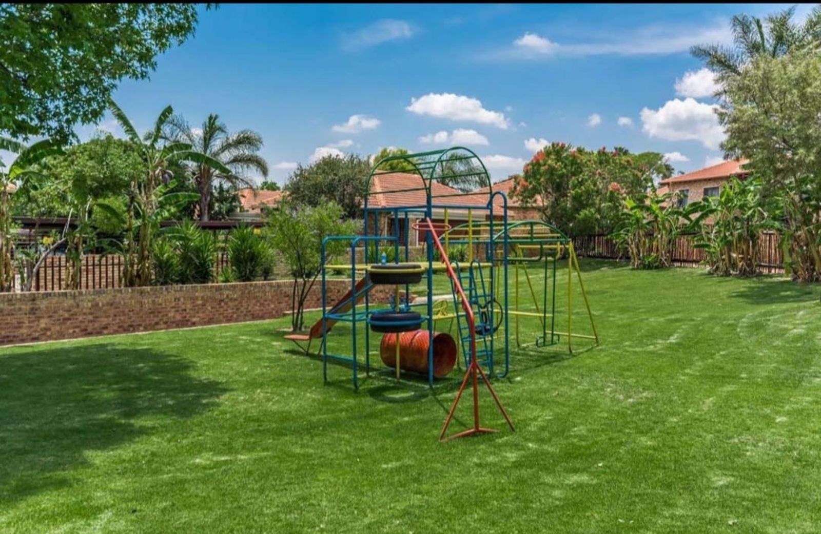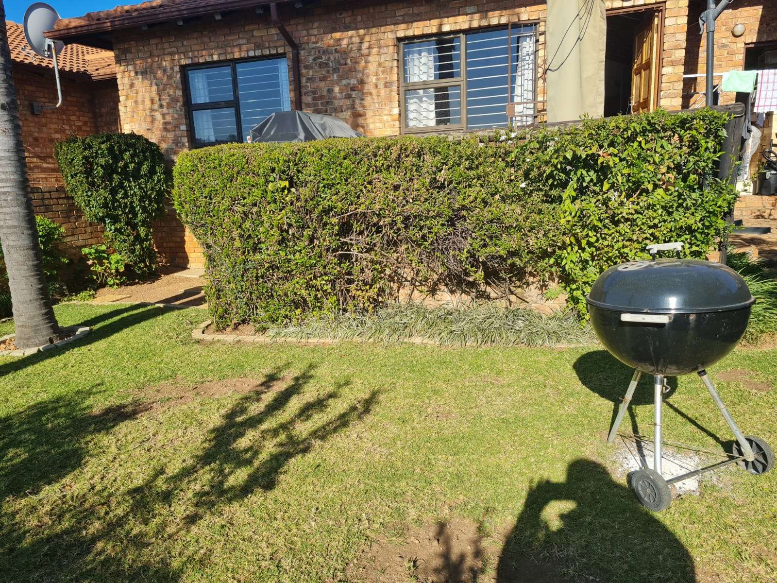 The master bedroom includes an en-suite bathroom and generous cupboard space, ensuring both privacy and practicality. From the lounge, sliding doors open onto a large patio that steps down into a quaint, well-kept garden framed by beautiful palm trees—perfect for relaxing outdoors or entertaining guests.