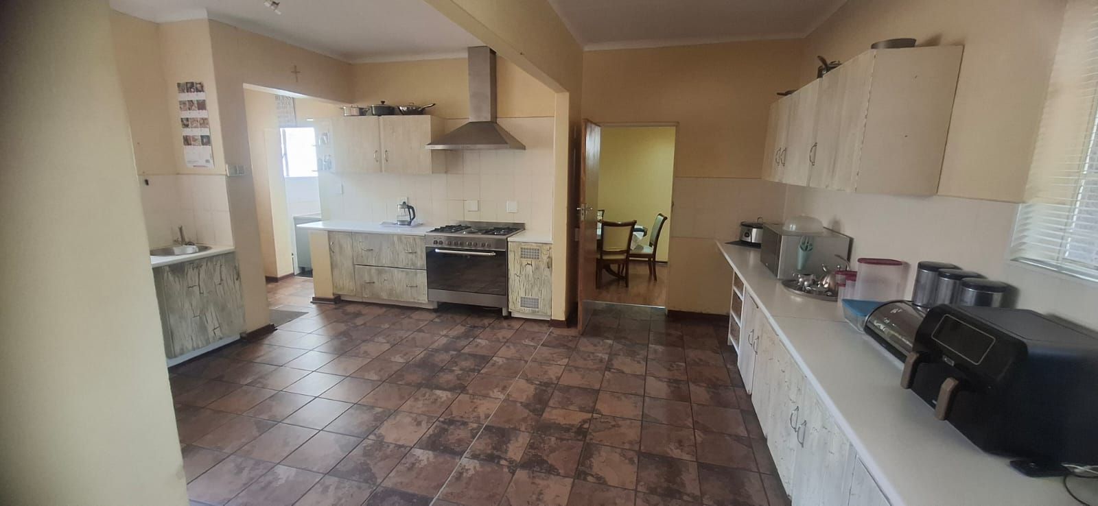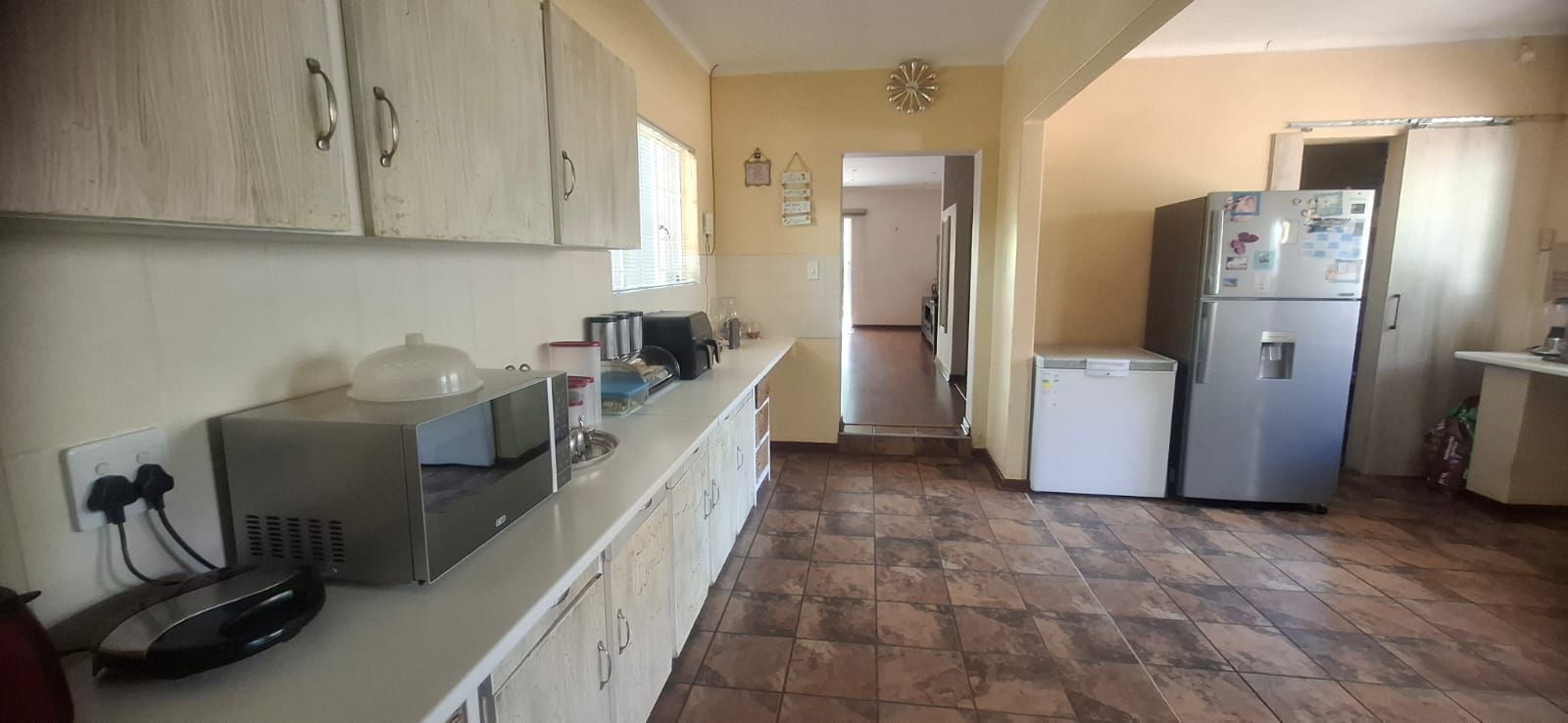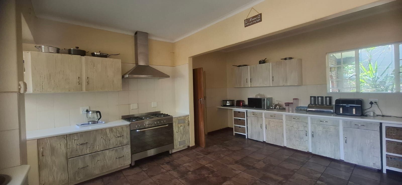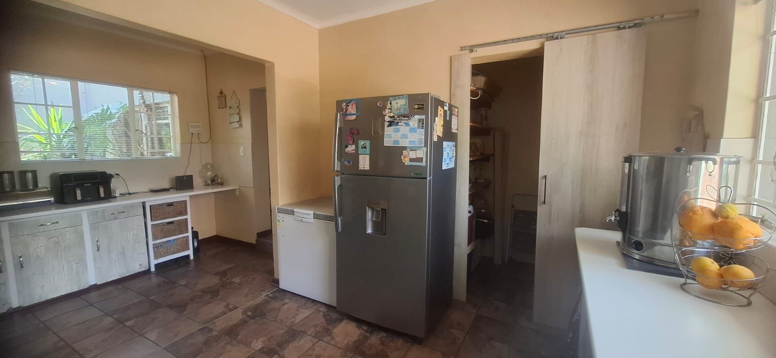 The kitchen is a standout, boasting modern cupboards, a generous layout with room for a central table, a 4-plate gas stove with 2 electric plates, pantry, and scullery.
