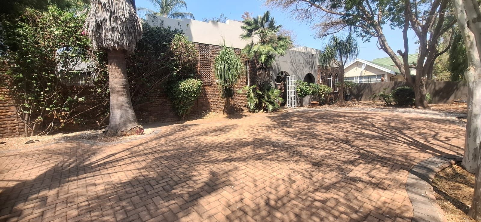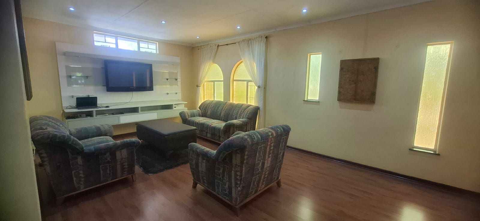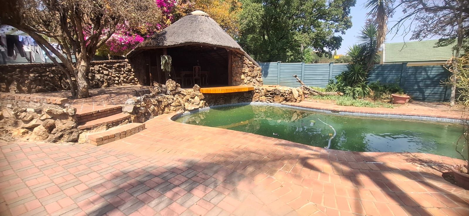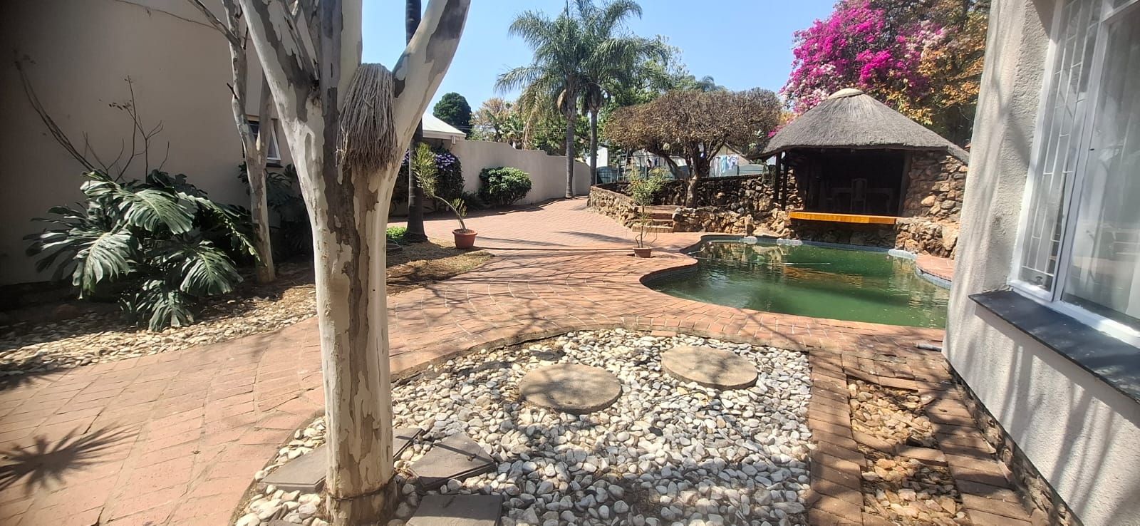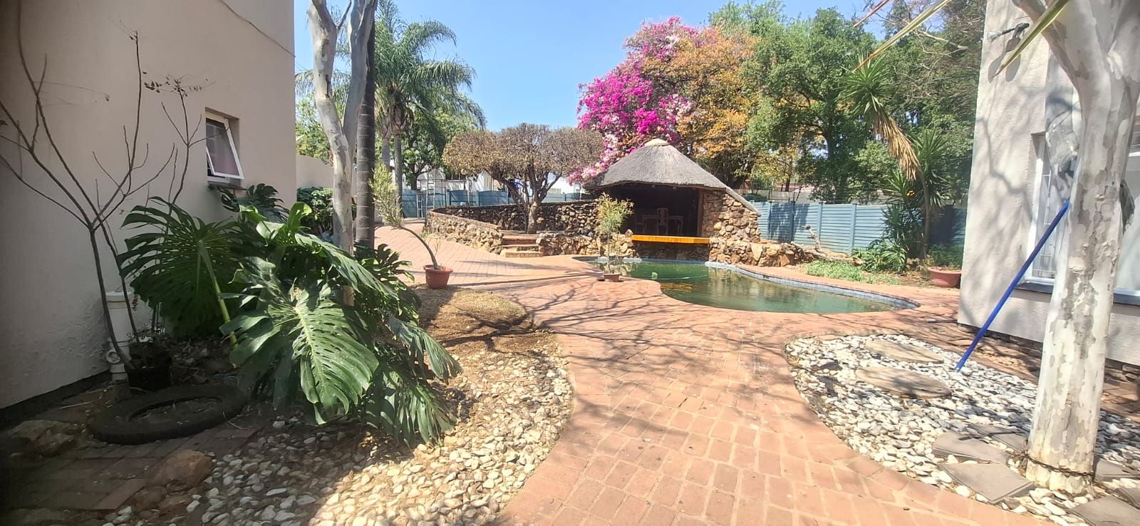 Outdoor living is equally impressive. The swimming pool, paired with a thatched lapa, sets the stage for family braais and celebrations. Parking is abundant with a double garage, carport, and caravan shelter, complemented by ample paved areas. Security is assured with a full alarm system and complete fencing. The low-maintenance garden and water tank add practicality and peace of mind.