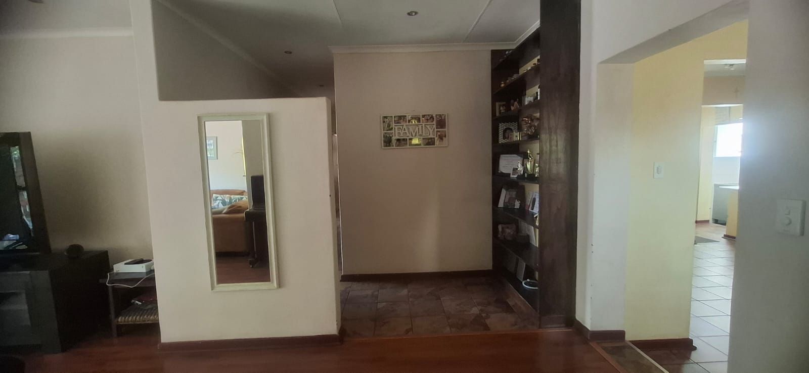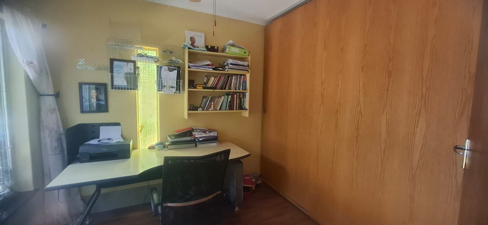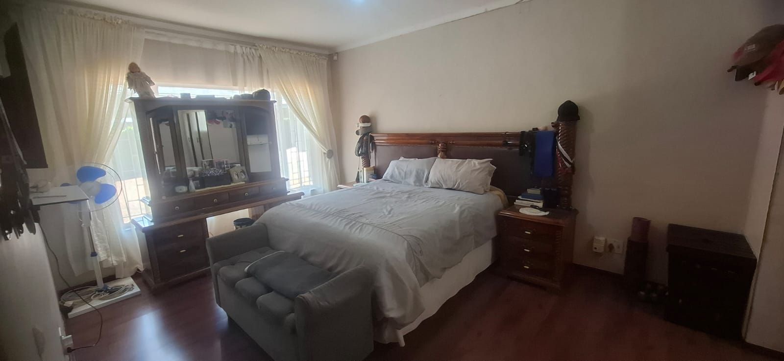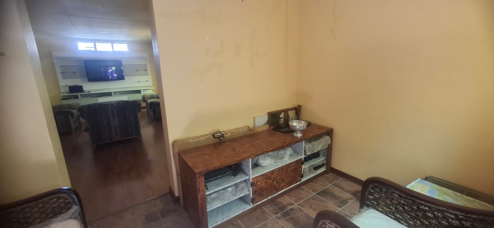 Outdoor living is equally impressive. The swimming pool, paired with a thatched lapa, sets the stage for family braais and celebrations. Parking is abundant with a double garage, carport, and caravan shelter, complemented by ample paved areas. Security is assured with a full alarm system and complete fencing. The low-maintenance garden and water tank add practicality and peace of mind.