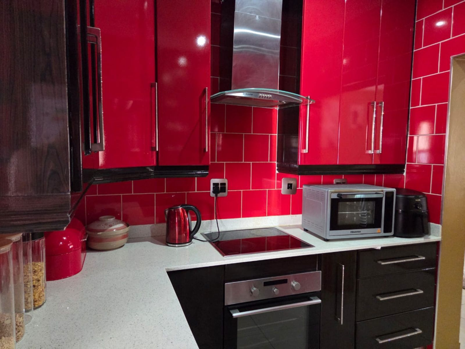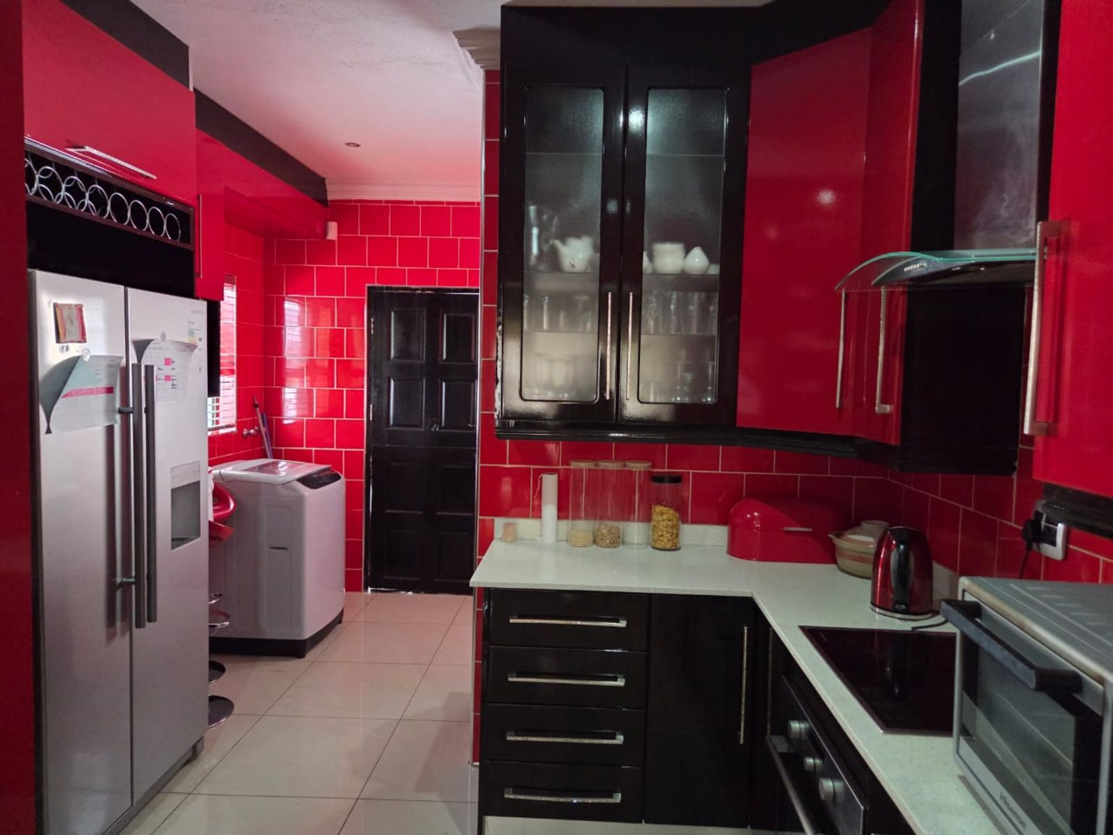 The living areas are designed for both entertaining and everyday comfort. A spacious dining room flows effortlessly into a welcoming living room, while the modern red kitchen is sure to impress with its bold design and separate scullery for added functionality.