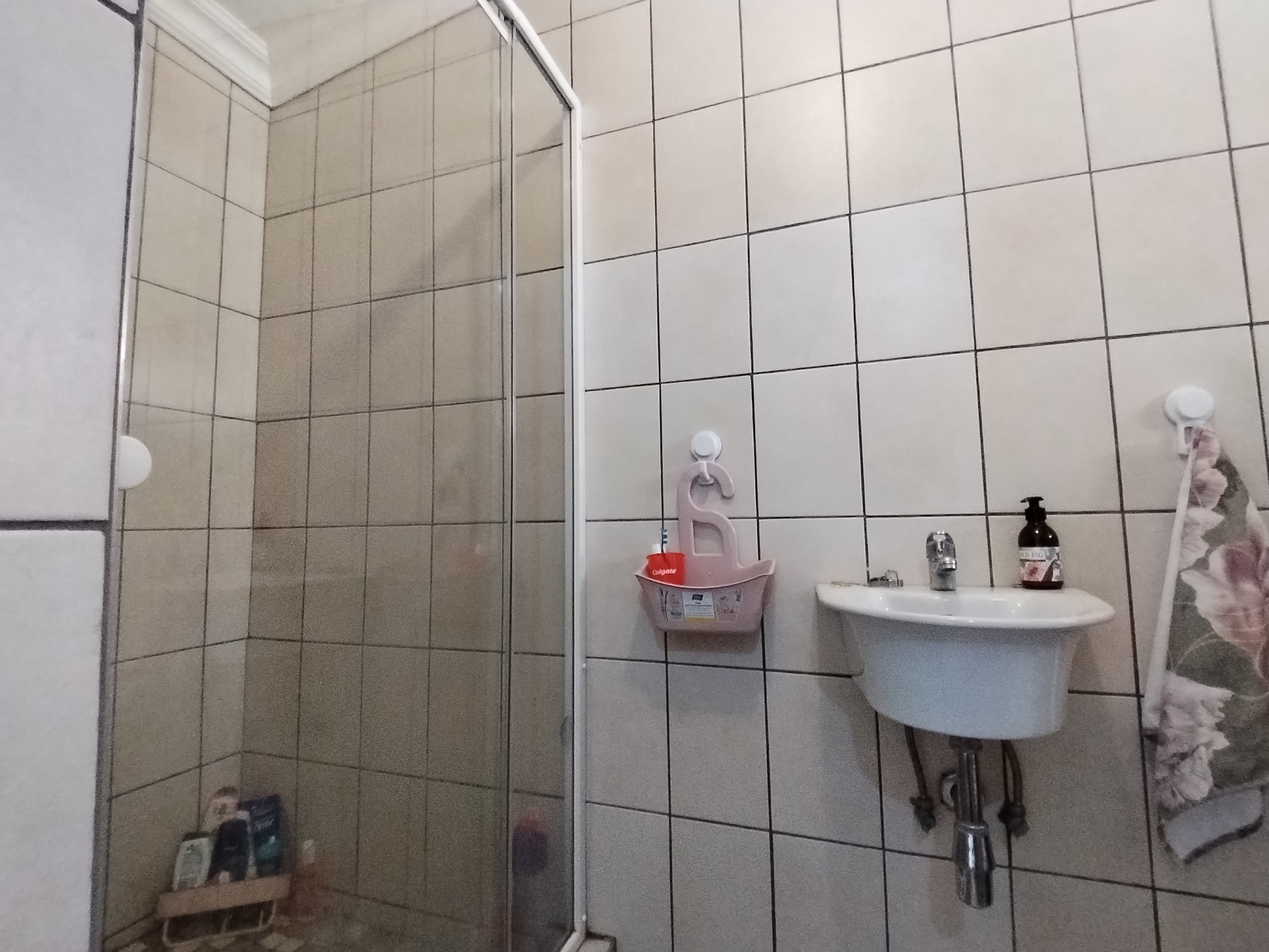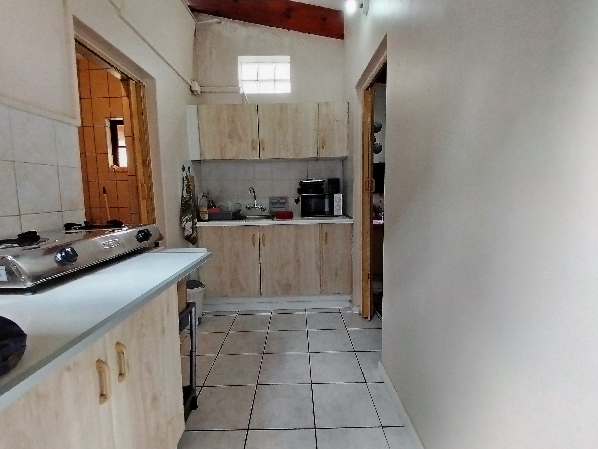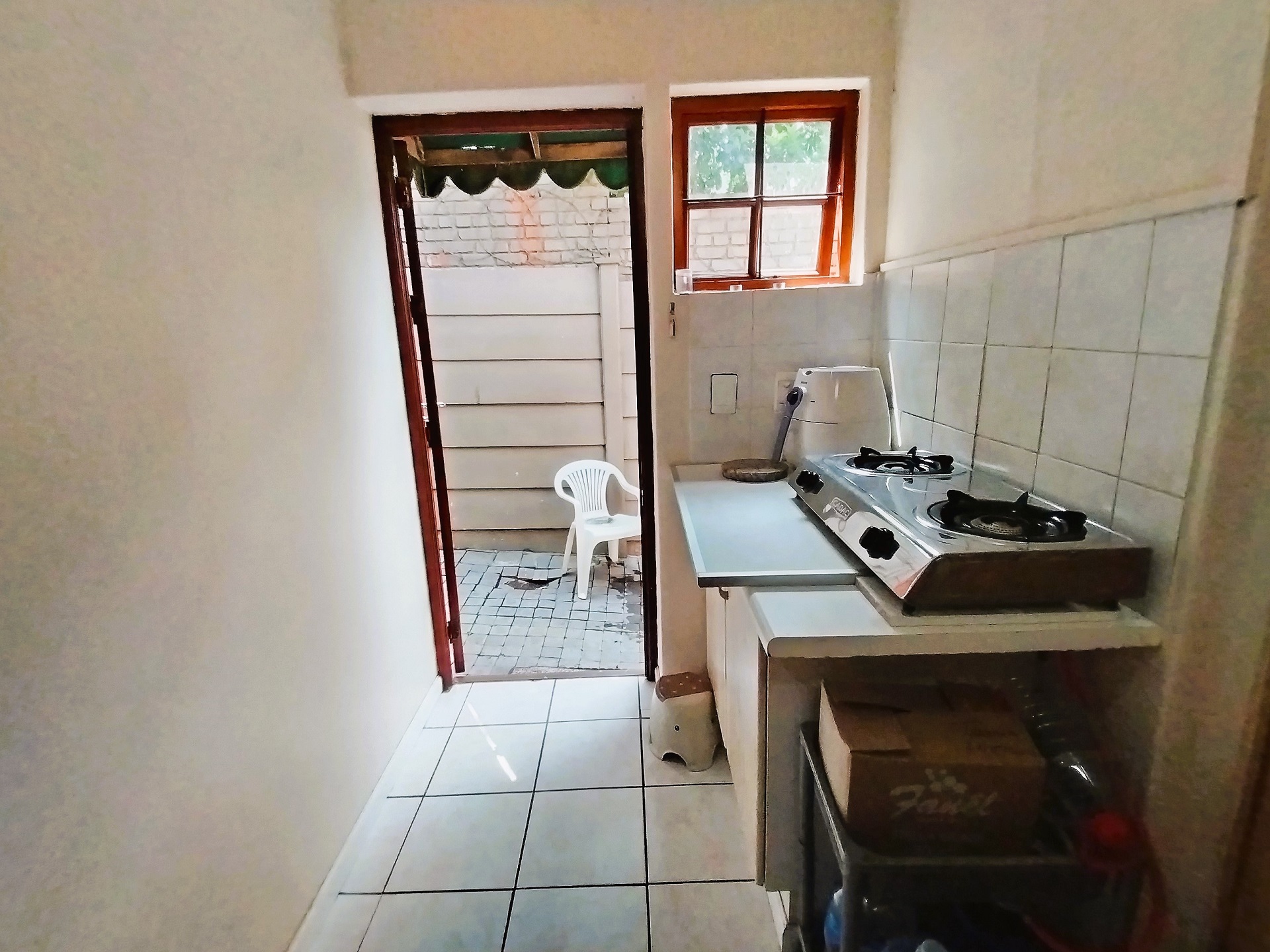 The kitchen is equipped with gas cooking facilities and all necessary appliances. The bathroom includes a shower, basin, and toilet. A separate bedroom features a single bed and ample cupboard space.