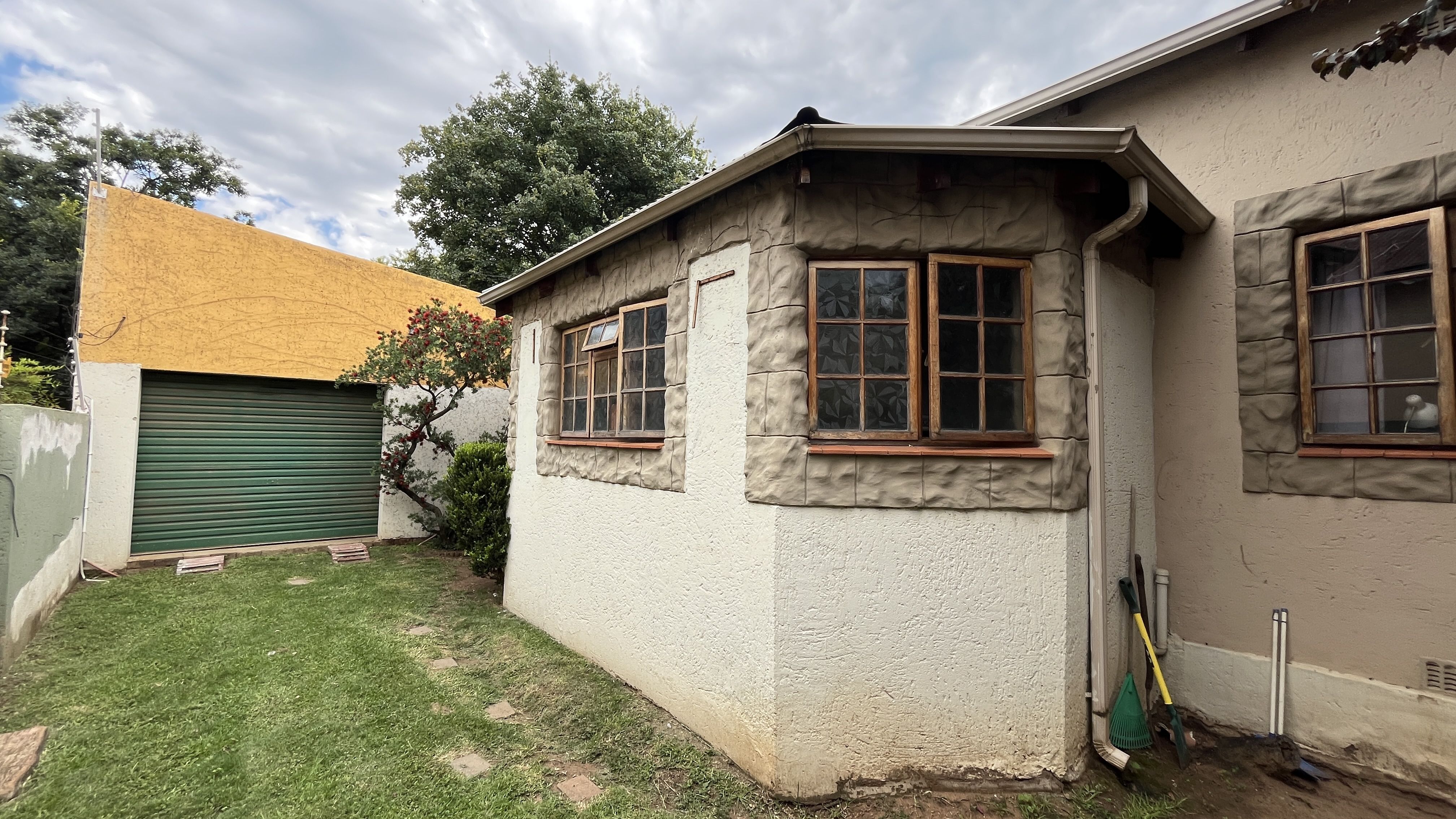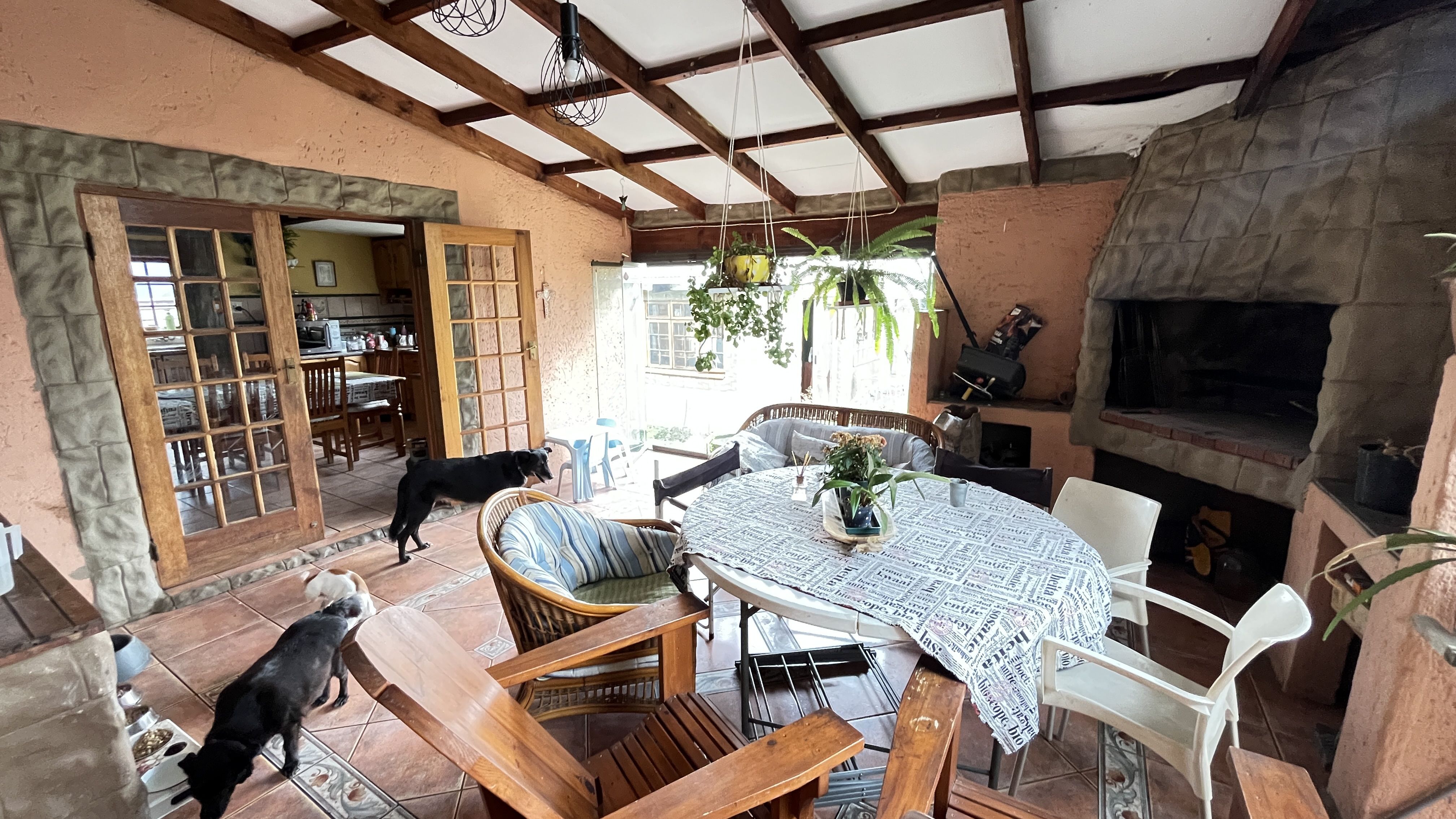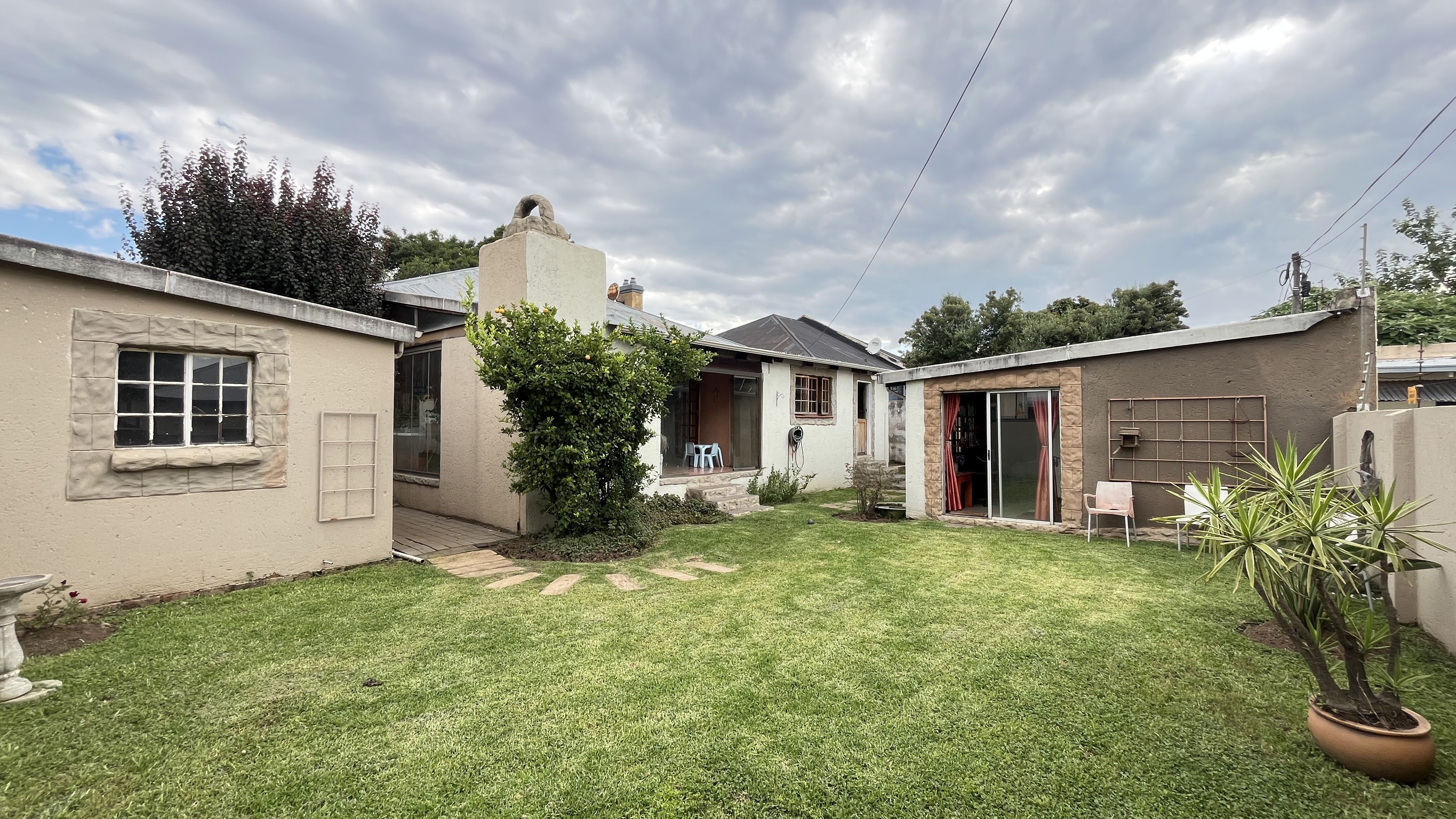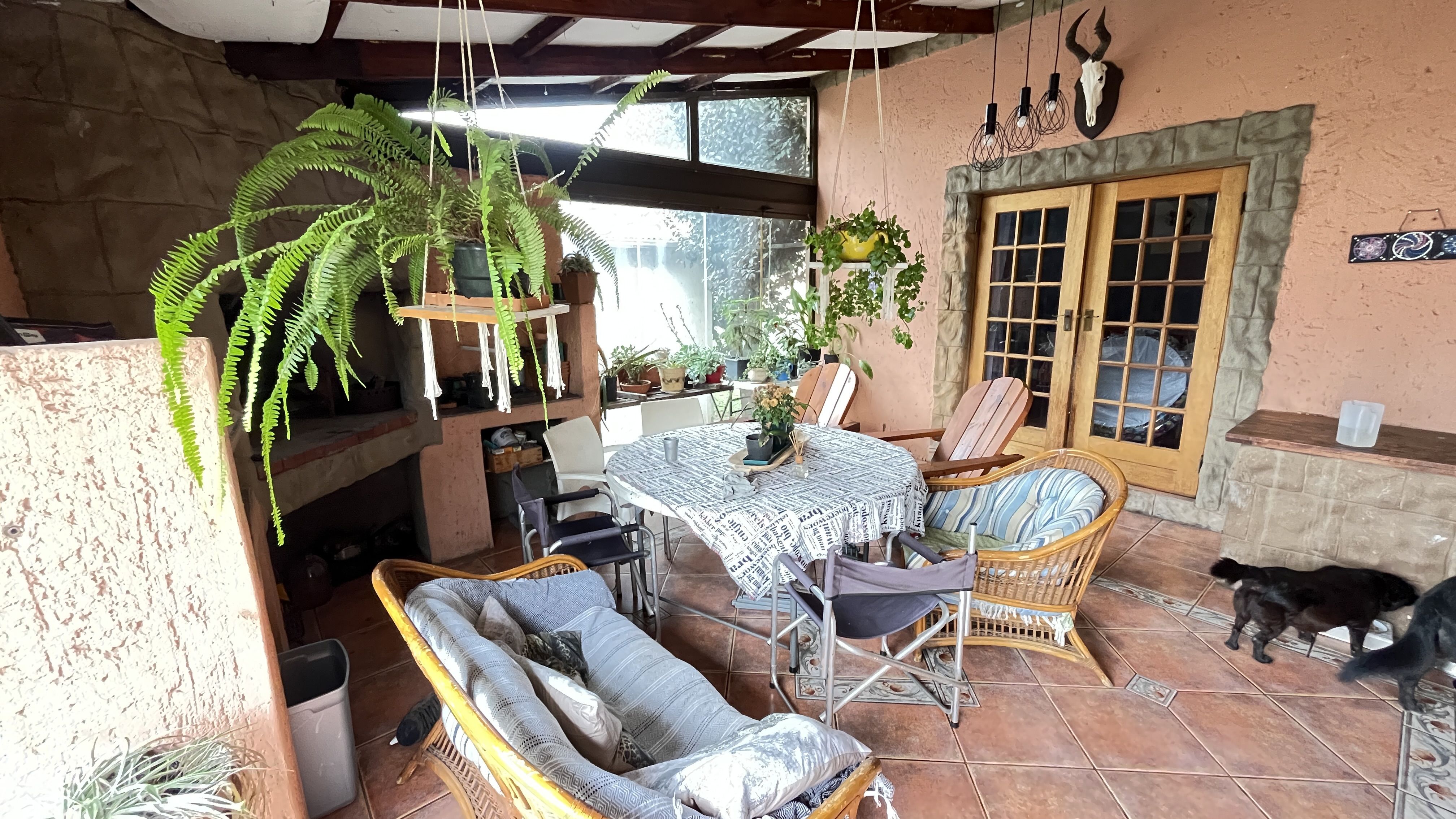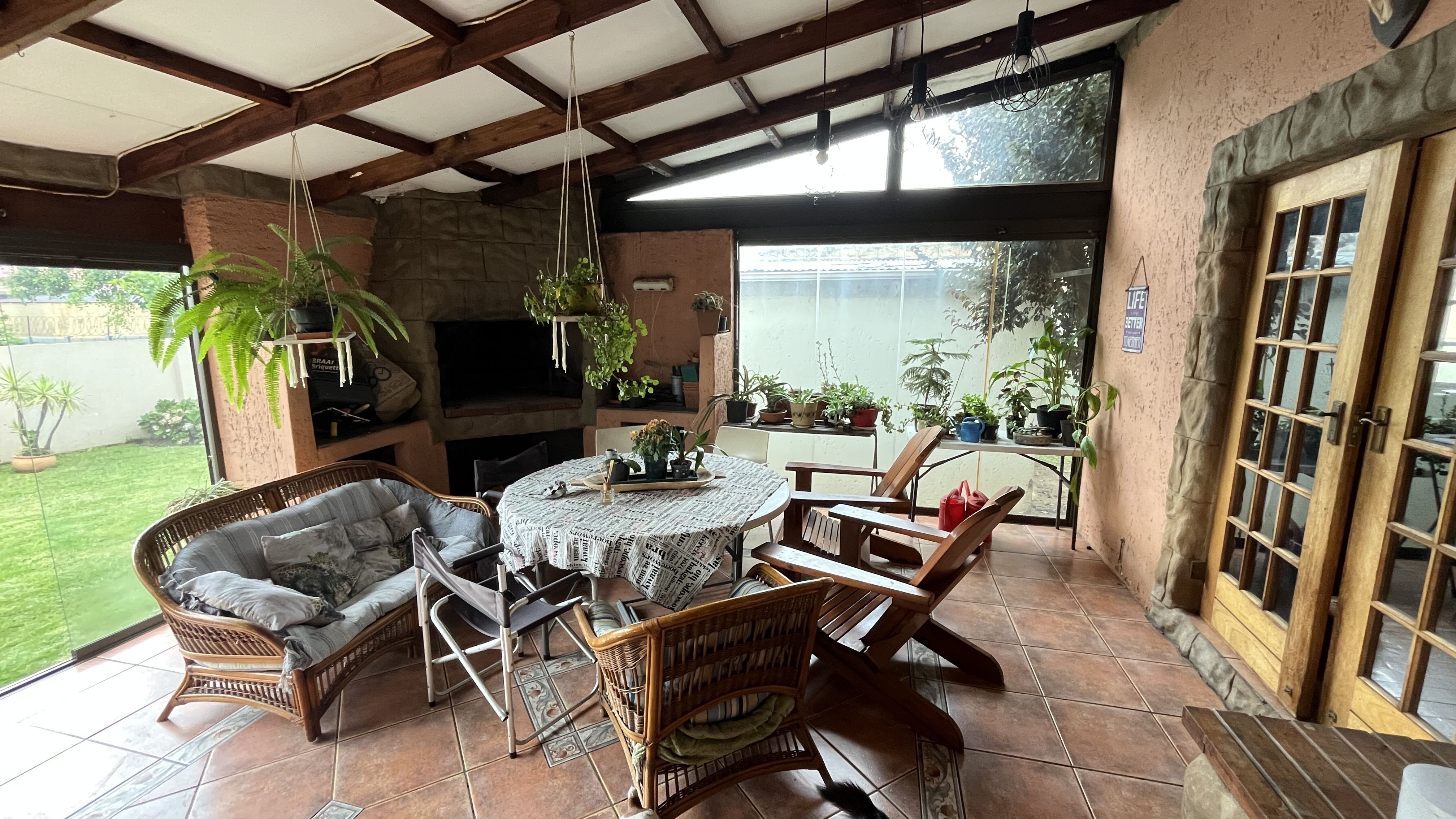 This enchanting retreat features a private main bedroom with en-suite bathroom and a second bedroom opening onto an enclosed entertainers' patio, perfect for gatherings or relaxation. The lounge and dining room each have a fireplace, with Oregon wooden floors adding warmth and romance. The tiled kitchen and bathrooms balance charm with practicality, while stone archways and French wooden doors add old-world elegance. A separate scullery leads to the back garden, enhancing the home's rustic appeal. The entertainment patio has a built-in braai and fireplace, ideal for dining or cozy evenings. A 1 bedroom student pad offers a lounge, stable-door entrance, and private bathroom, perfect for guests or a retreat. With three garages and parking for up to five cars, this home combines charm and convenience, ideal for those seeking a peaceful, romantic haven. Call today for an exclusive viewing.