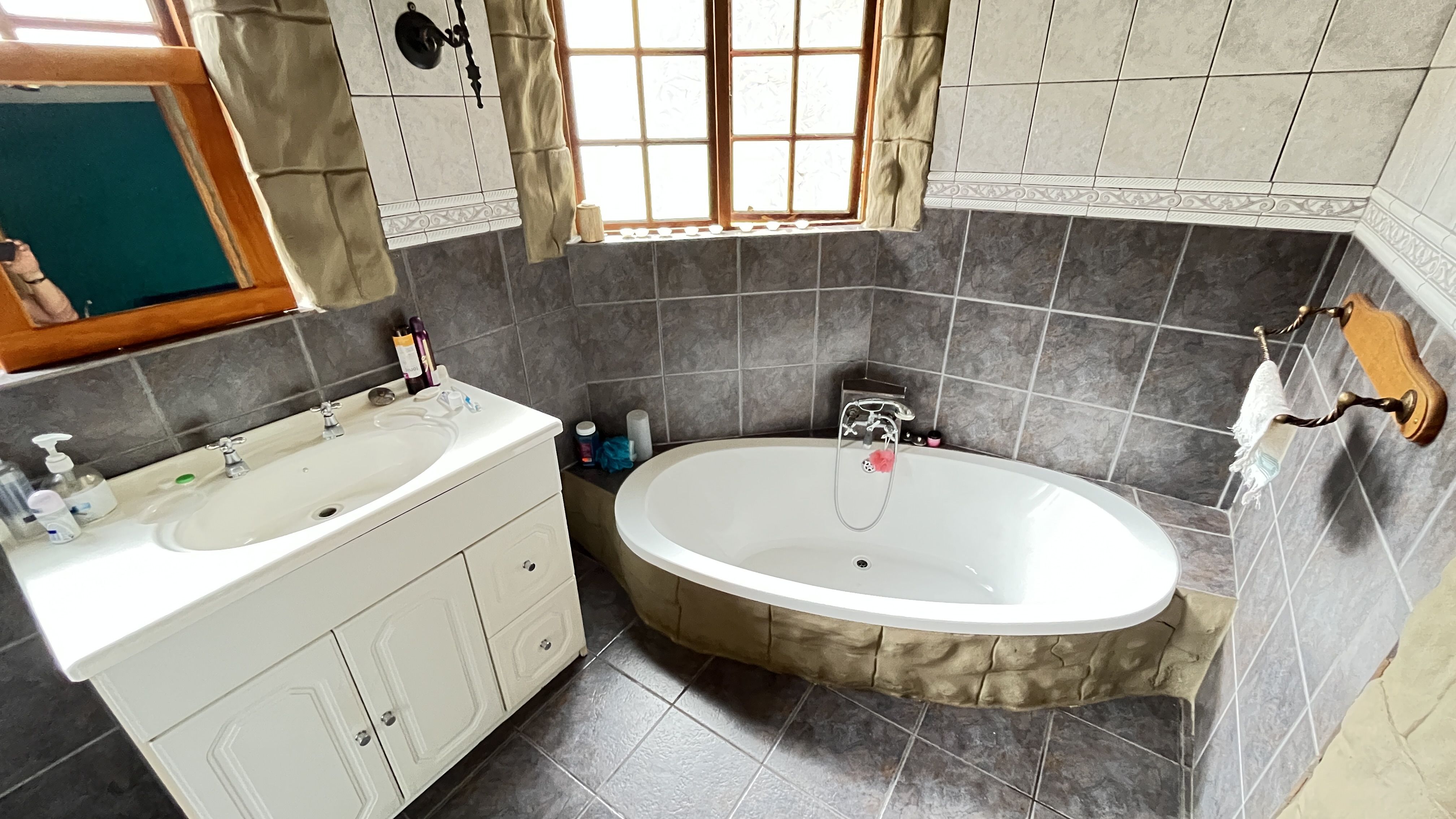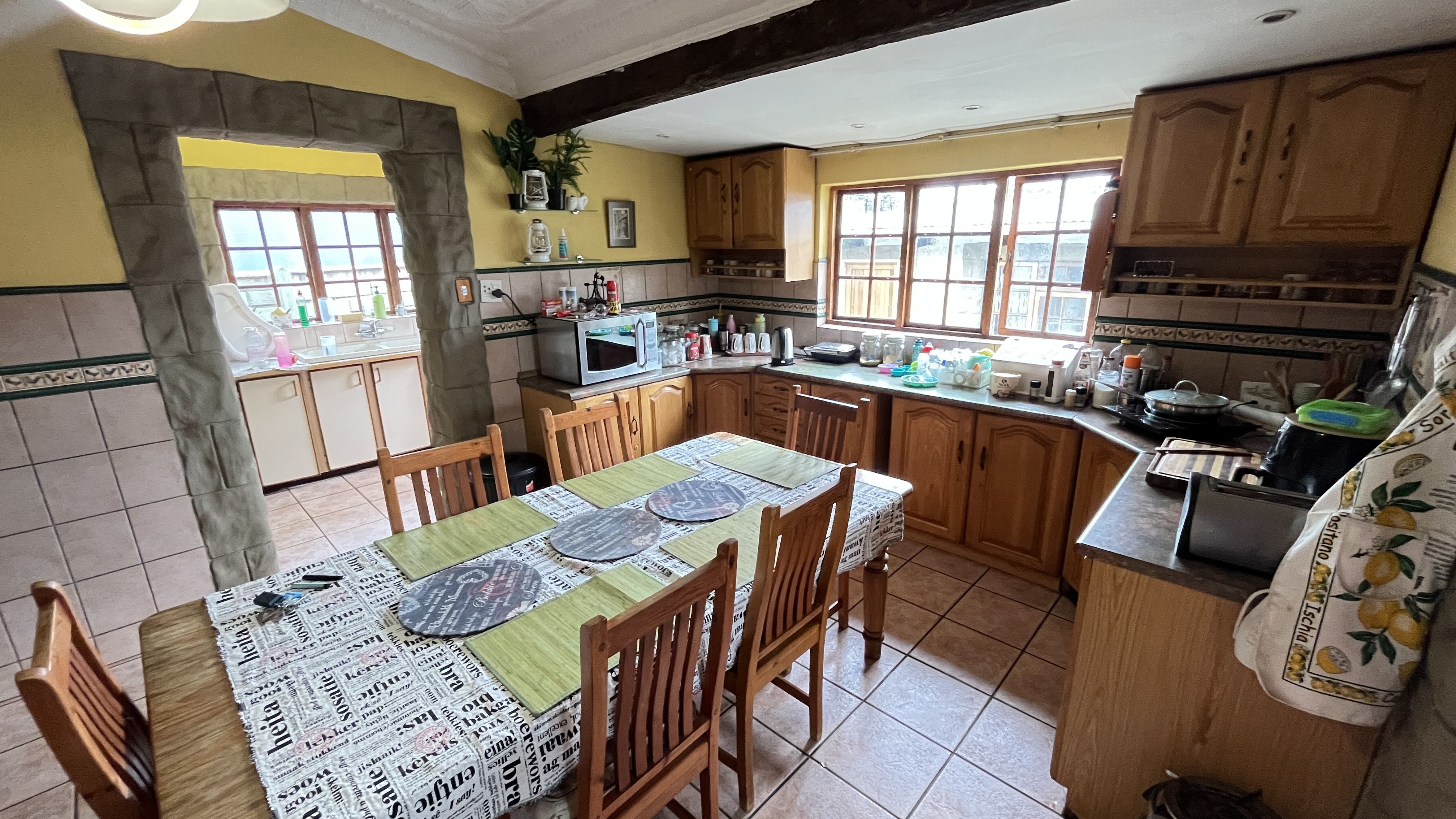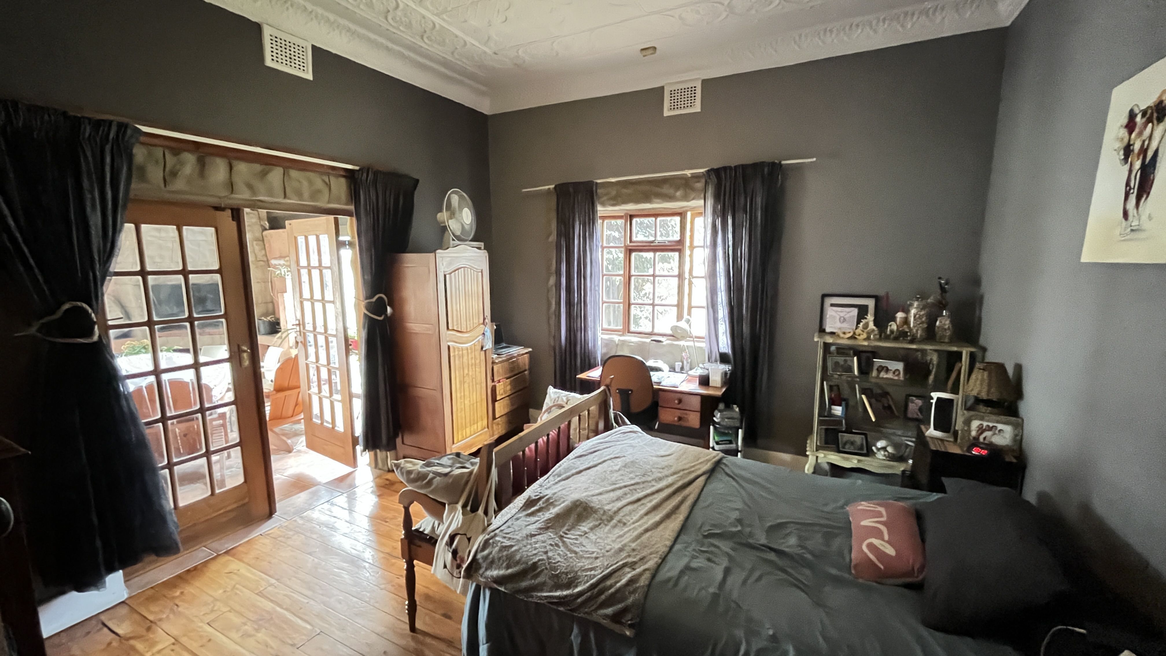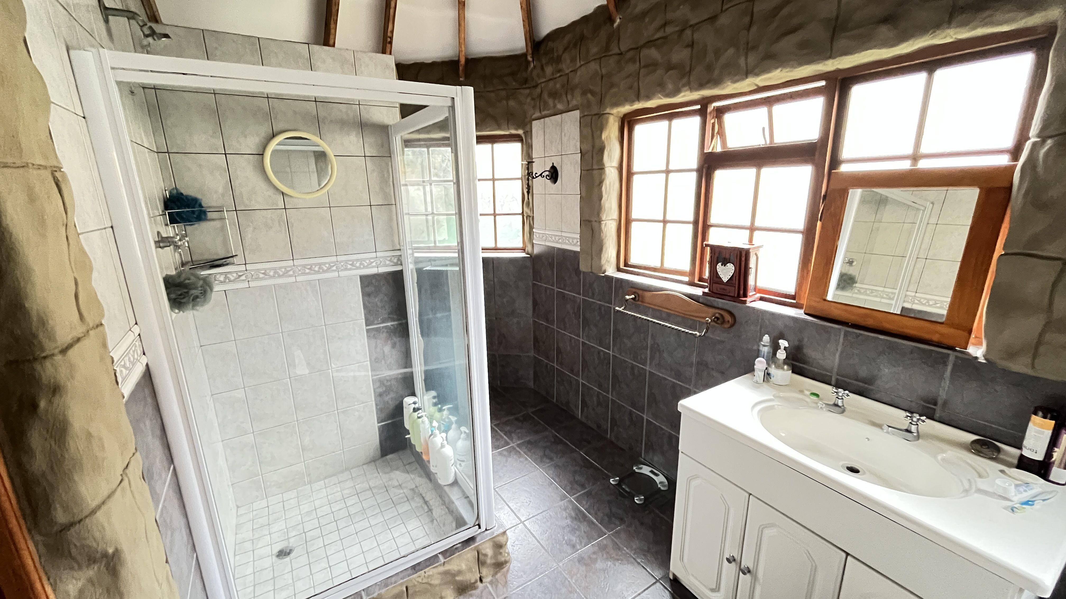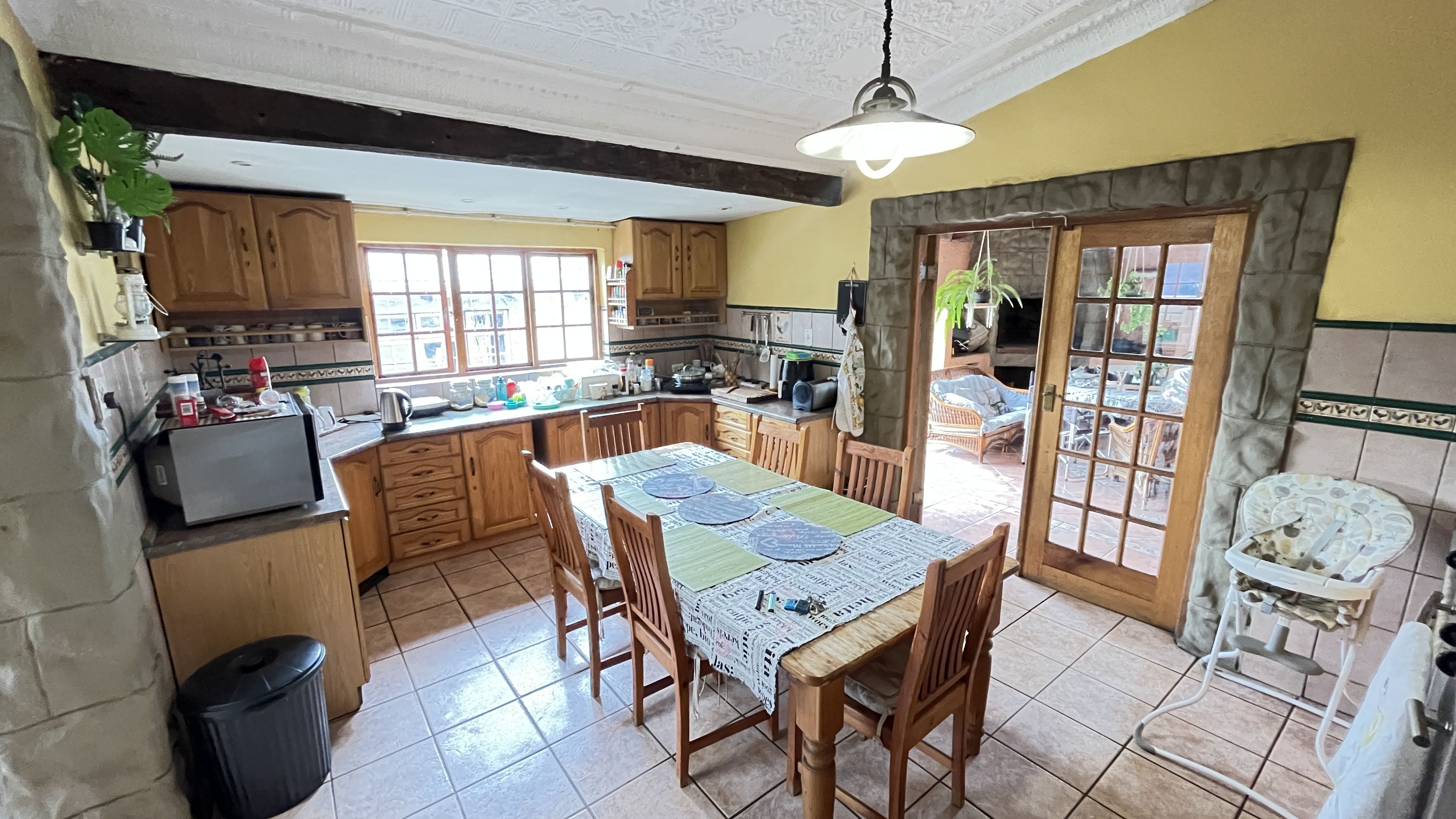This enchanting retreat features a private main bedroom with en-suite bathroom and a second bedroom opening onto an enclosed entertainers' patio, perfect for gatherings or relaxation. The lounge and dining room each have a fireplace, with Oregon wooden floors adding warmth and romance. The tiled kitchen and bathrooms balance charm with practicality, while stone archways and French wooden doors add old-world elegance. A separate scullery leads to the back garden, enhancing the home's rustic appeal. The entertainment patio has a built-in braai and fireplace, ideal for dining or cozy evenings. A 1 bedroom student pad offers a lounge, stable-door entrance, and private bathroom, perfect for guests or a retreat. With three garages and parking for up to five cars, this home combines charm and convenience, ideal for those seeking a peaceful, romantic haven. Call today for an exclusive viewing.