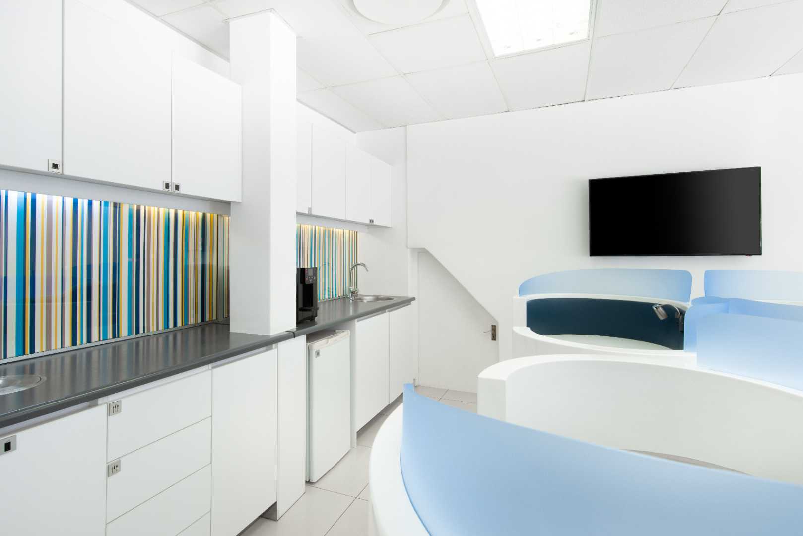 Enjoy colourful interiors and clean, simple spaces – this stylishly designed building offers a great change of scene for clients and visitors. When you need to step outside, the area is awash with restaurants, cafes and gyms; perfect for after work.