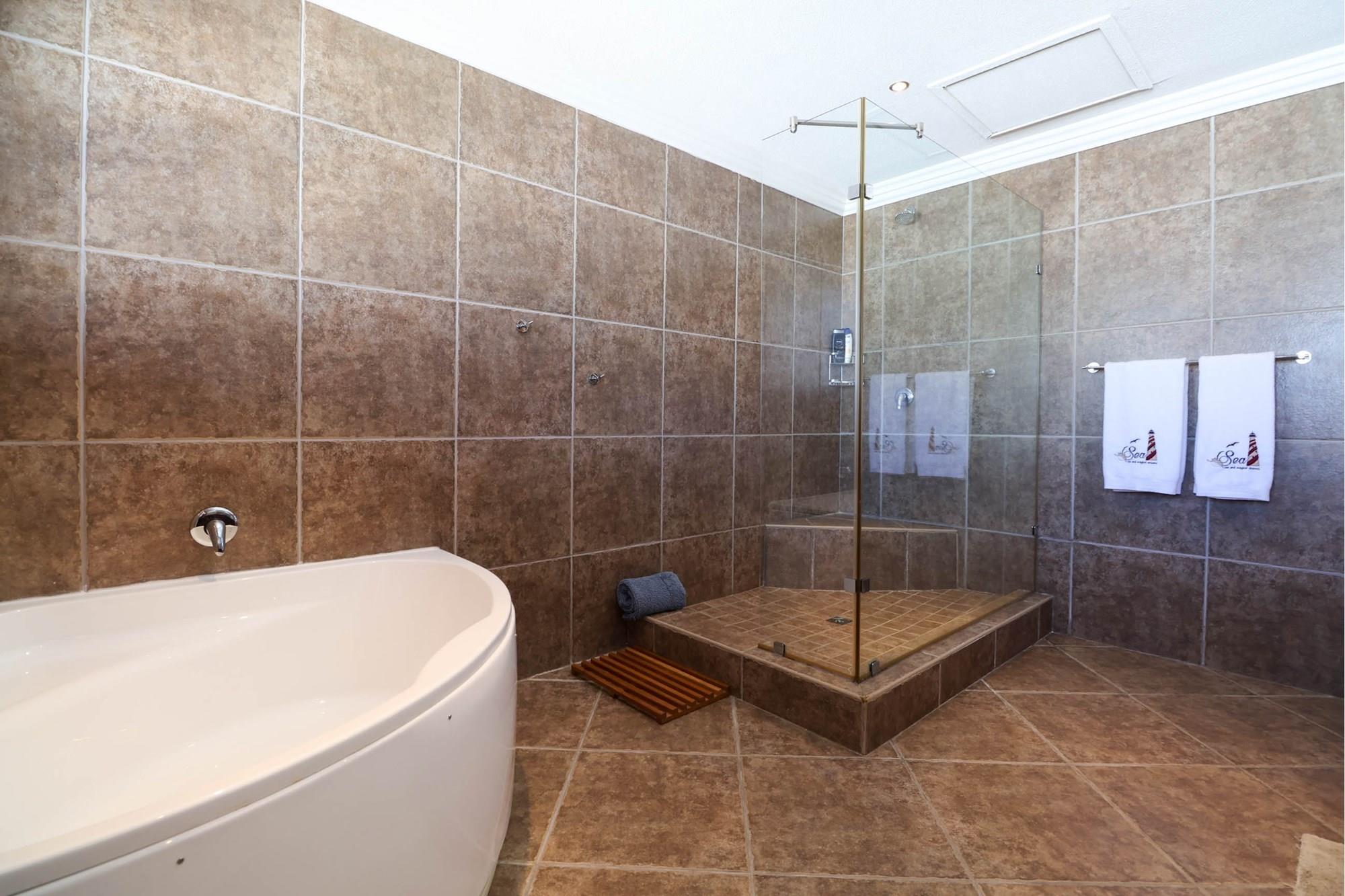Ascending the staircase, a realm of tranquillity awaits on the upper level, where six bedrooms offer respite and rejuvenation. The main bedroom is a sanctuary unto itself, exceptionally spacious and adorned with a large en-suite that boasts a shower and bathtub of grand proportions. His and her washbasins, a toilet, bidet, and a walk-in closet ensure that every need is met with elegance and style. Floor-to-ceiling aluminium sliding folding stack glass doors open onto a covered balcony, inviting in the gentle caress of the breeze and framing panoramic views beyond. For privacy, complete folding shutters and blinds stand ready to cocoon the space in serenity. An air conditioner ensures comfort year-round. Thesecond bedroom boasts a full en-suite and its own balcony, while the remaining four generously sized bedrooms share a third large full bathroom, ensuring that every guest is treated to comfort and luxury.