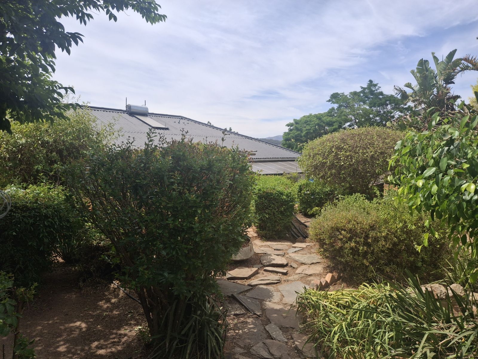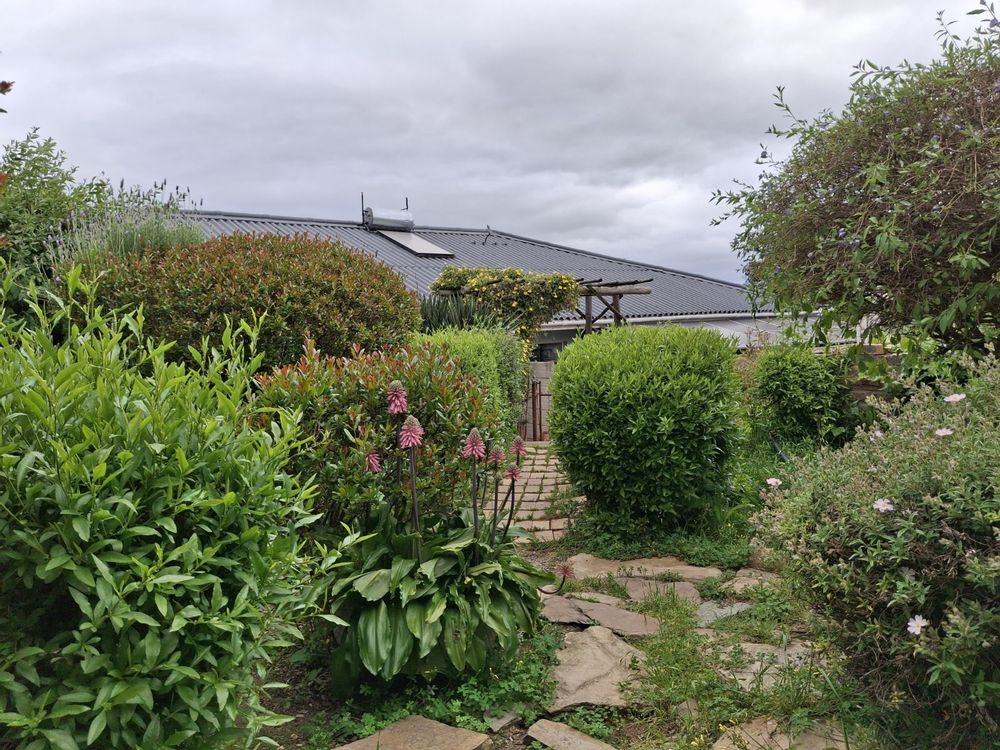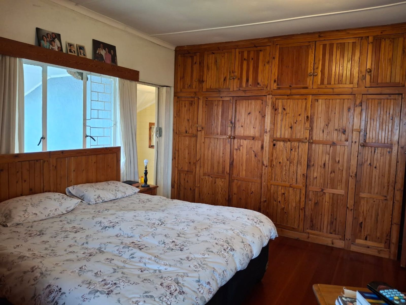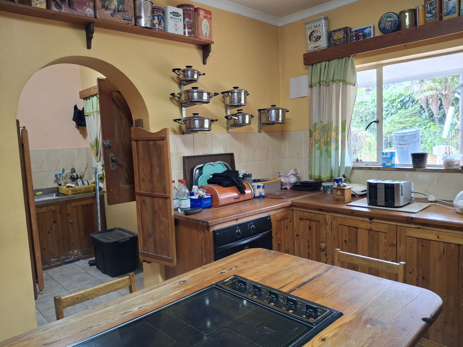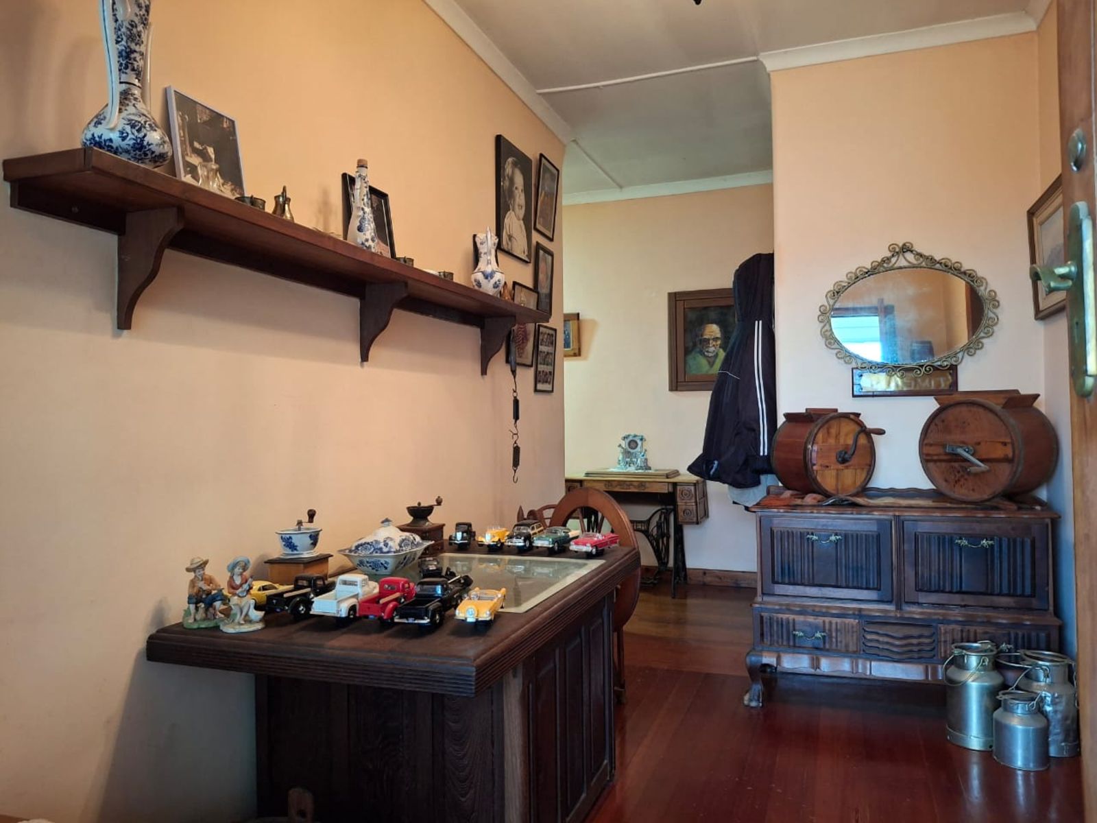The main house is approximately 286m2 and features three bedrooms and two bathrooms, including a main en-suite and a family bathroom with separate toilet. The home boasts beautiful original Oregon wood flooring, skirtings and cupboards in the main and third bedrooms, the kitchen and throughout the living areas, adding warmth and character. Only the second bedroom and linen cupboard are not Oregon wood. A welcoming reception area leads into the lounge, where large windows frame stunning garden and town views. The cosy braai room is fitted with a Dover stove and opens onto a balcony overlooking the garden. The dining area flows into a spacious kitchen with Oregon cupboards, a centre island with stove plates, an undercounter oven and a separate scullery and laundry.