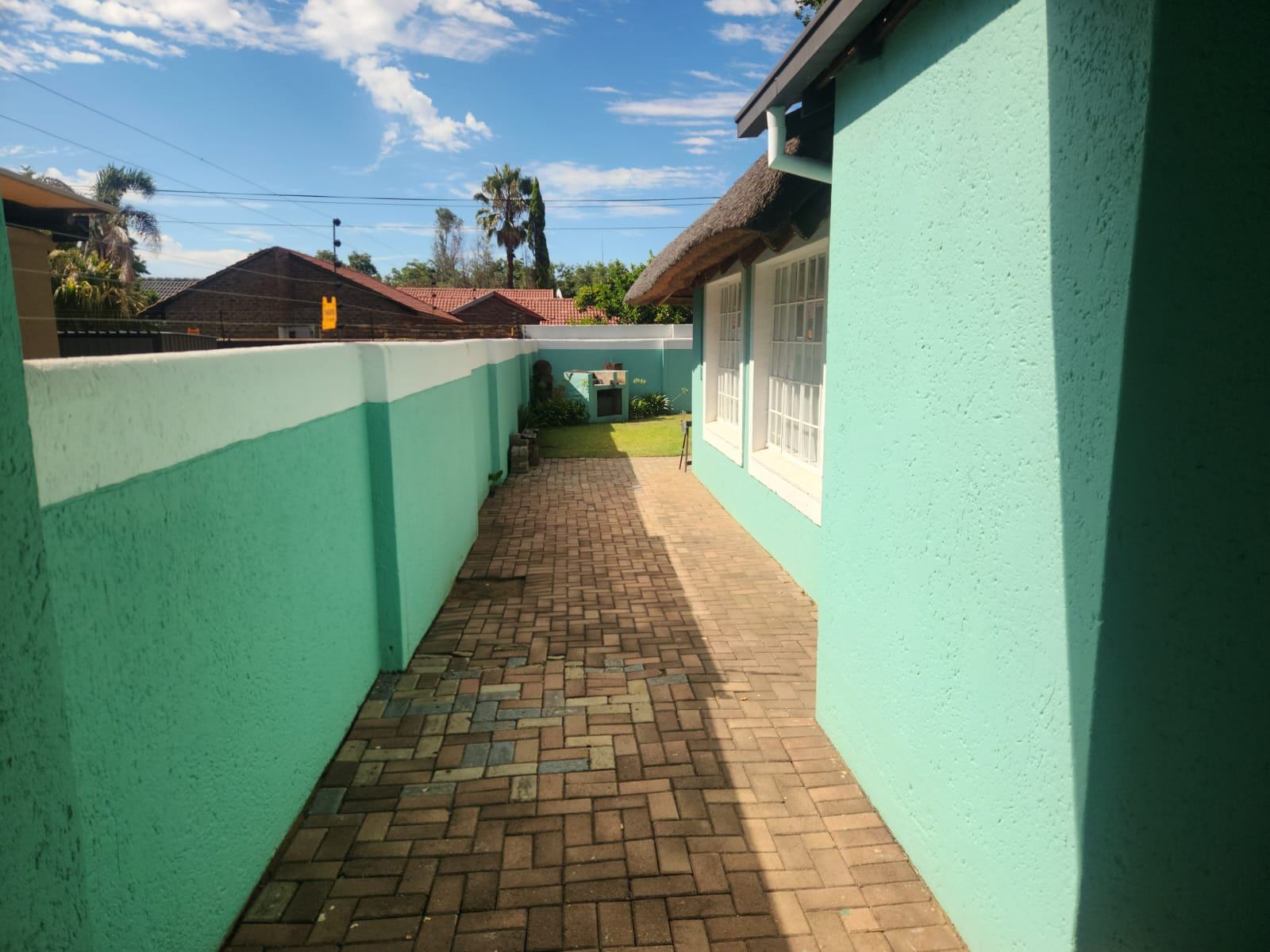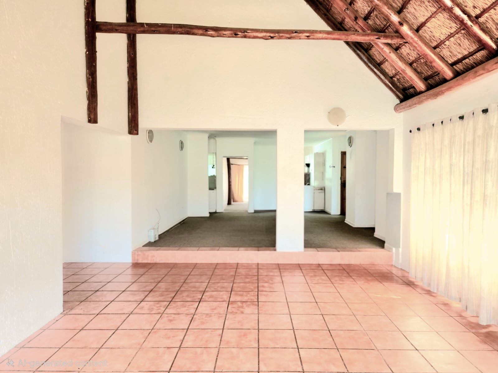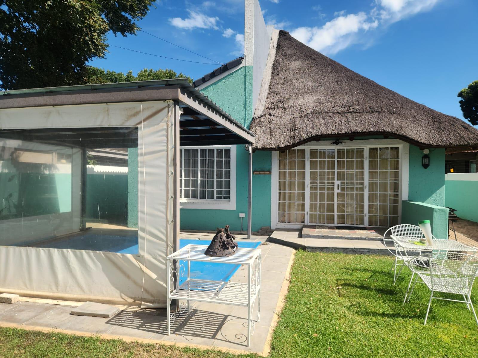 This single-storey, freestanding residence boasts a generous 257 m2 under its distinctive thatch roof, gracefully situated on a 525 m2 erf. The classic plaster exterior and charming cottage aesthetic are easily accessible from a level road, offering immediate curb appeal and a warm welcome.