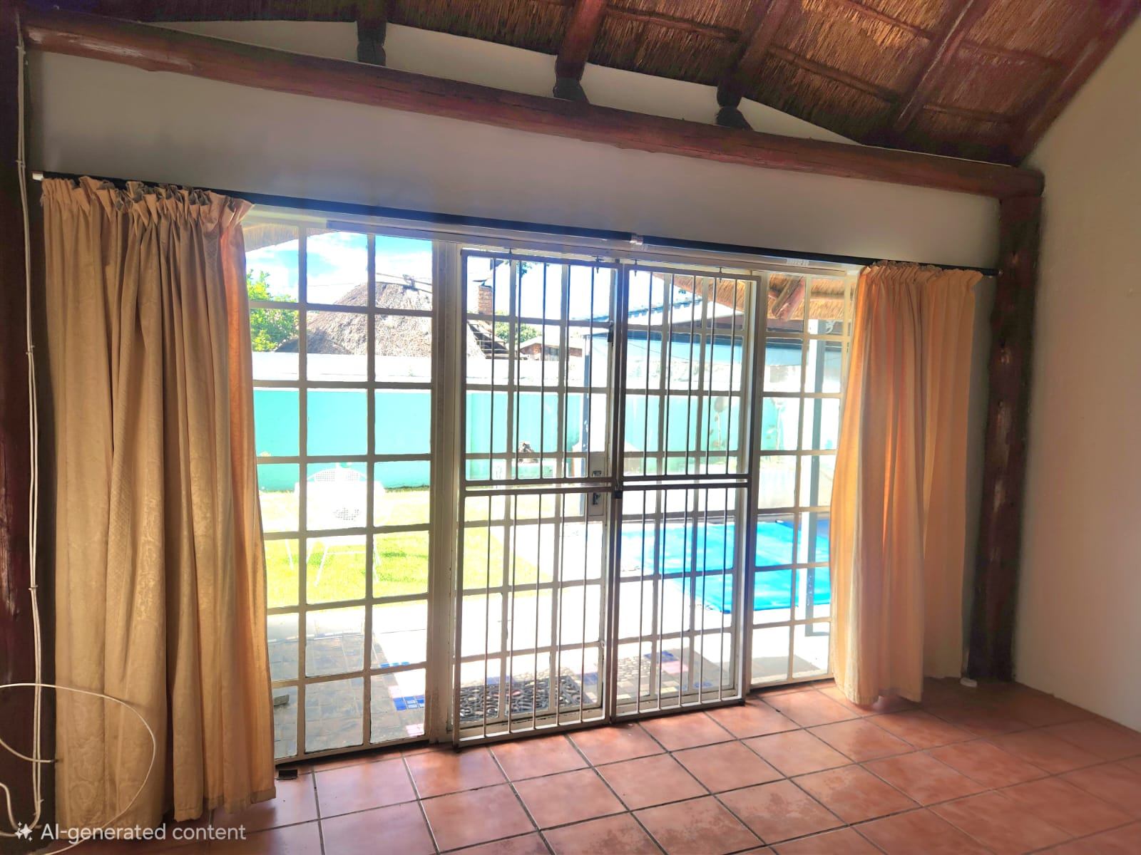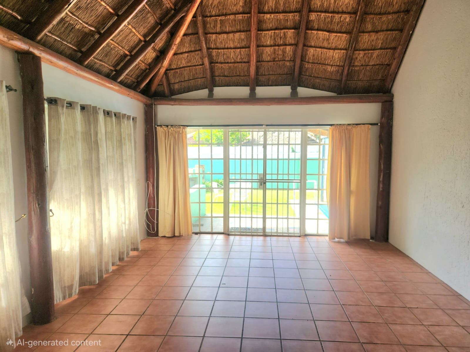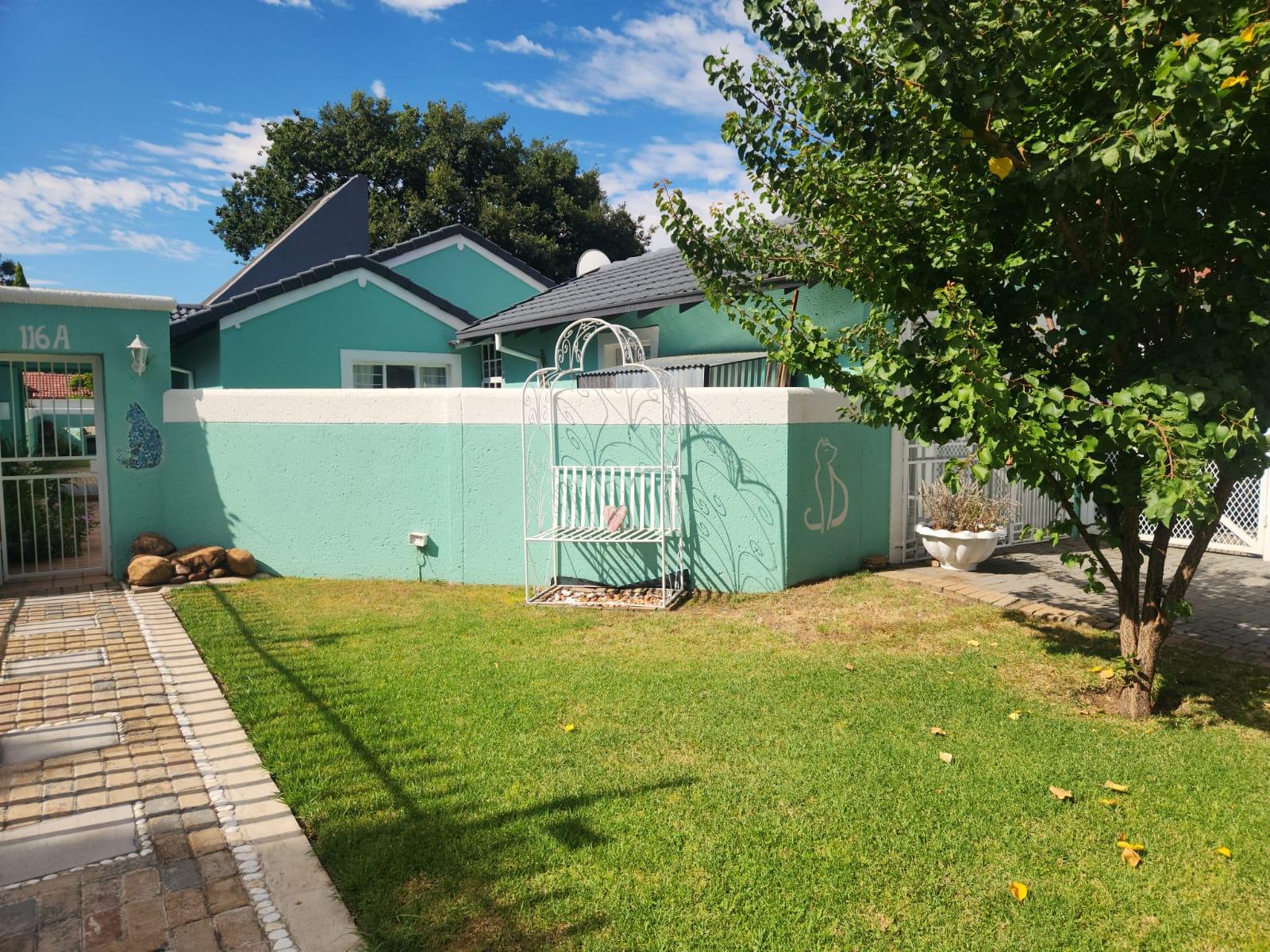 This single-storey, freestanding residence boasts a generous 257 m2 under its distinctive thatch roof, gracefully situated on a 525 m2 erf. The classic plaster exterior and charming cottage aesthetic are easily accessible from a level road, offering immediate curb appeal and a warm welcome.