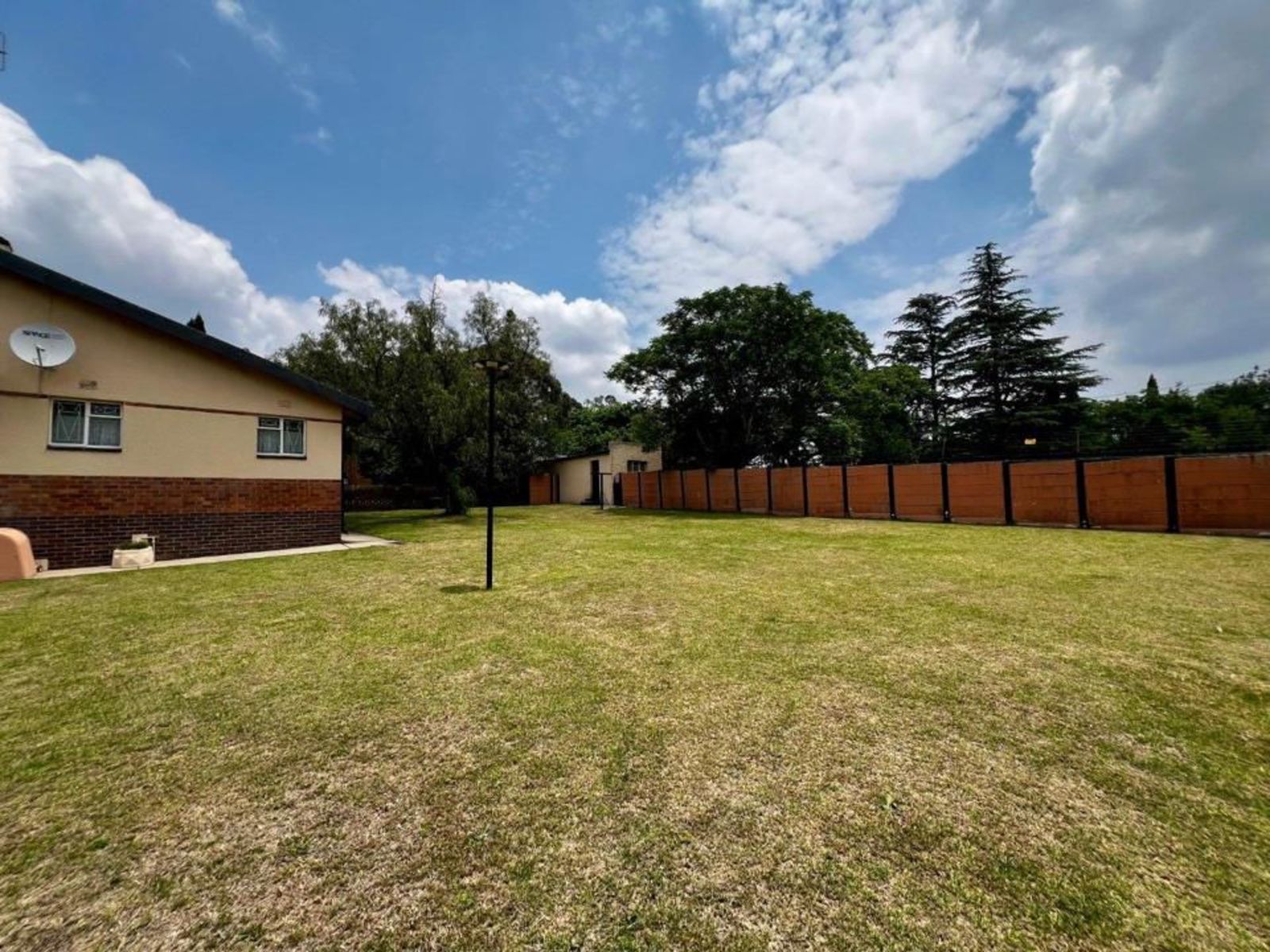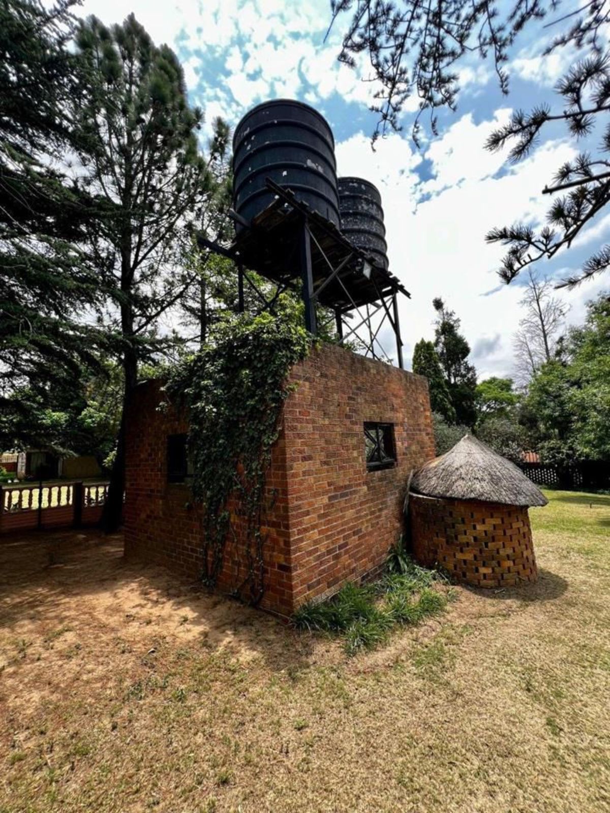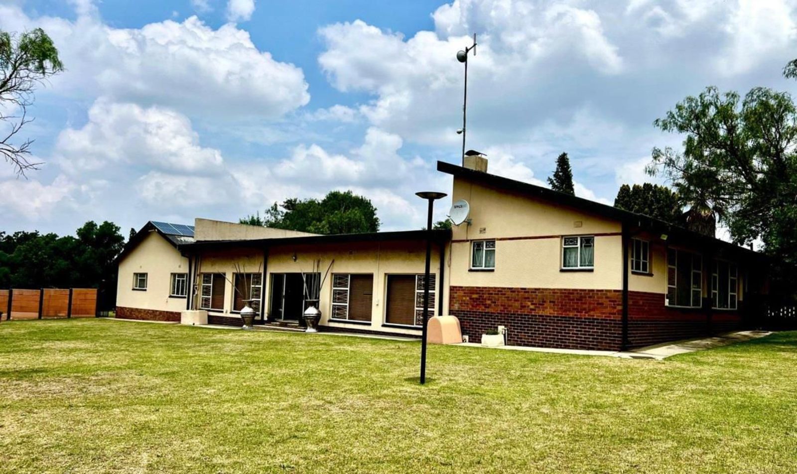 Practical features include a borehole with two tanks, a septic tank, and an 8 kW solar system, ensuring reliable daily operations. The five-car garage provides ample parking and storage. The backyard is divided into an entertainment area and an open section suitable for grazing animals or agricultural use, with the borehole feeding a man-made concrete dam for water distribution.