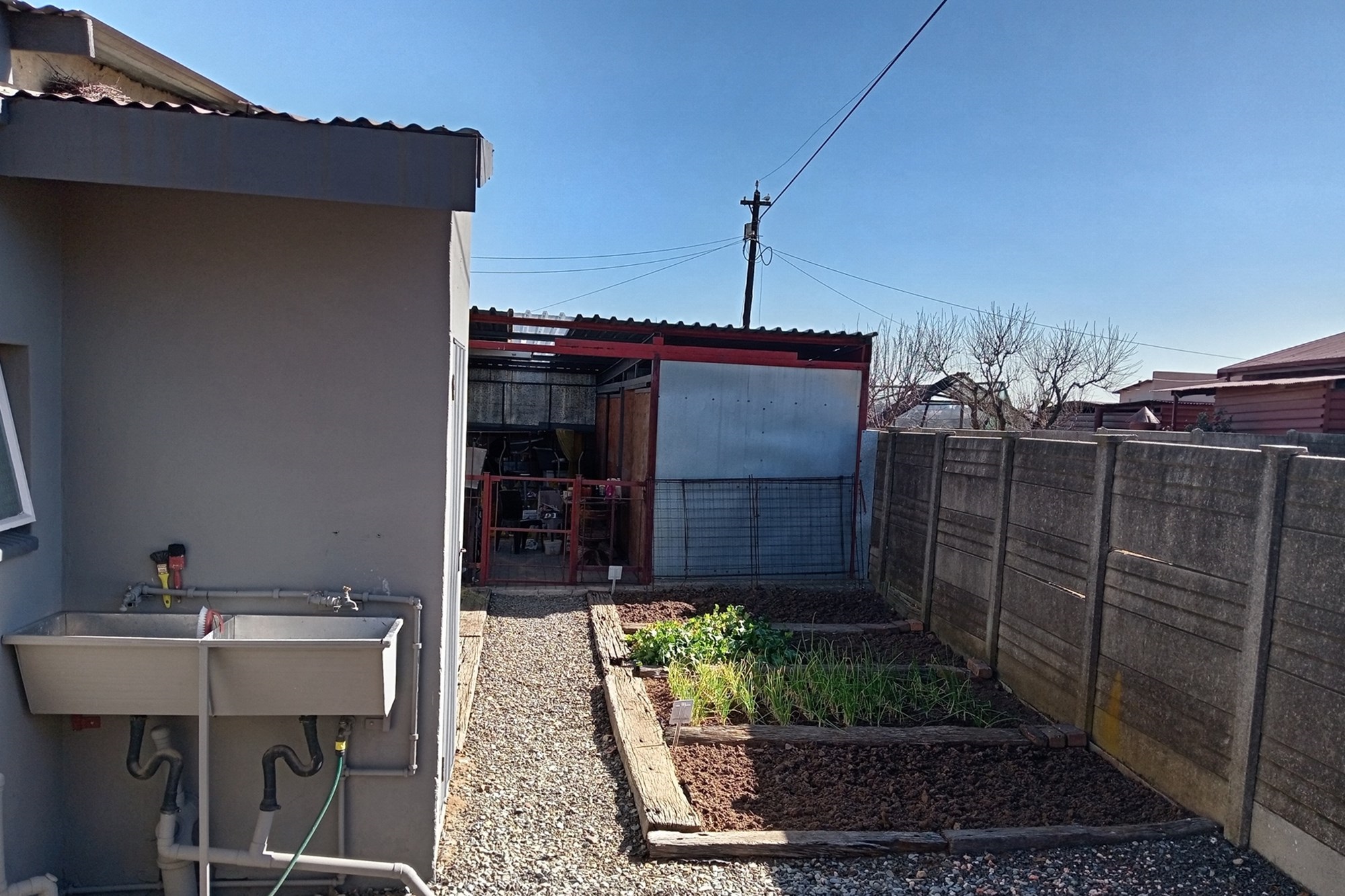 Vegetable garden near the garage, plus an outdoor toilet for practicality.