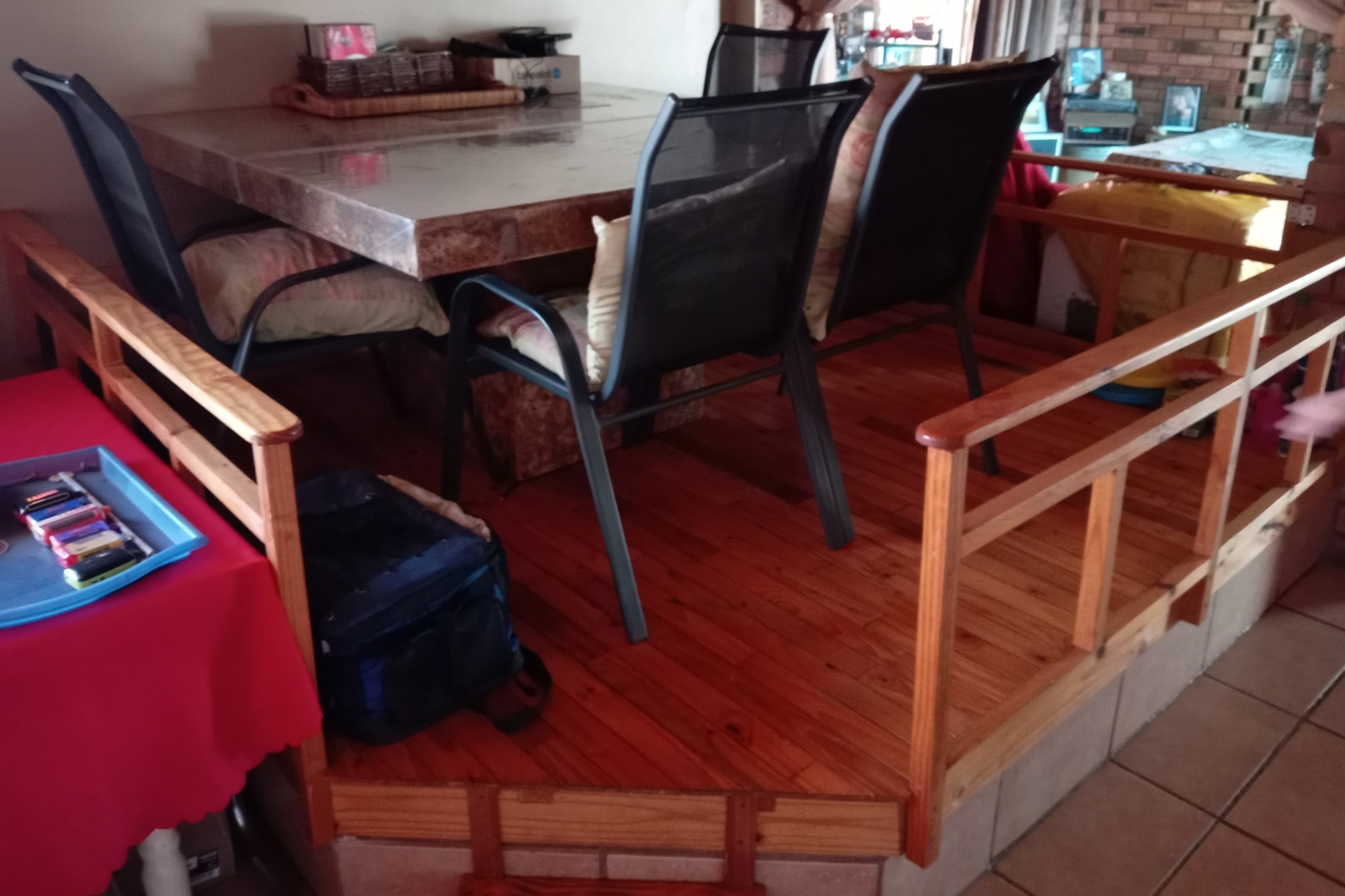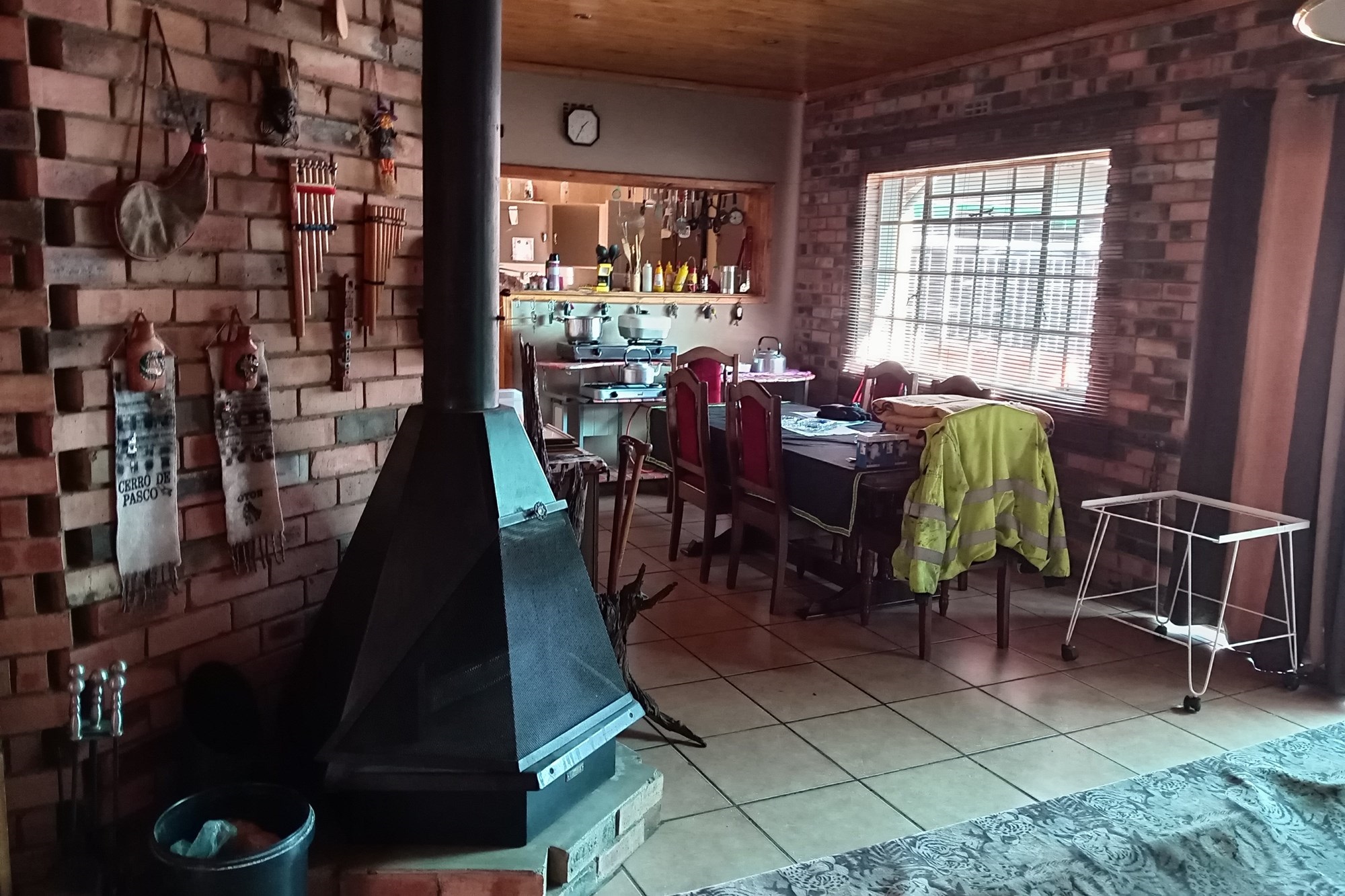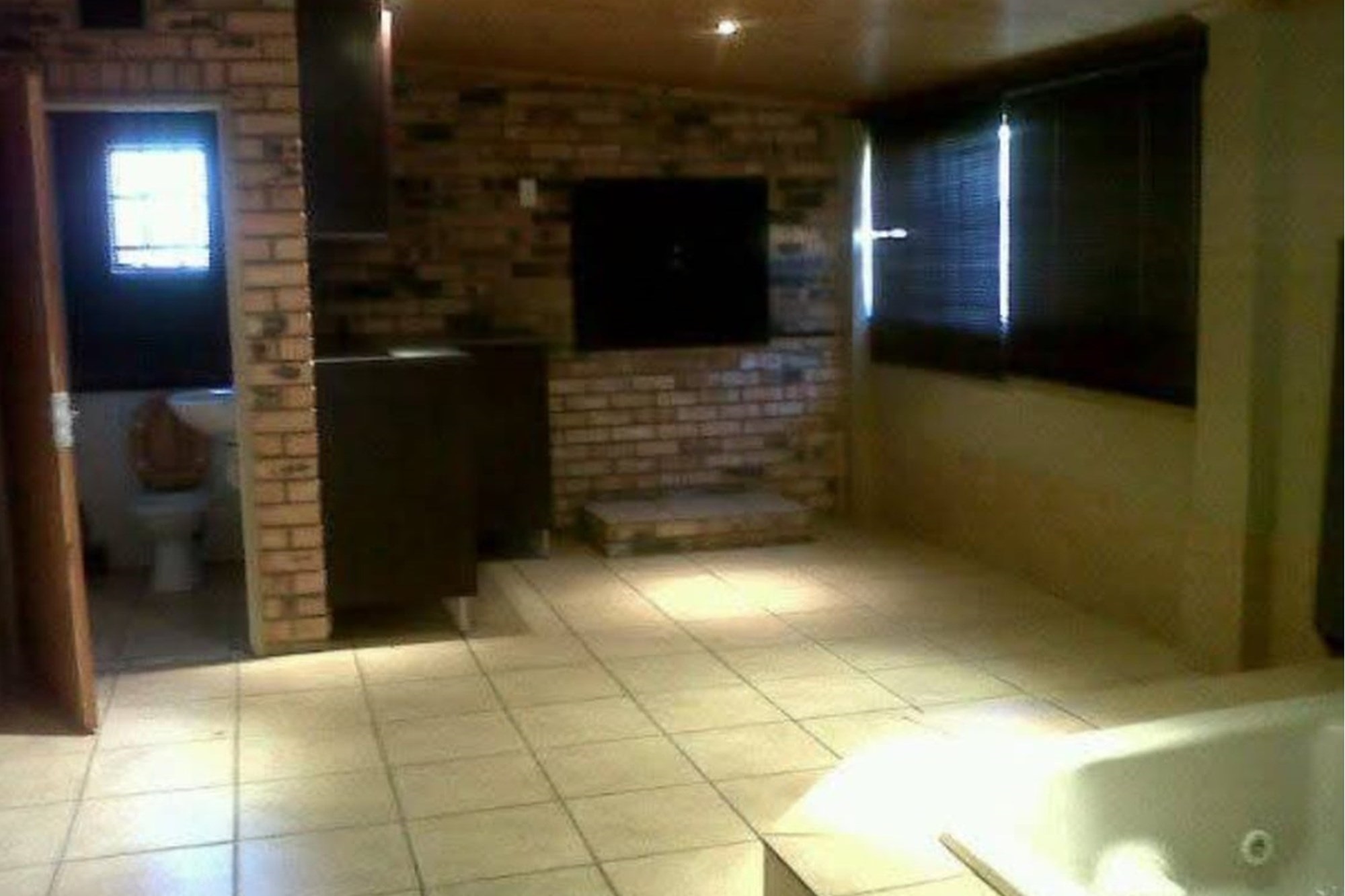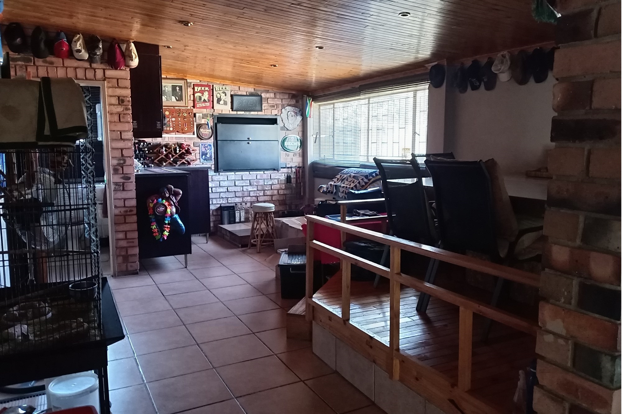 An expansive indoor entertainment area with built-in braai, fireplace, and a jacuzzi with deck that can cover it—perfect for social gatherings or guest leisure.