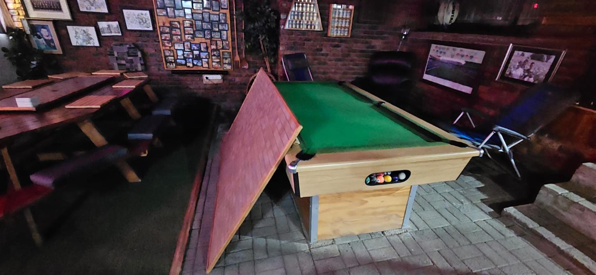 Expansive entertainment area with a custom wooden table, seating, and pool table (convertible to dining).