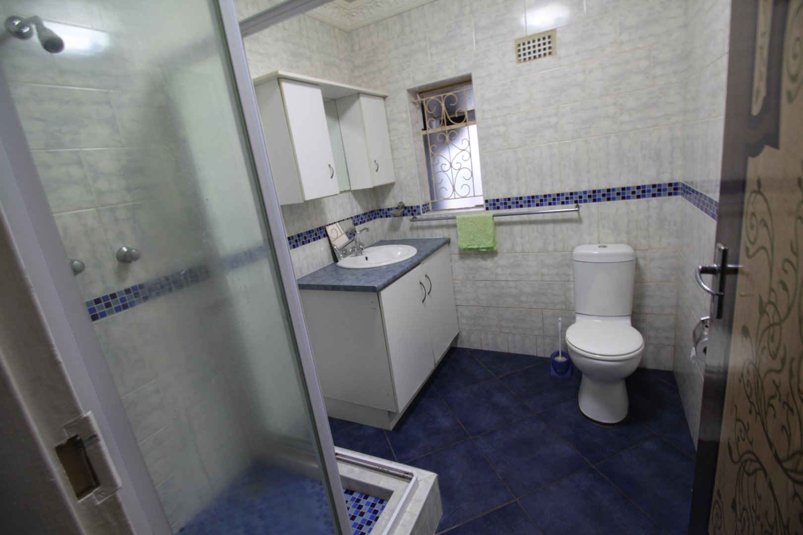 Bathroom fitted with toilet, basin and shower.