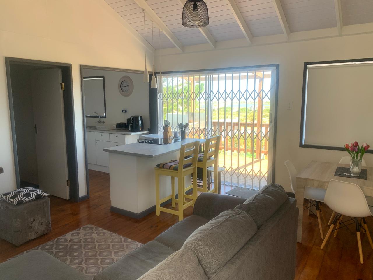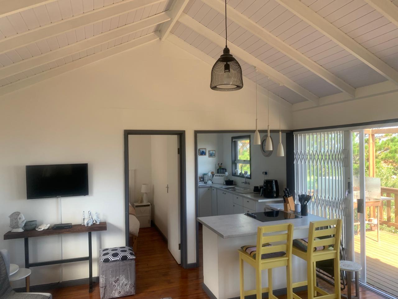 The home is freestanding and single storey, with durable timber-frame construction and a clean, modern look. High ceilings with exposed rafters, wooden floors and beautiful light fittings bring warmth into the living spaces. The layout is fully open plan, combining the kitchen, dining and living areas to create easy flow throughout this house for sale in Betty's Bay.