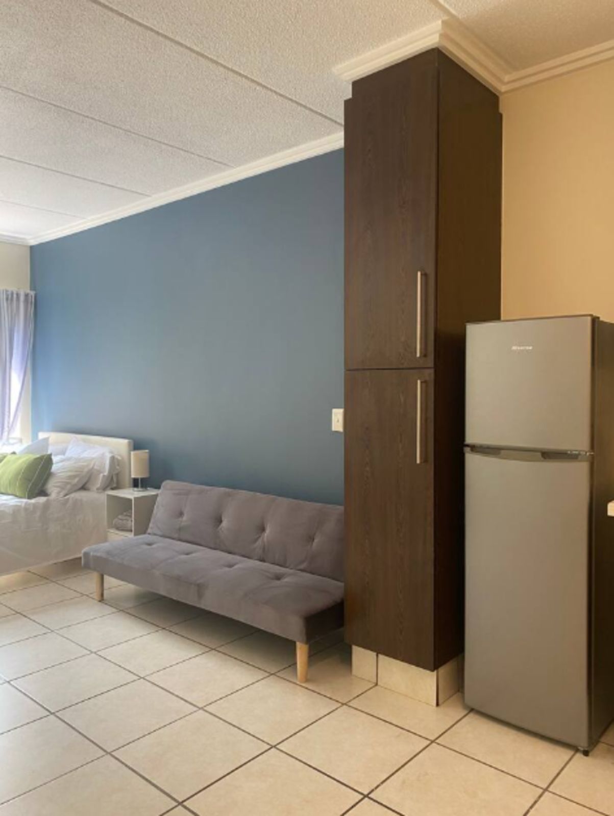 The studio includes a private bathroom with shower, a functional kitchen, and ample cupboard space, offering practical and efficient living. The layout is thoughtfully designed with a modern, neat finish throughout.