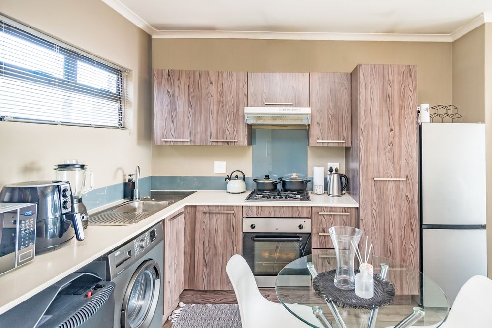 Modern kitchen with built in cupboards and space for two under counter appliances.