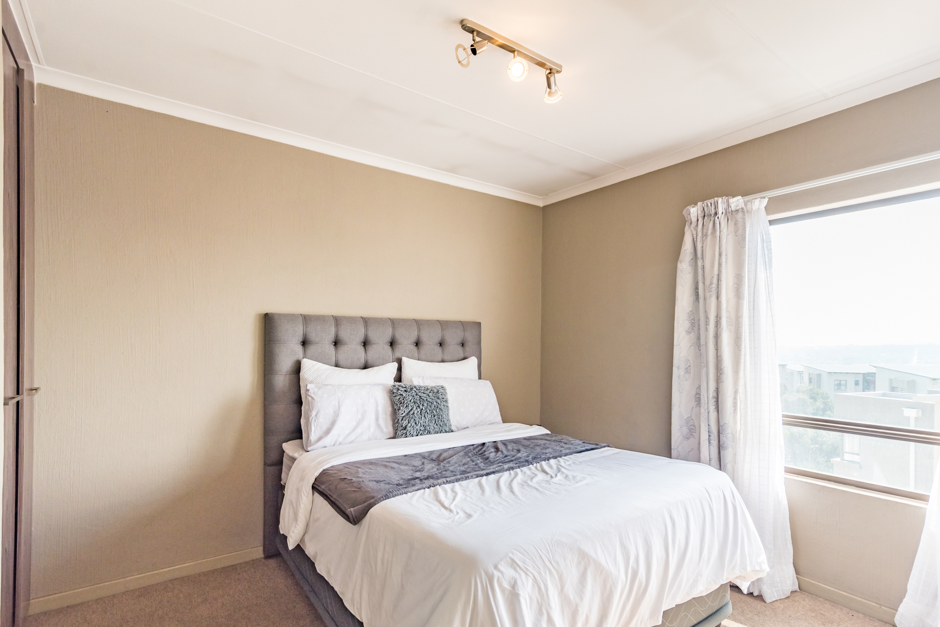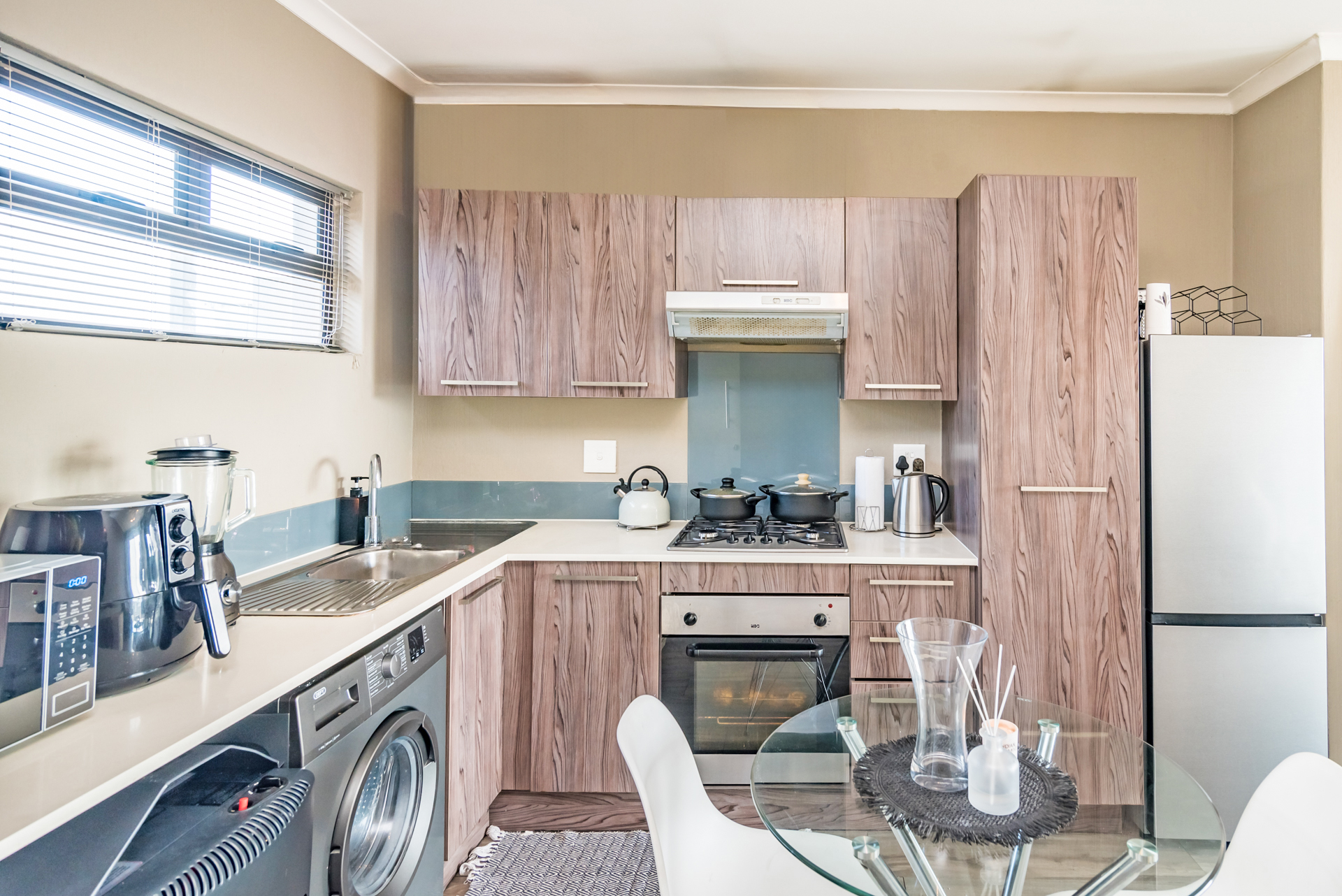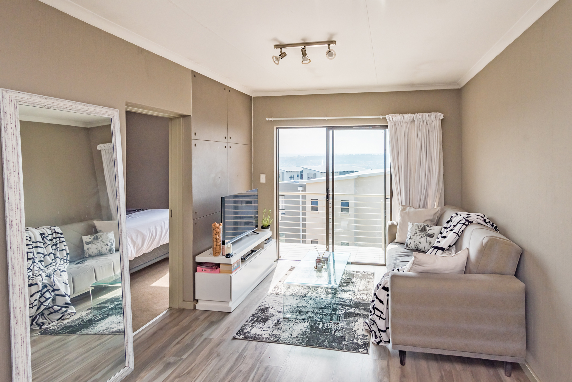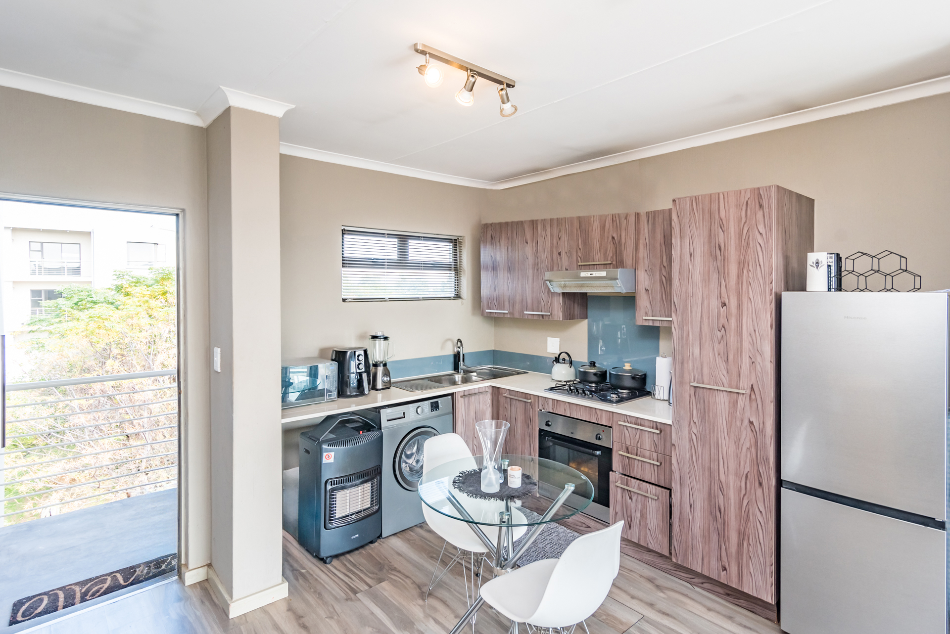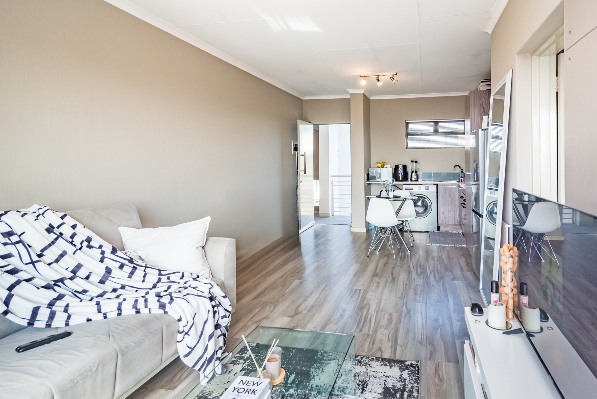 1 x open plan lounge and dining room opening to a welcoming balcony through sliding doors.