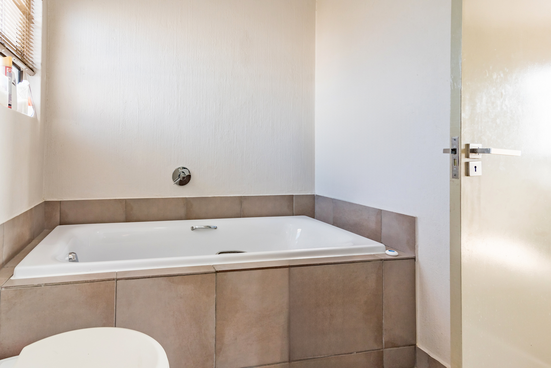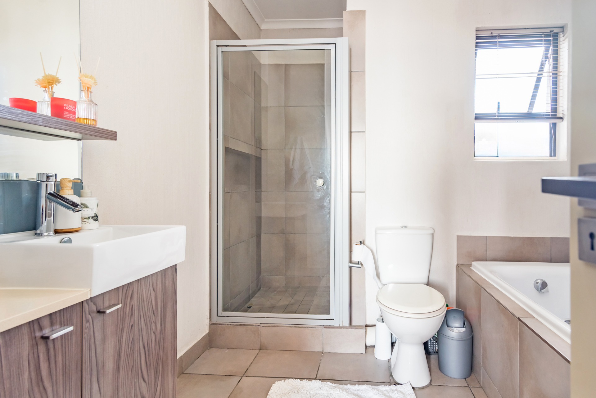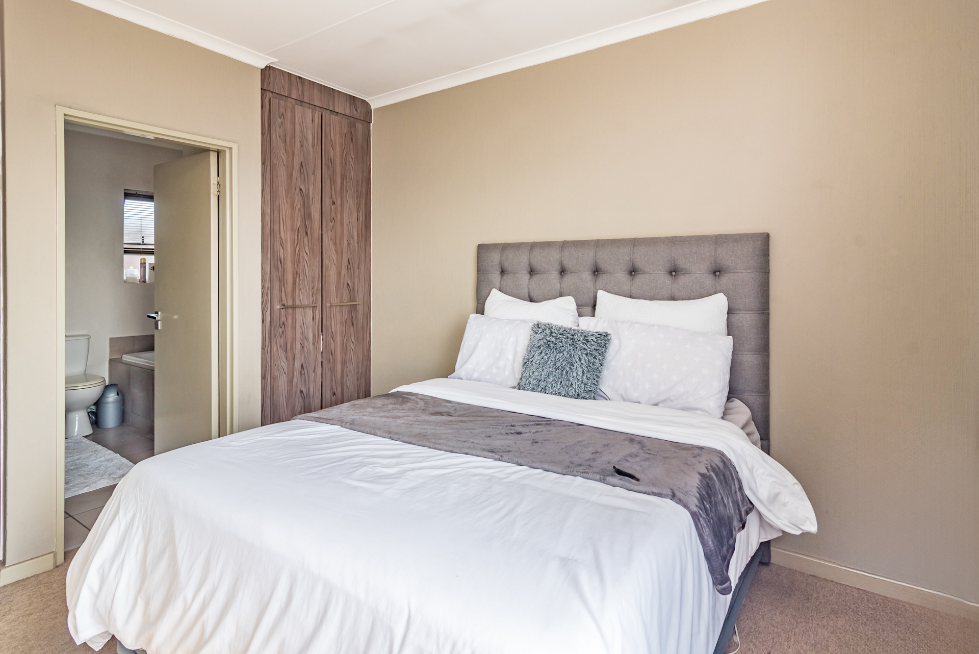 1 x bedroom with built in cupboards and en suite complete bathroom housing a shower, bathtub, vanity and loo.