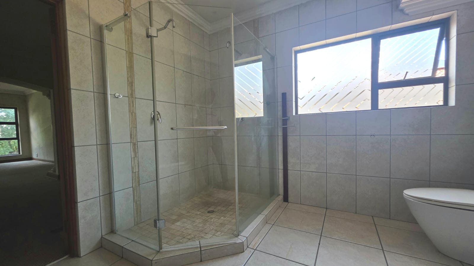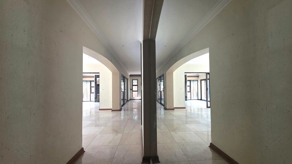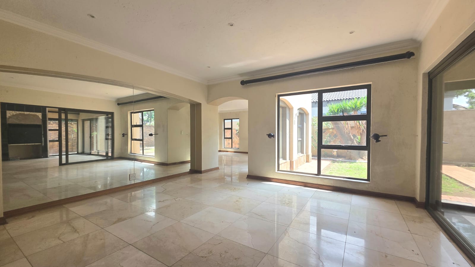 At the heart of the home lies a beautifully designed kitchen featuring granite countertops, abundant cabinetry, and a separate scullery — perfect for family gatherings and culinary creativity. Flowing seamlessly from the kitchen are the adjoining lounge, dining, and family rooms, with enhancements by striking mirror feature walls that reflect both style and warmth. The enclosed entertainment area, complete with a built-in braai and serene garden views, provides the ideal setting for year-round entertaining.