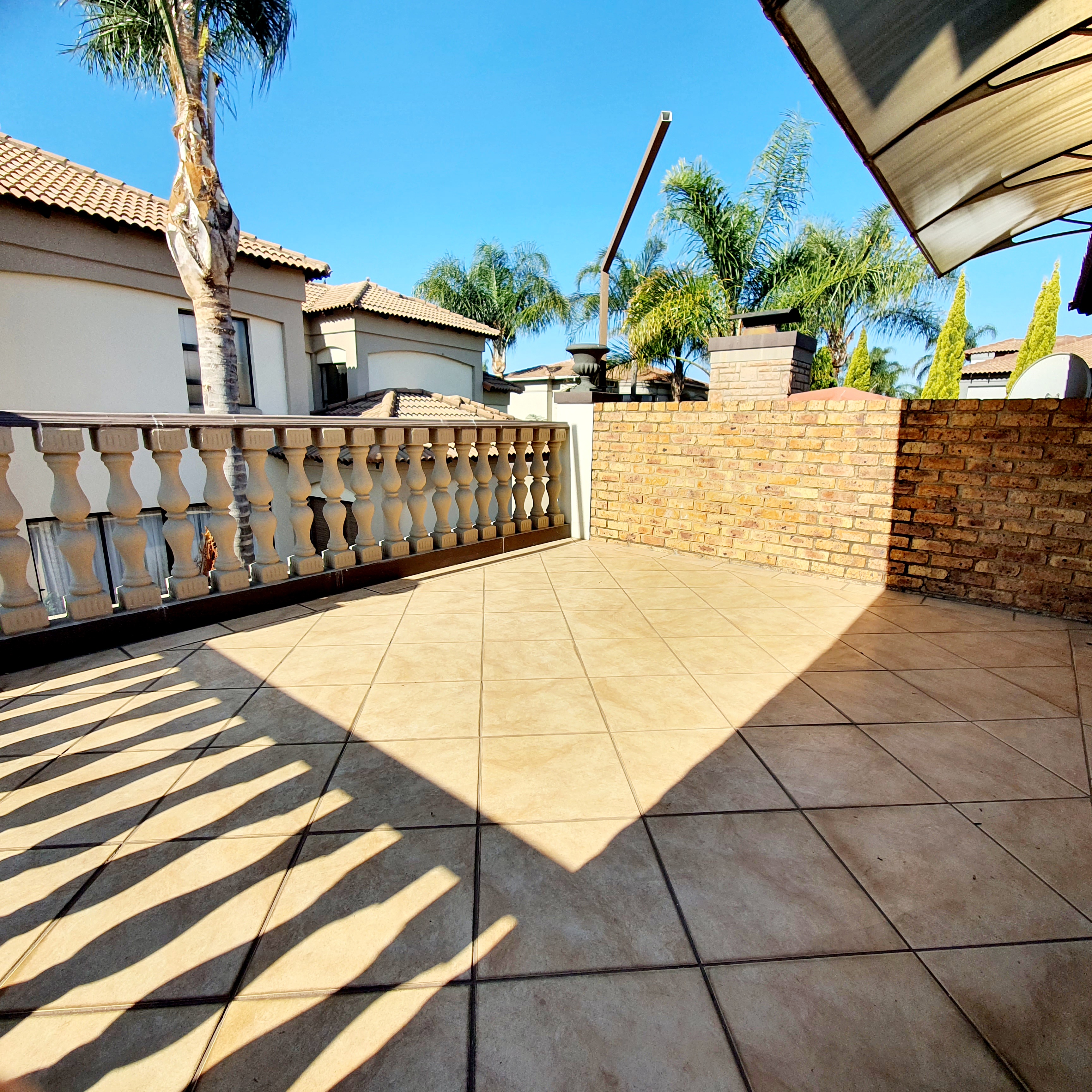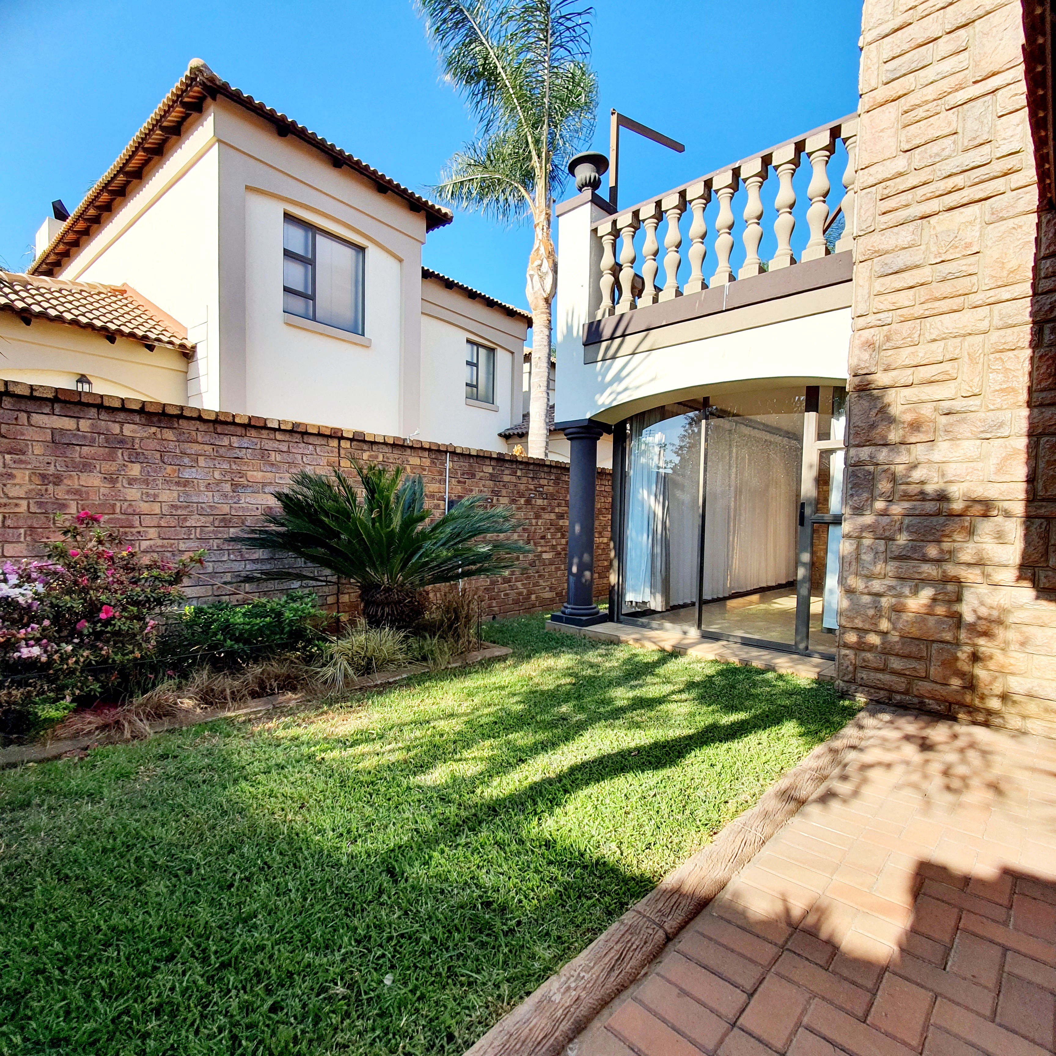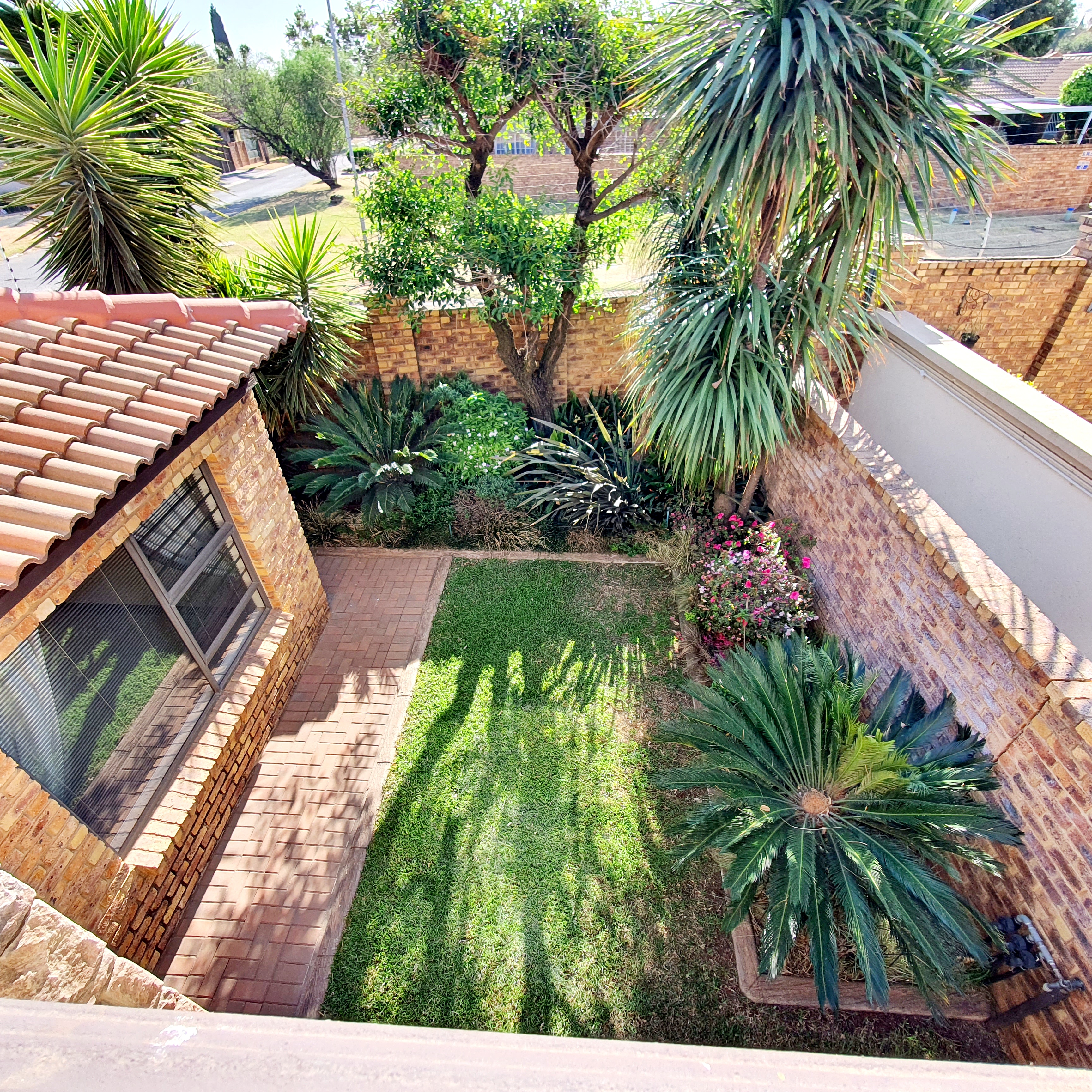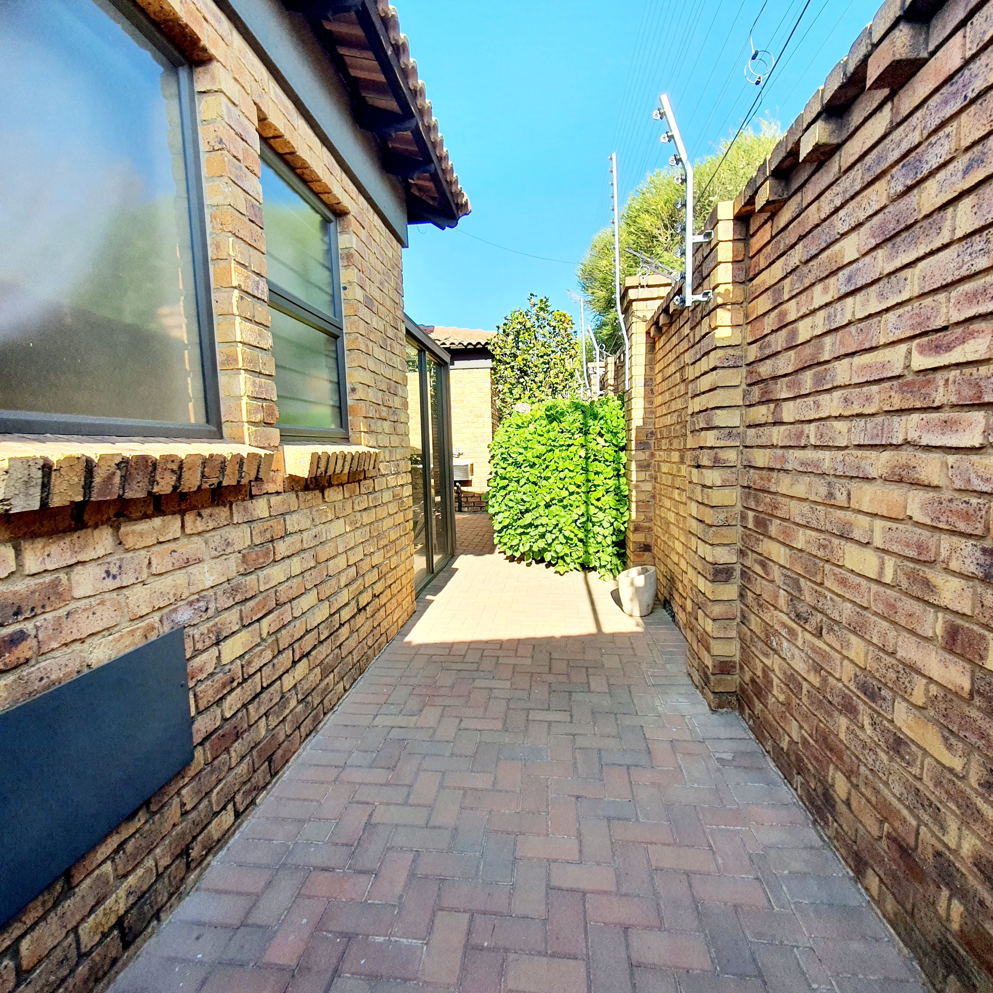 The entertainment room, complete with a built-in braai, is perfect for relaxed afternoons or weekend gatherings. Sliding doors open to a beautifully landscaped garden, bordered with neat paving. The property also features a guest bathroom and an indoor storage room, offering both functionality and versatility.