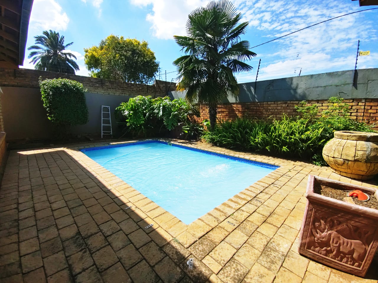 Outdoor living is where this home truly shines. A covered patio with a built-in braai overlooks the garden and swimming pool, providing a relaxed setting for entertaining while allowing pets to enjoy the outdoors. With 360-degree access around the house, there’s plenty of room for pets to move freely and safely.