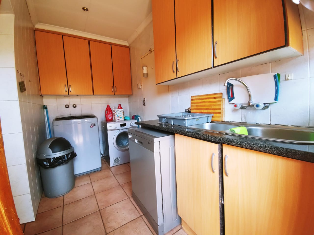 The home features a practical layout with a separate laundry room including sinks and dishwasher and washing machine connections, leading into a well-equipped kitchen with built-in cupboards, ample workspace, and a stove with hob. The kitchen flows effortlessly into the dining area and lounge, creating a welcoming environment for everyday living and quality family time.
