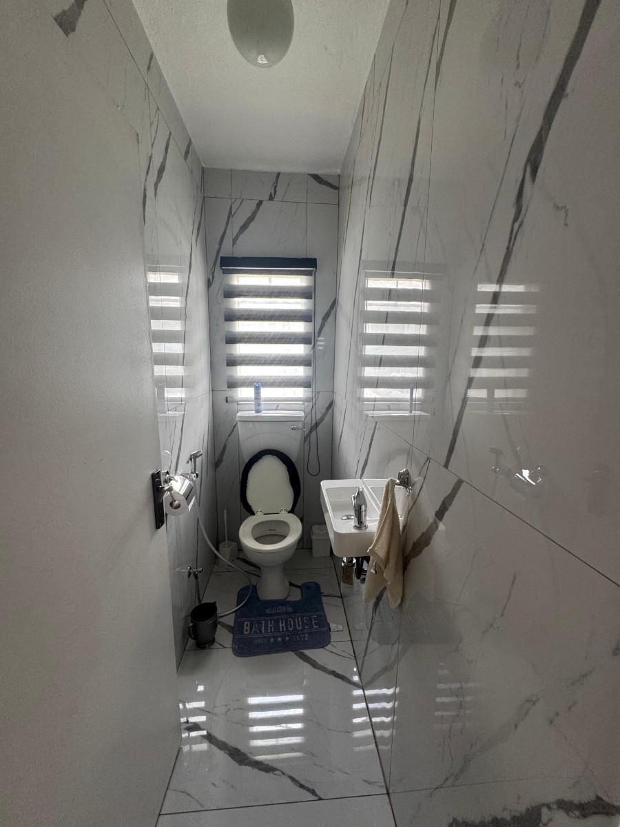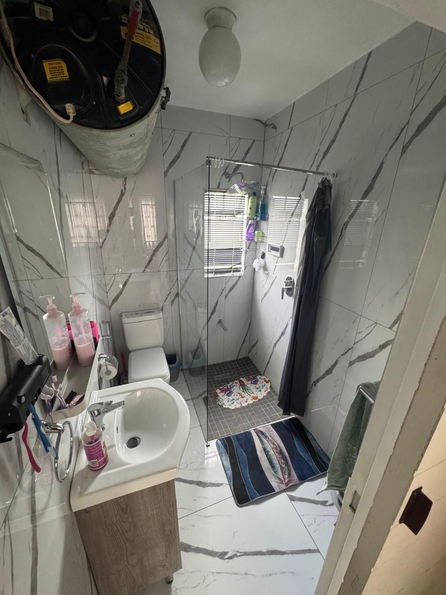 The layout includes a separate toilet and a newly upgraded full bathroom showcasing a modern walk-in shower, contemporary basin, and toilet. The open-plan living area flows effortlessly into a stylish kitchen equipped with a breakfast nook, fitted stove and oven, and space for a top-load washing machine.