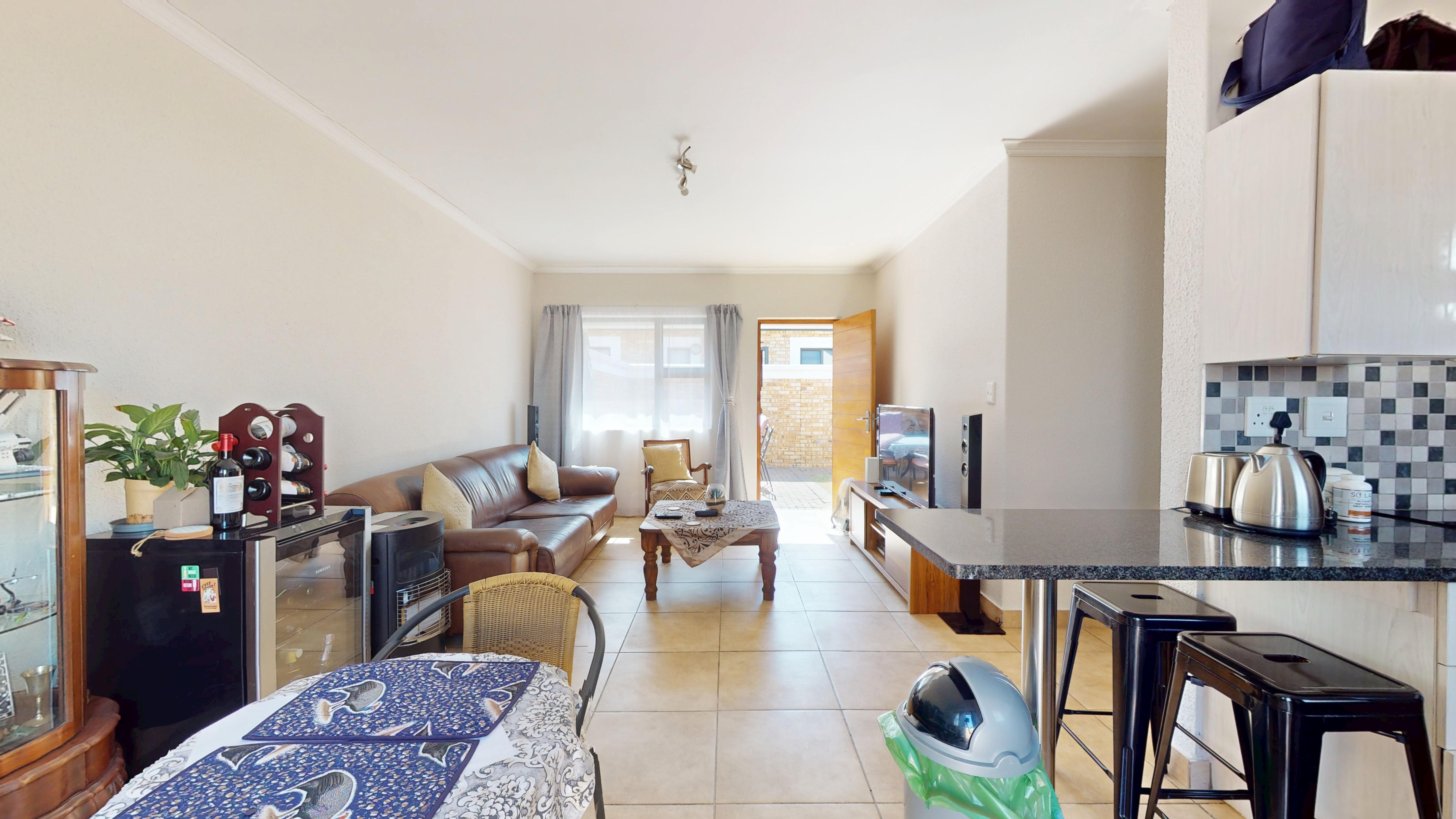 Inside, the home carries a consistent flow with uniform tiles and finishes throughout. The open plan living area provides ample space for both lounge and dining, seamlessly connecting to a modern kitchen fitted with granite countertops, a breakfast nook, and space for two appliances. A back door leads out to a private, neatly paved courtyard.