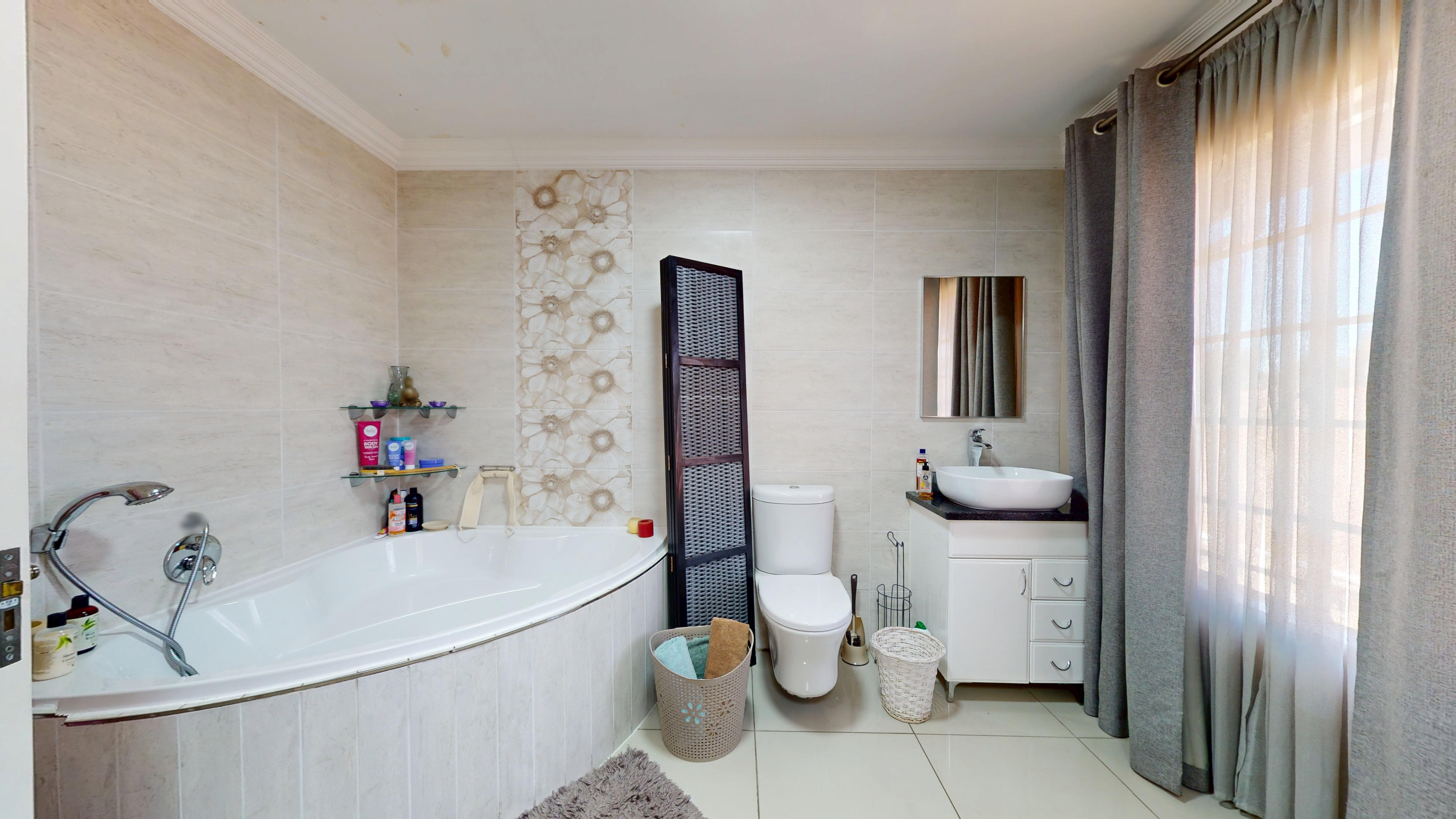Offering two spacious bedrooms, the main bedroom includes an open-plan en-suite bathroom with a luxurious corner bath, vanity, and toilet. A second bathroom, neatly finished with a shower, toilet, and vanity, adds additional convenience for guests or family.