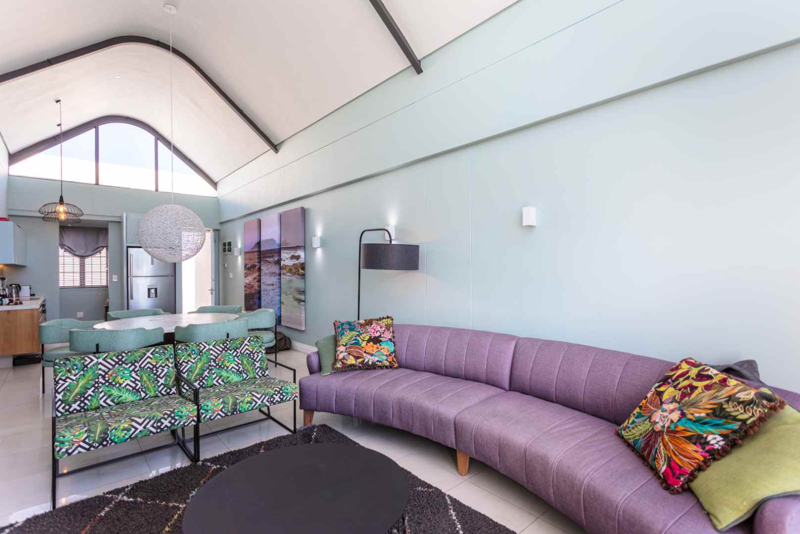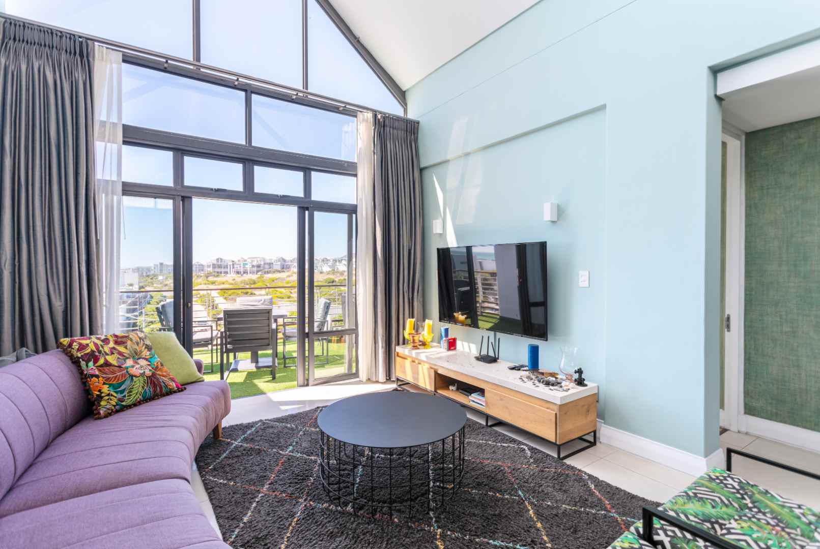 Double-volume floor-to-ceiling sliding doors flood the living space with natural light