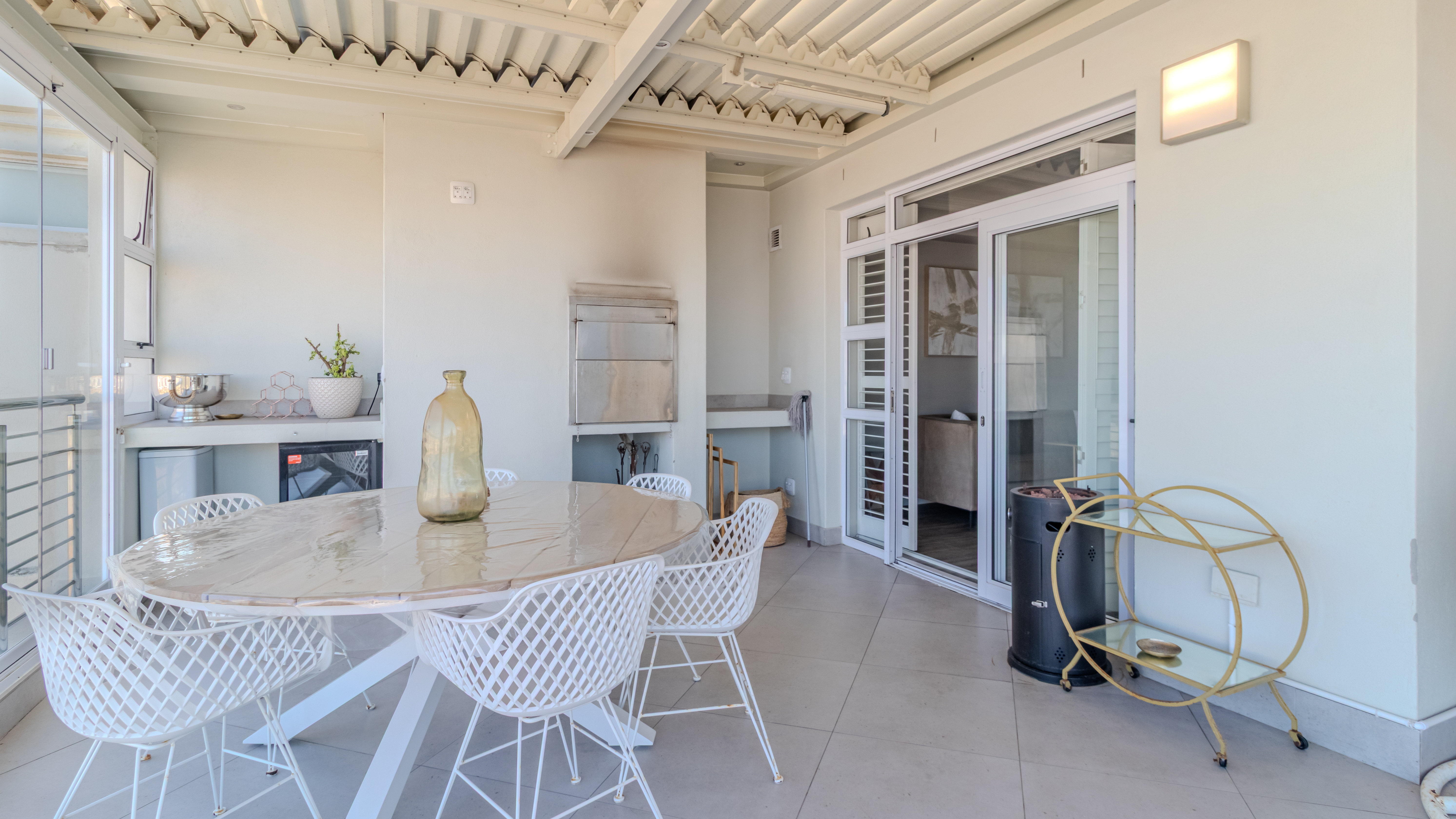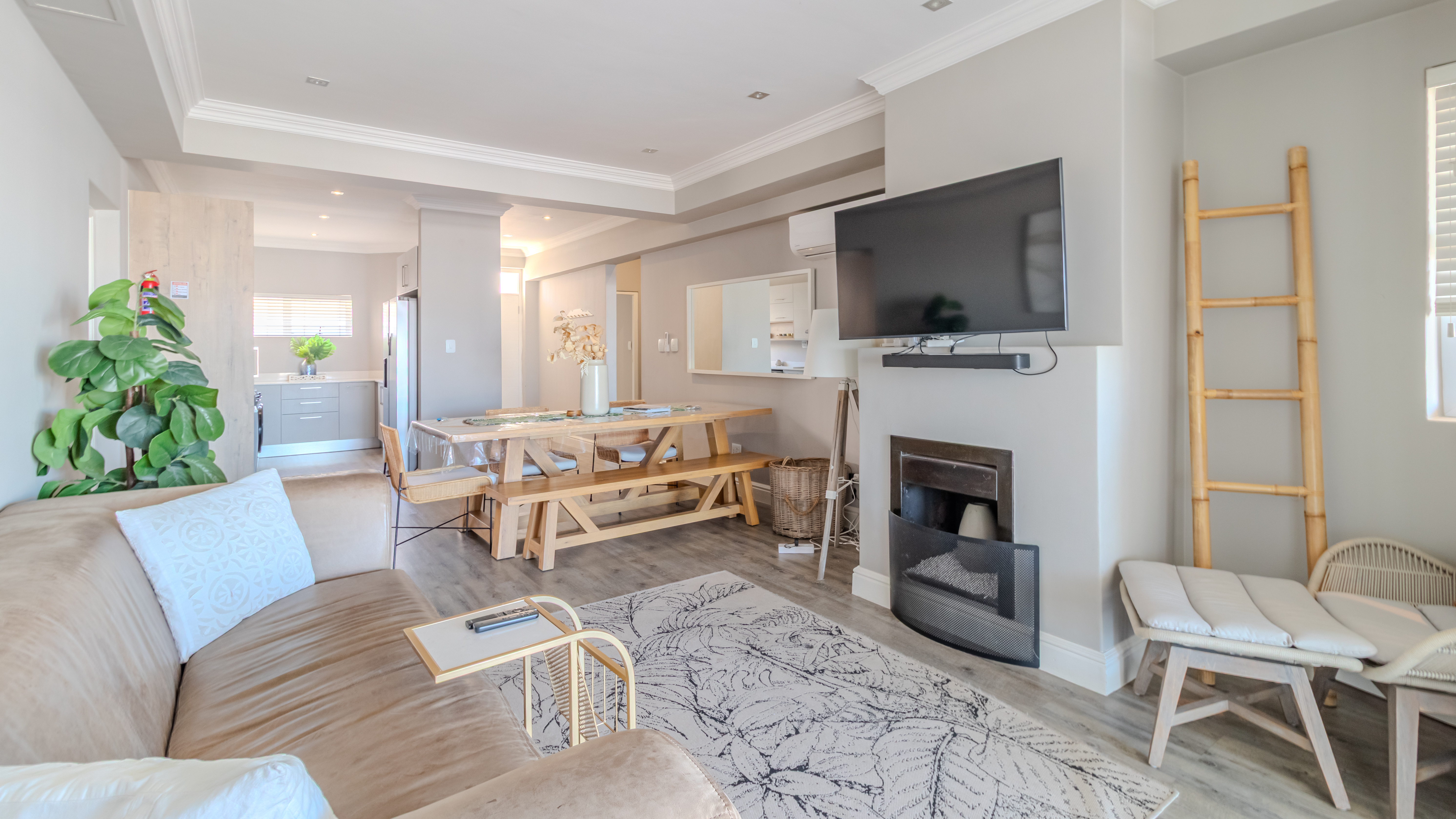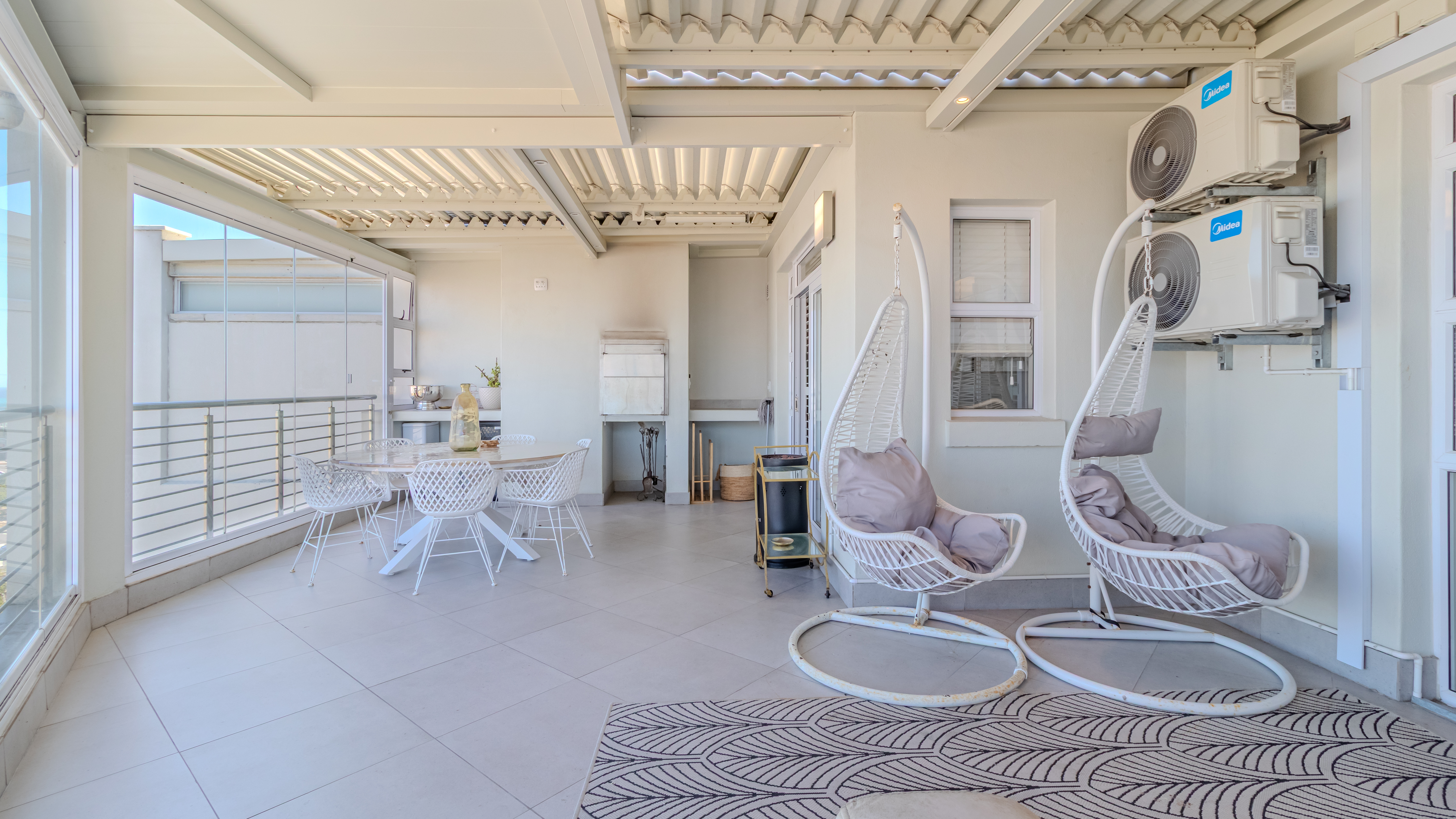 The expansive, enclosed balcony is a true entertainer’s dream—complete with a built-in braai, bar fridge, and elegant outdoor furniture, all designed to make the most of the breathtaking backdrop. Sliding doors open into a light-filled lounge and dining area featuring air-conditioning and a seamless flow to the modern, fully equipped kitchen with high-end finishes.