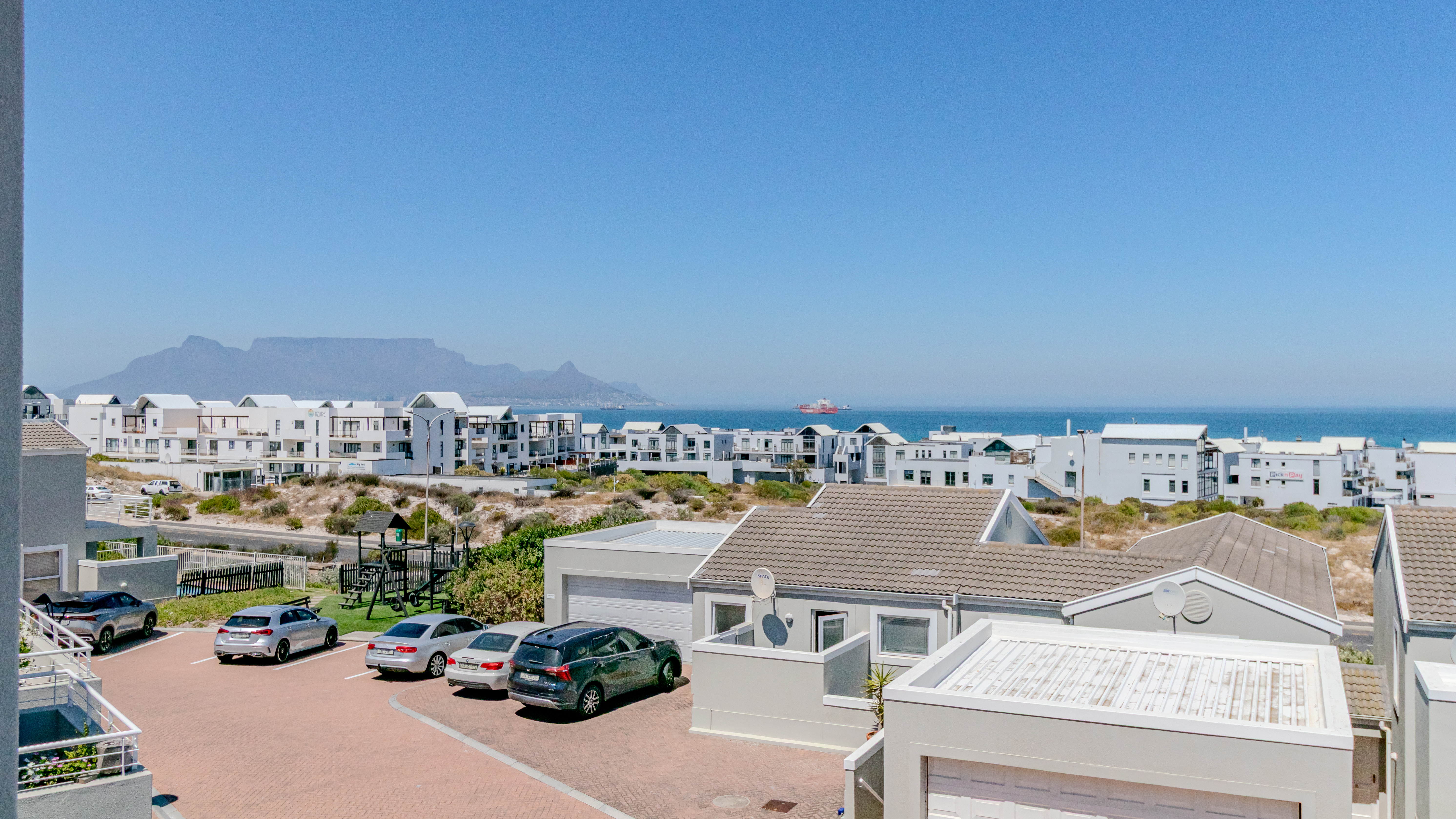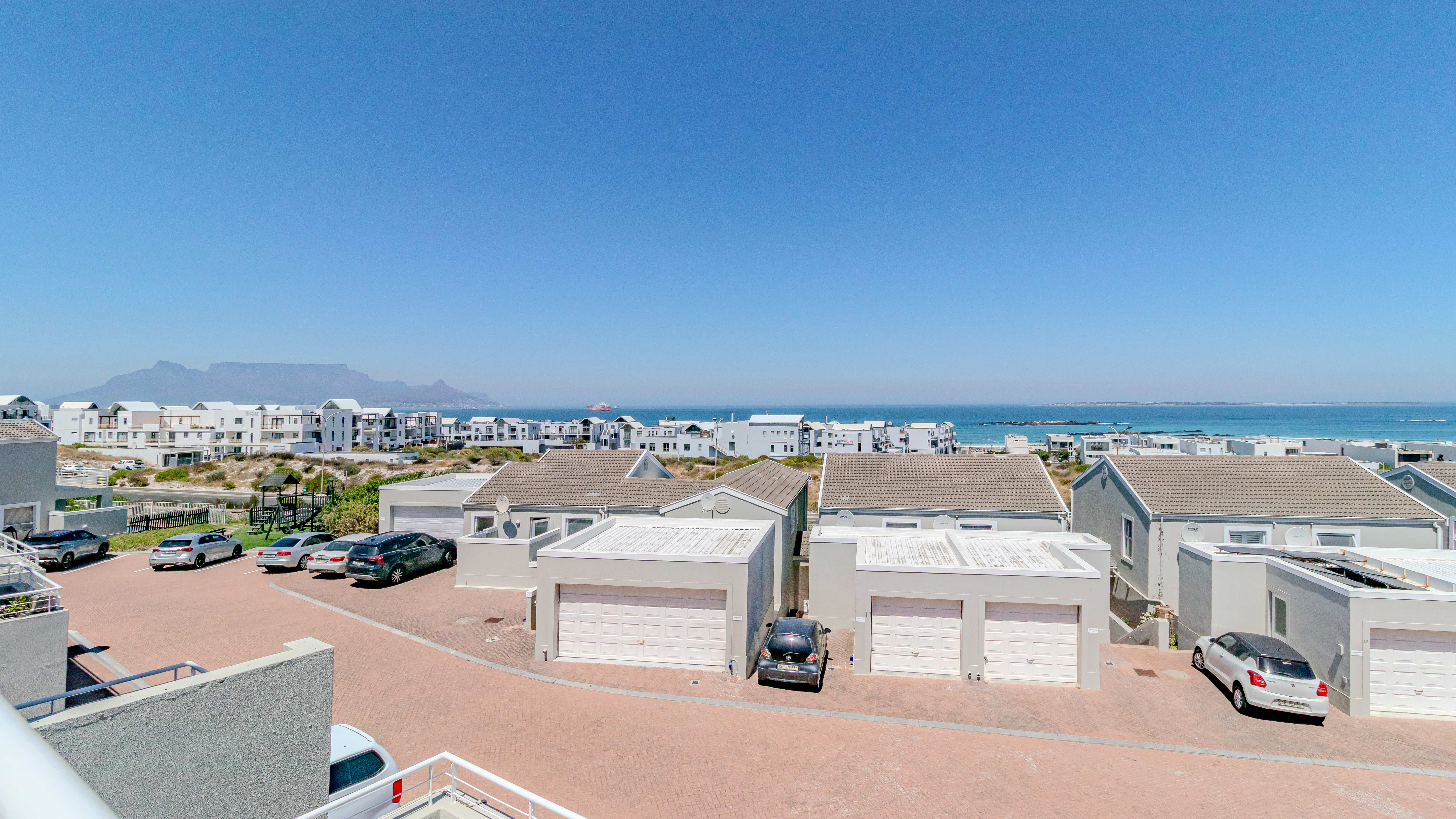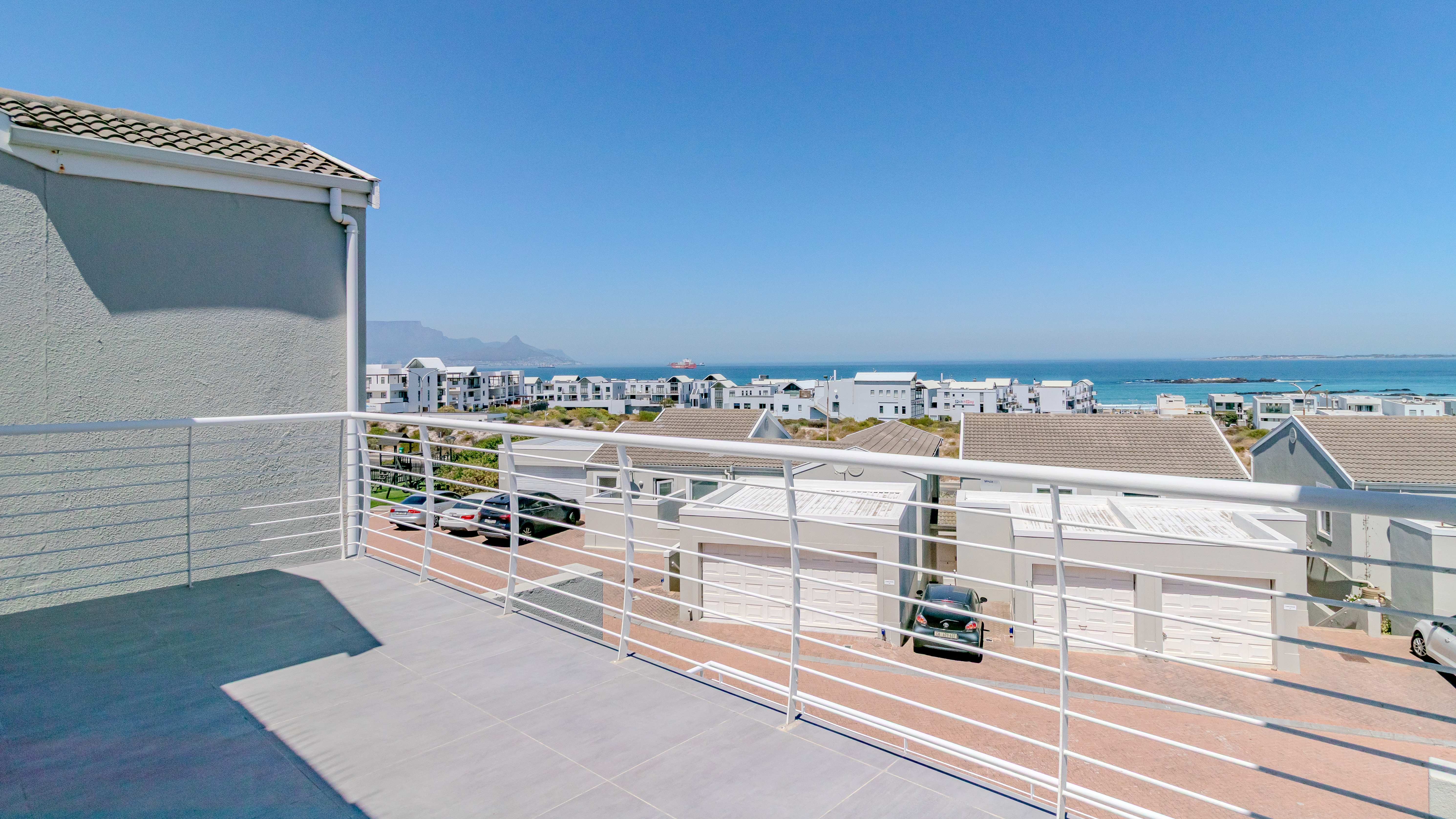 The home enjoys breathtaking panoramic views of the ocean, Table Mountain and Robben Island, best appreciated from the large balcony designed for easy entertaining. Fitted with weather blinds, this space flows seamlessly into the open-plan living area and modern kitchen. The kitchen features a gas stove, two plumbing points and space for a double-door fridge, and leads out to a small, private back courtyard.