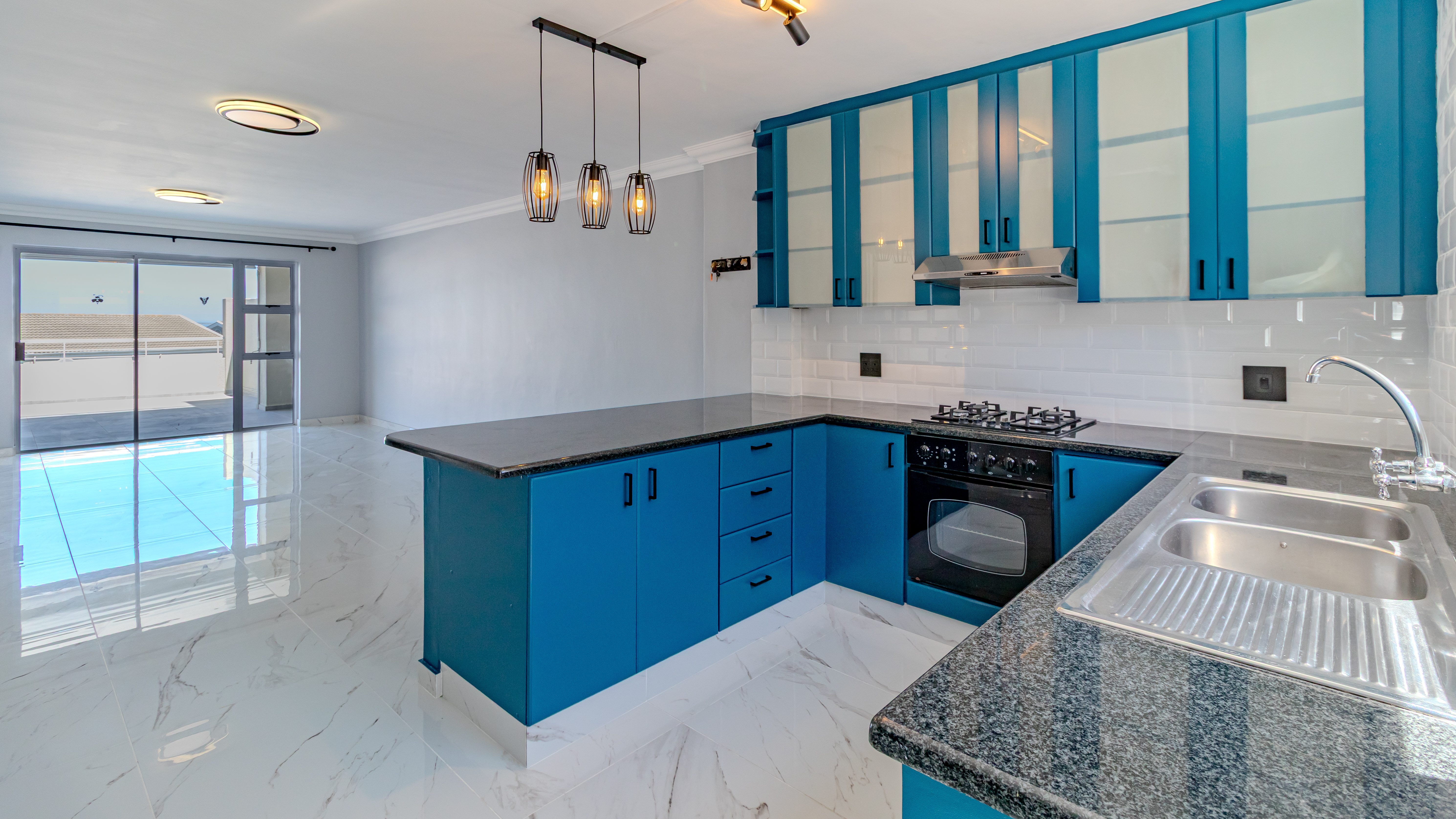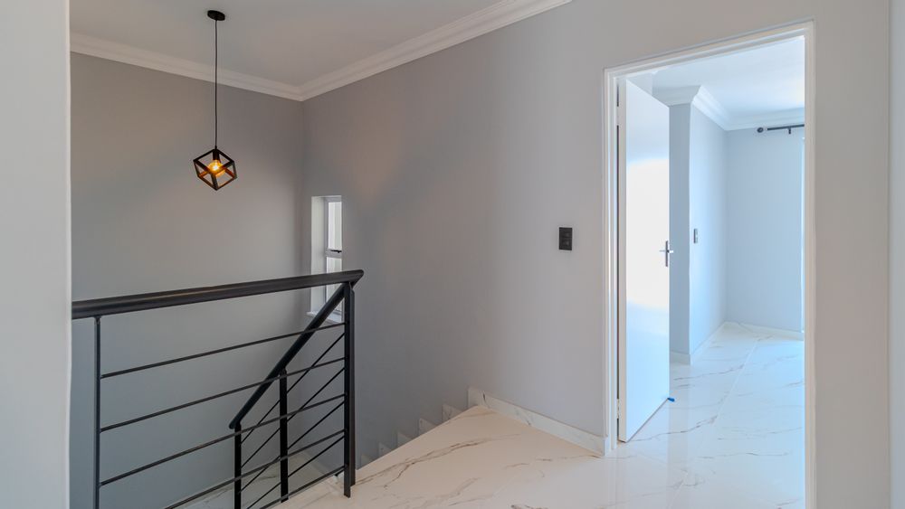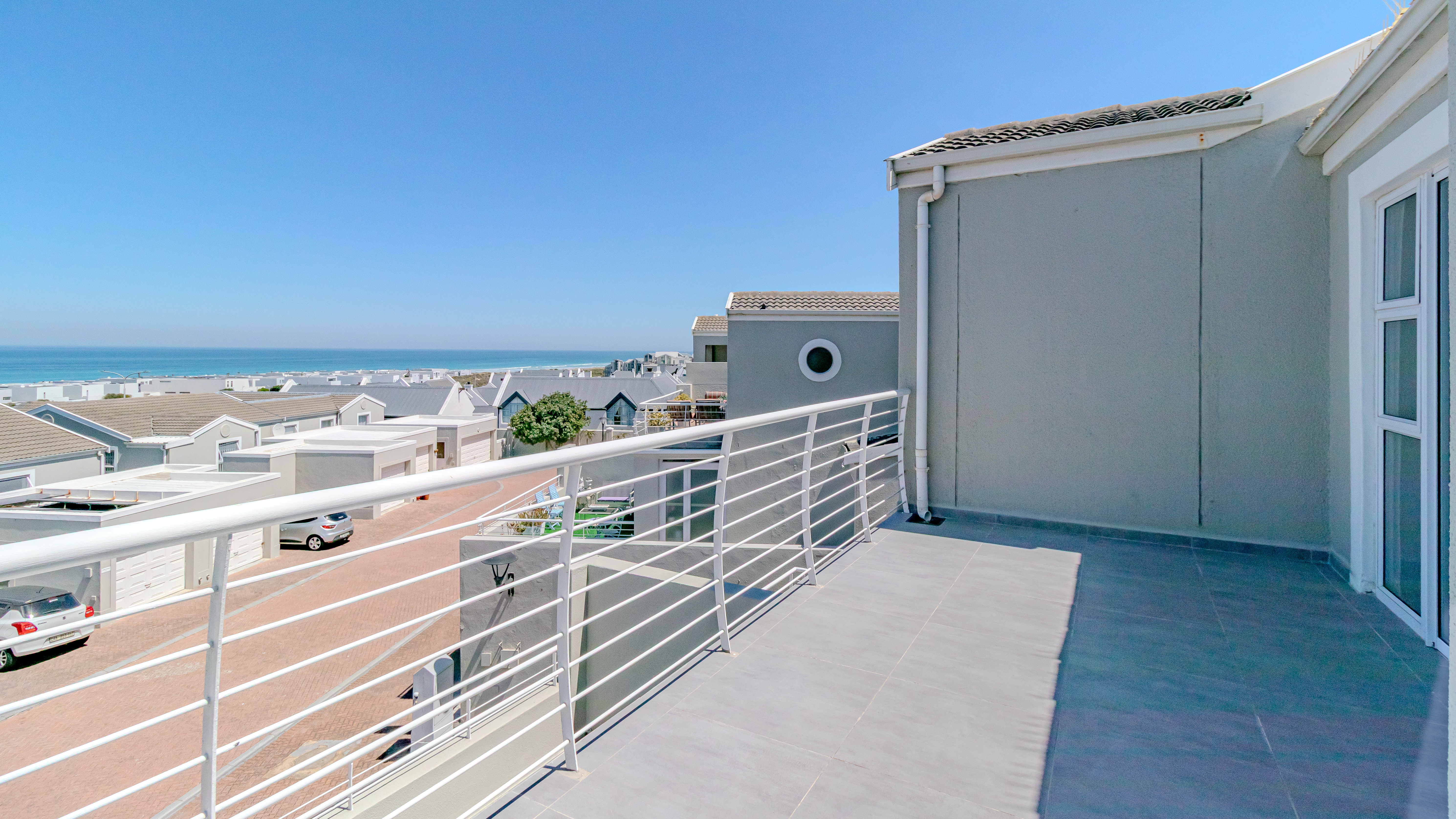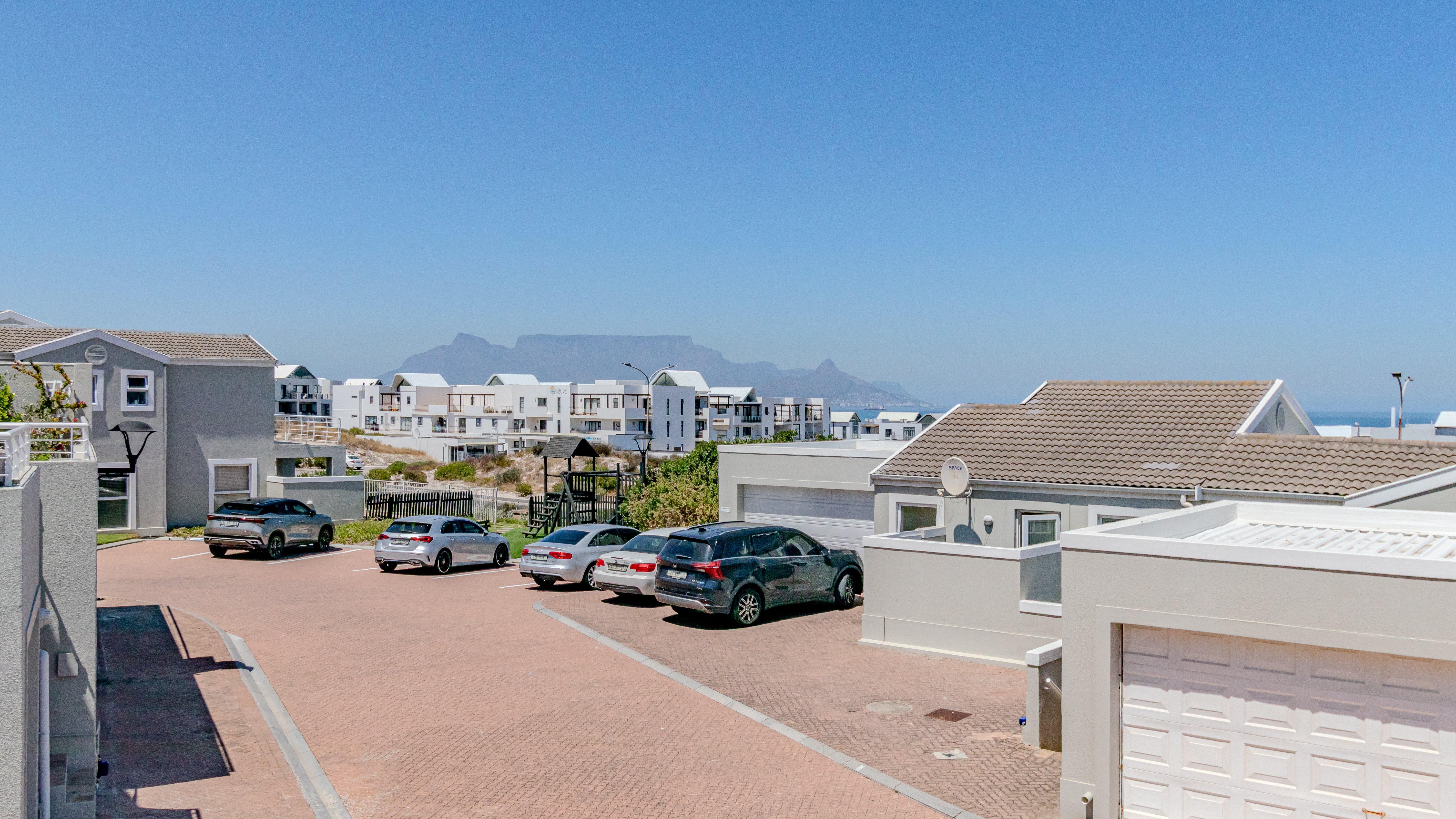 The home enjoys breathtaking panoramic views of the ocean, Table Mountain and Robben Island, best appreciated from the large balcony designed for easy entertaining. Fitted with weather blinds, this space flows seamlessly into the open-plan living area and modern kitchen. The kitchen features a gas stove, two plumbing points and space for a double-door fridge, and leads out to a small, private back courtyard.