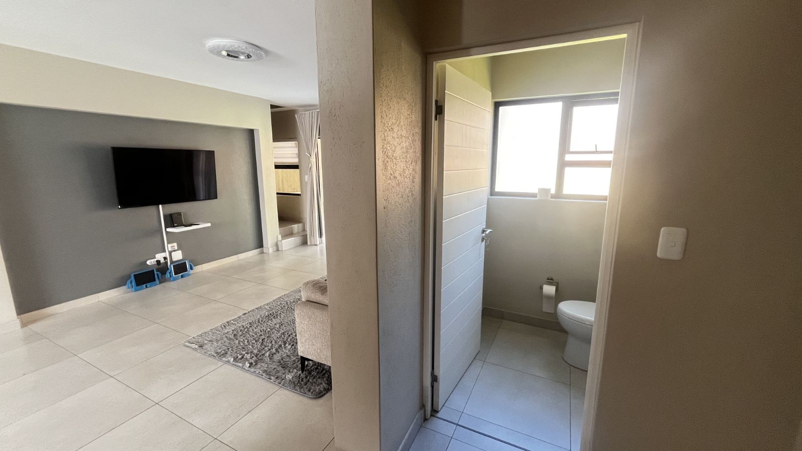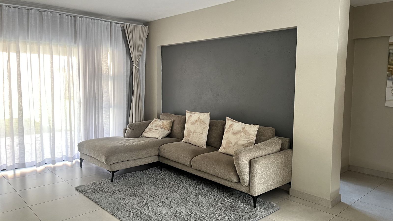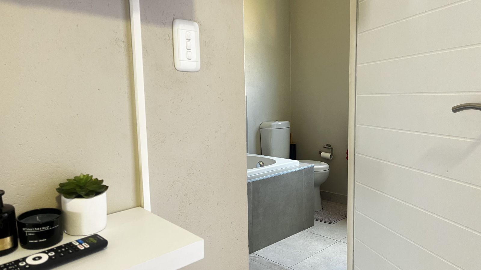 The light-filled lounge and dining area flow effortlessly into a private garden, creating the perfect space for relaxed family living or entertaining guests. Residents also enjoy access to a communal shared swimming pool, ideal for cooling off on warm days or socialising within the estate. The main bedroom features a stylish en-suite bathroom, while the remaining two bedrooms are serviced by a modern full bathroom.