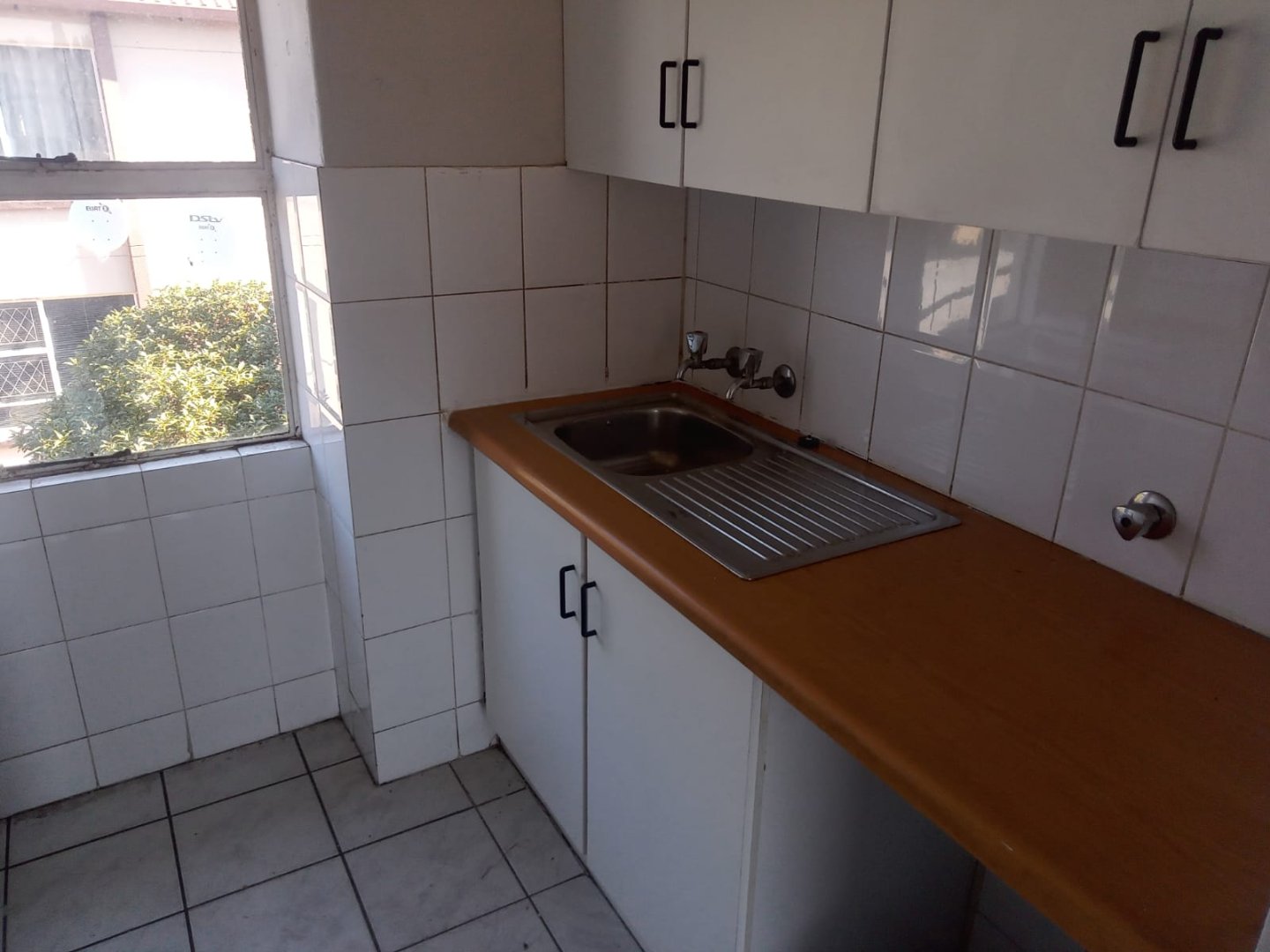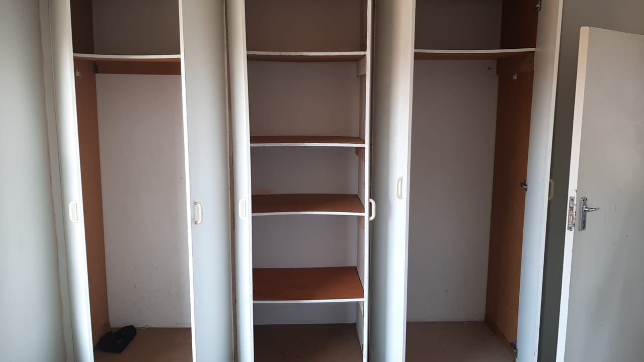 The open-plan kitchen is fitted with ample built-in cupboards.