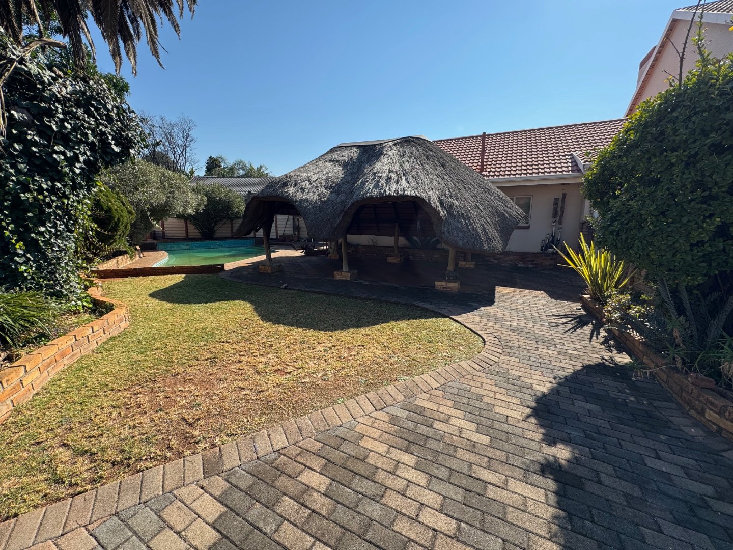 The modern kitchen is complemented by a scullery and separate laundry for added convenience. Outdoor living is enhanced by a sparkling pool, ideal for entertaining or relaxing. Staff quarters provide extra flexibility, while the three-car carport and double garage ensure secure parking for multiple vehicles.