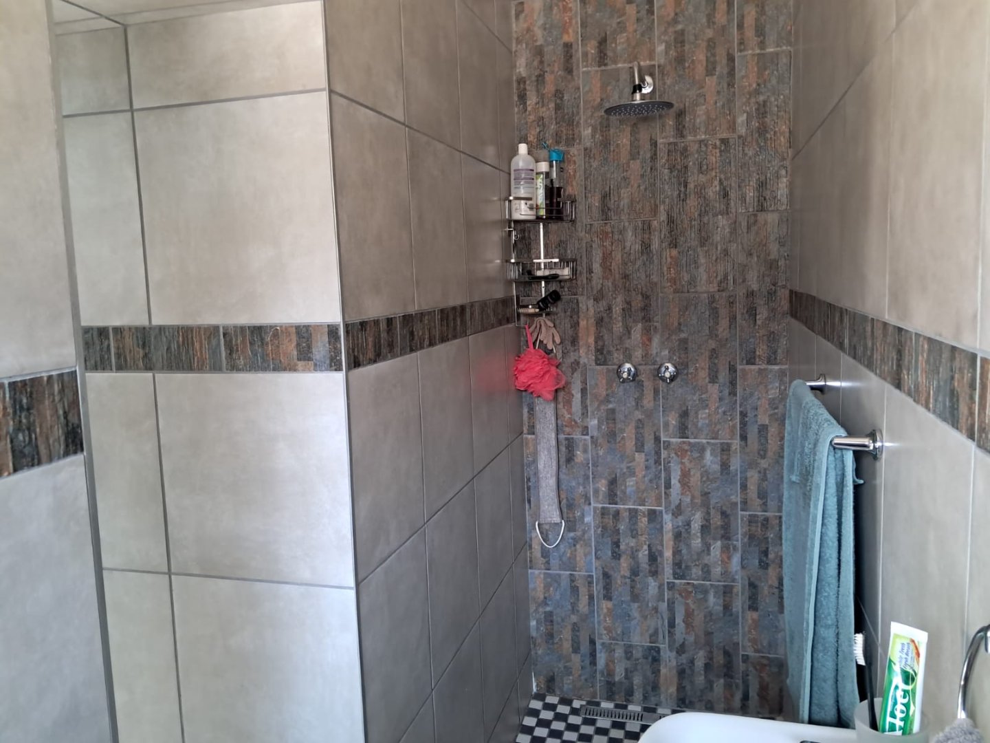 Spacious bathroom with walk-in shower, grab handles, and built-in shower seat for safety and comfort