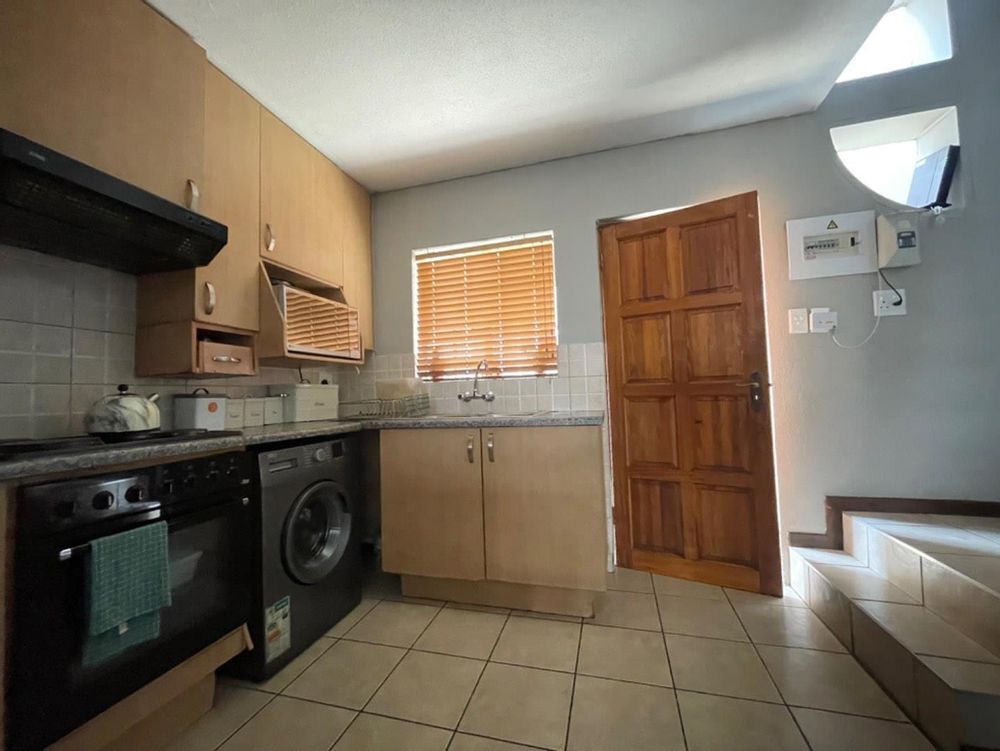 Step inside to find a neat and modern kitchen that seamlessly flows into a spacious lounge area. This open-plan design creates a welcoming space for entertaining and everyday living. The lounge further extends to the outdoors, with a sliding door that opens up to the quaint garden, providing a seamless indoor-outdoor living experience.