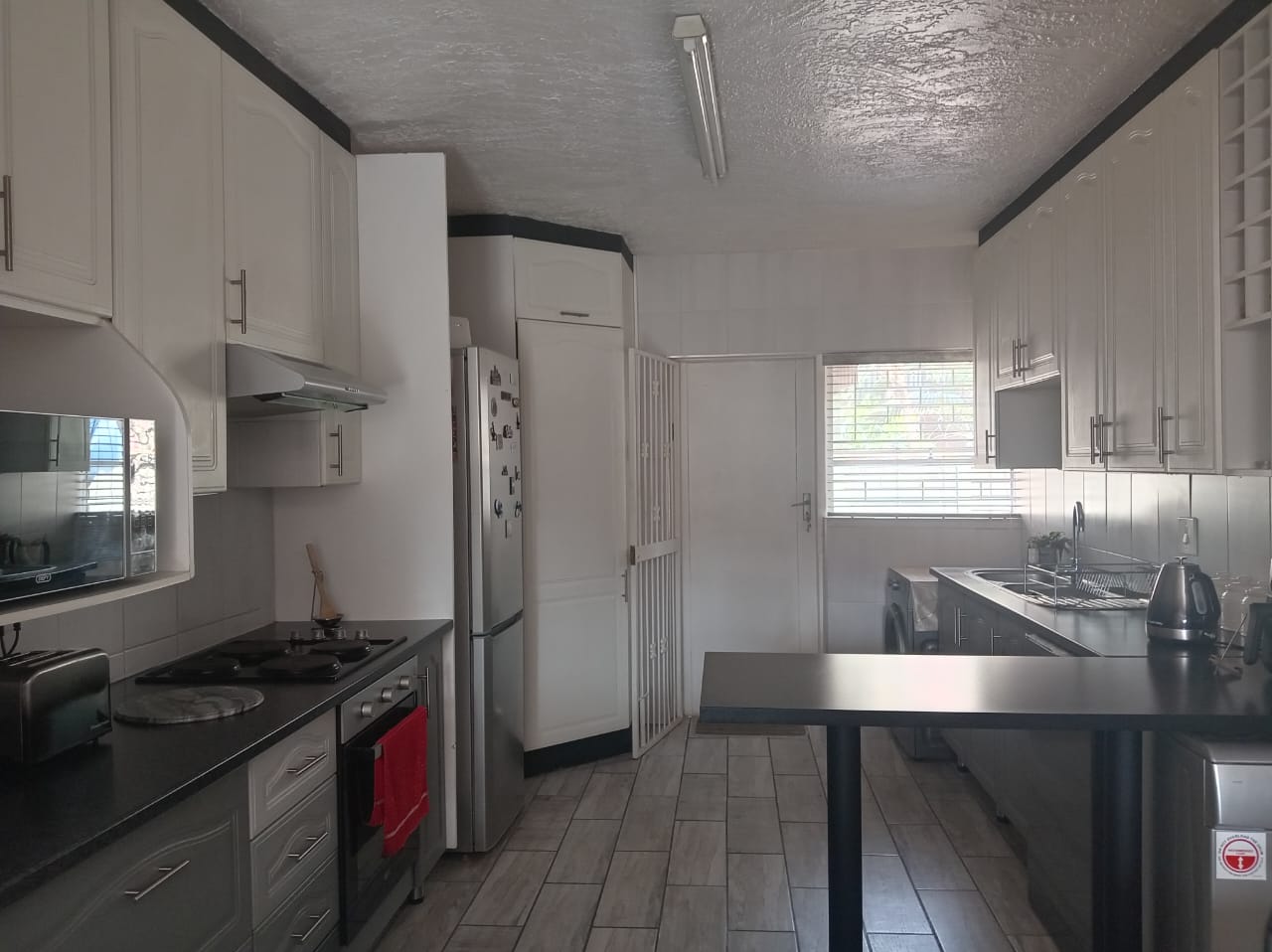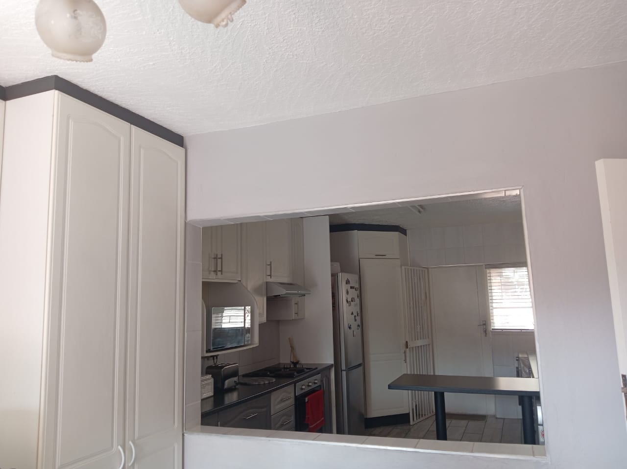Enjoy a large lounge ideal for family living or entertaining, with a separate dining area featuring extra built-in cupboards for your cutlery and dining ware. A convenient serving hatch opens into a generously sized kitchen offering ample cupboard space — a dream for anyone who loves to cook and organize.