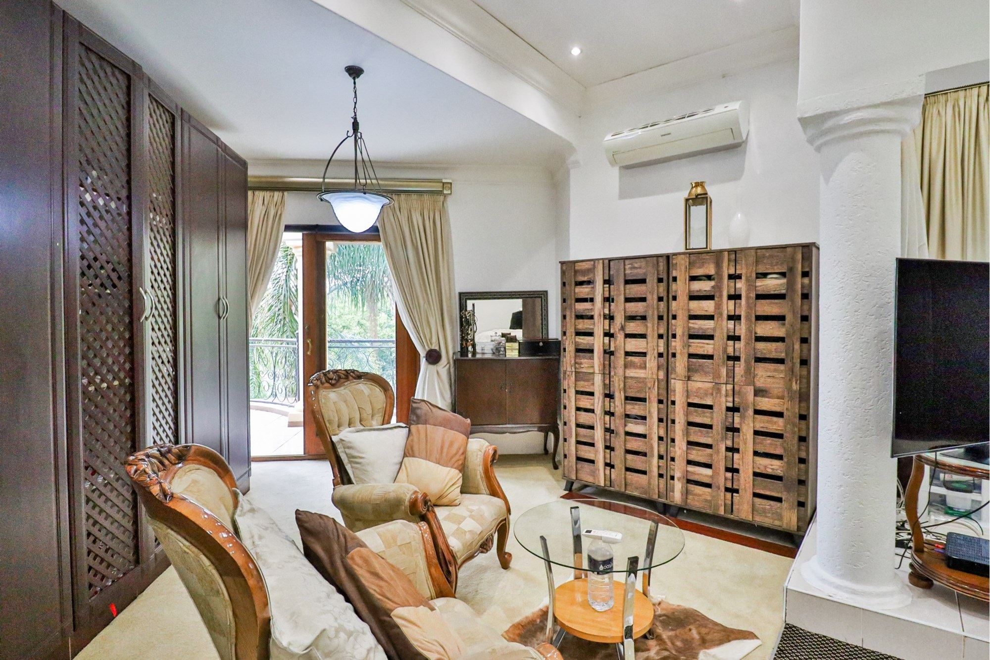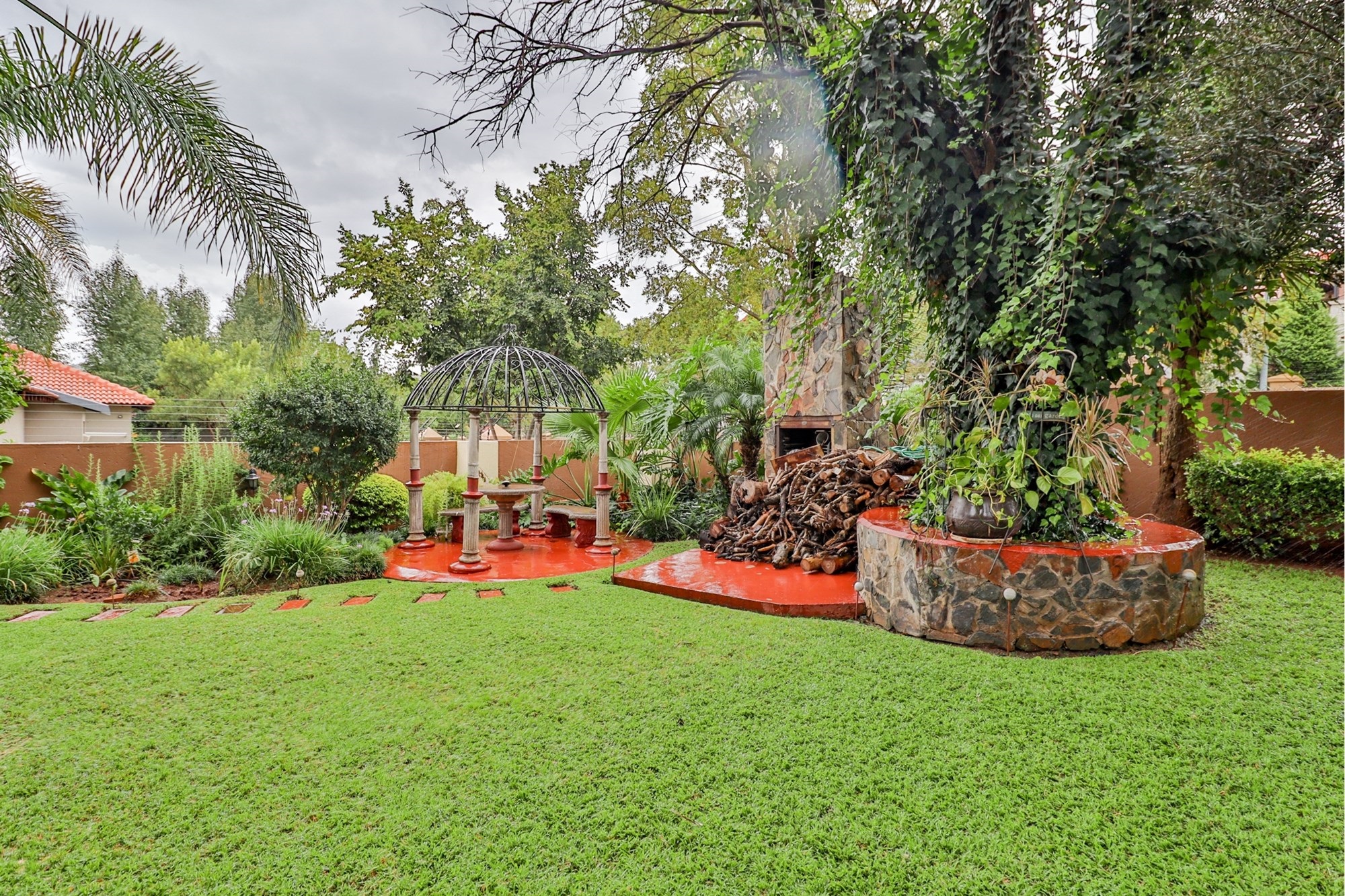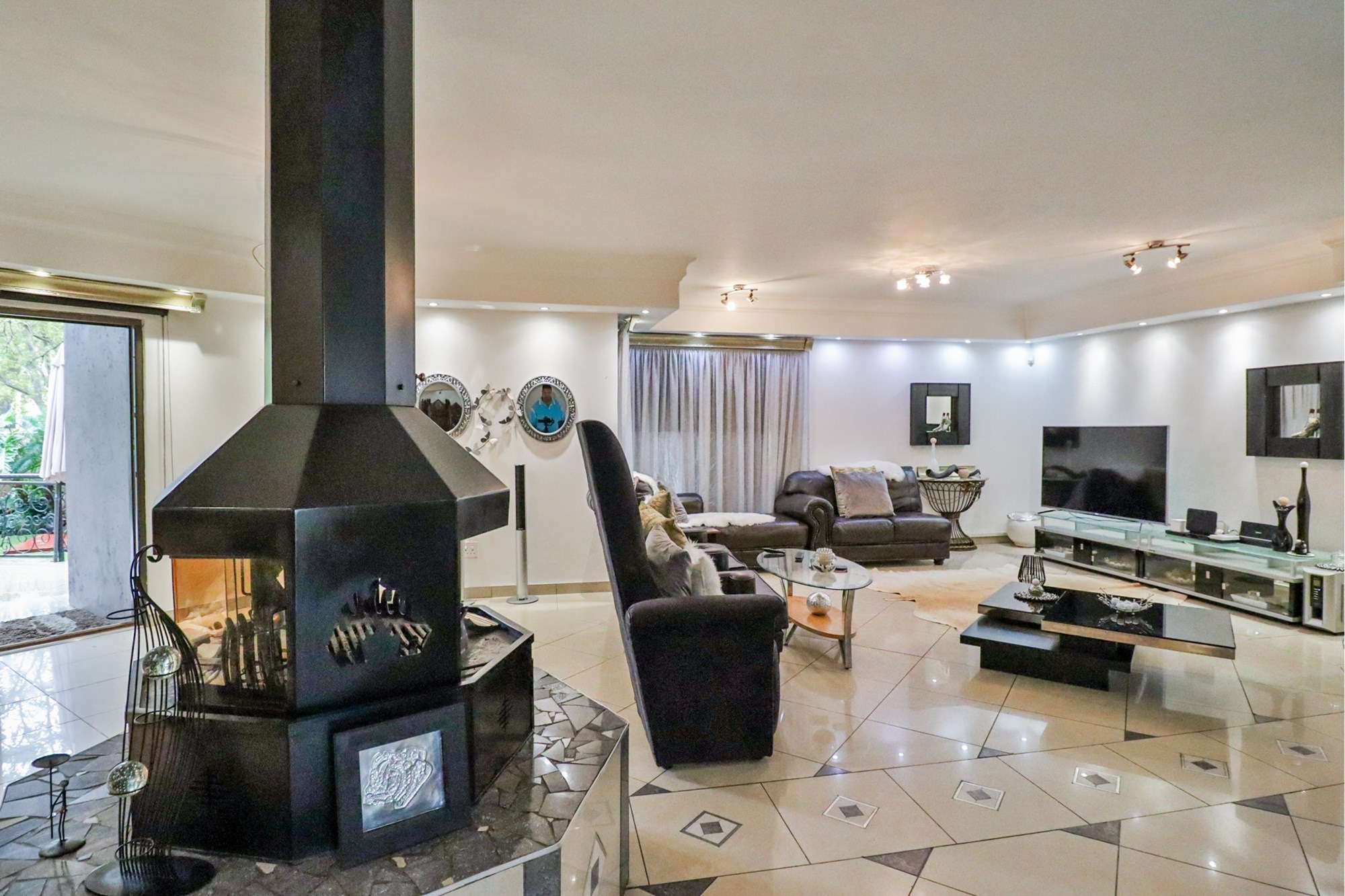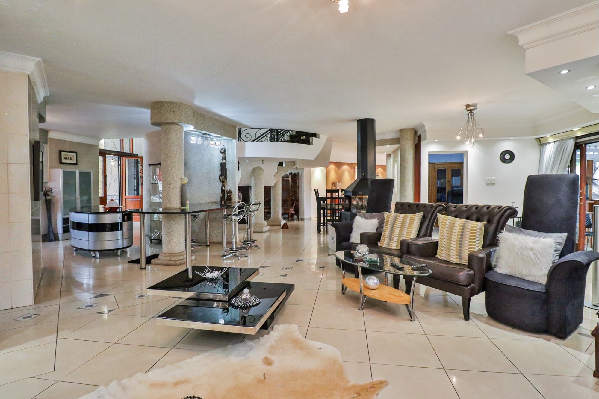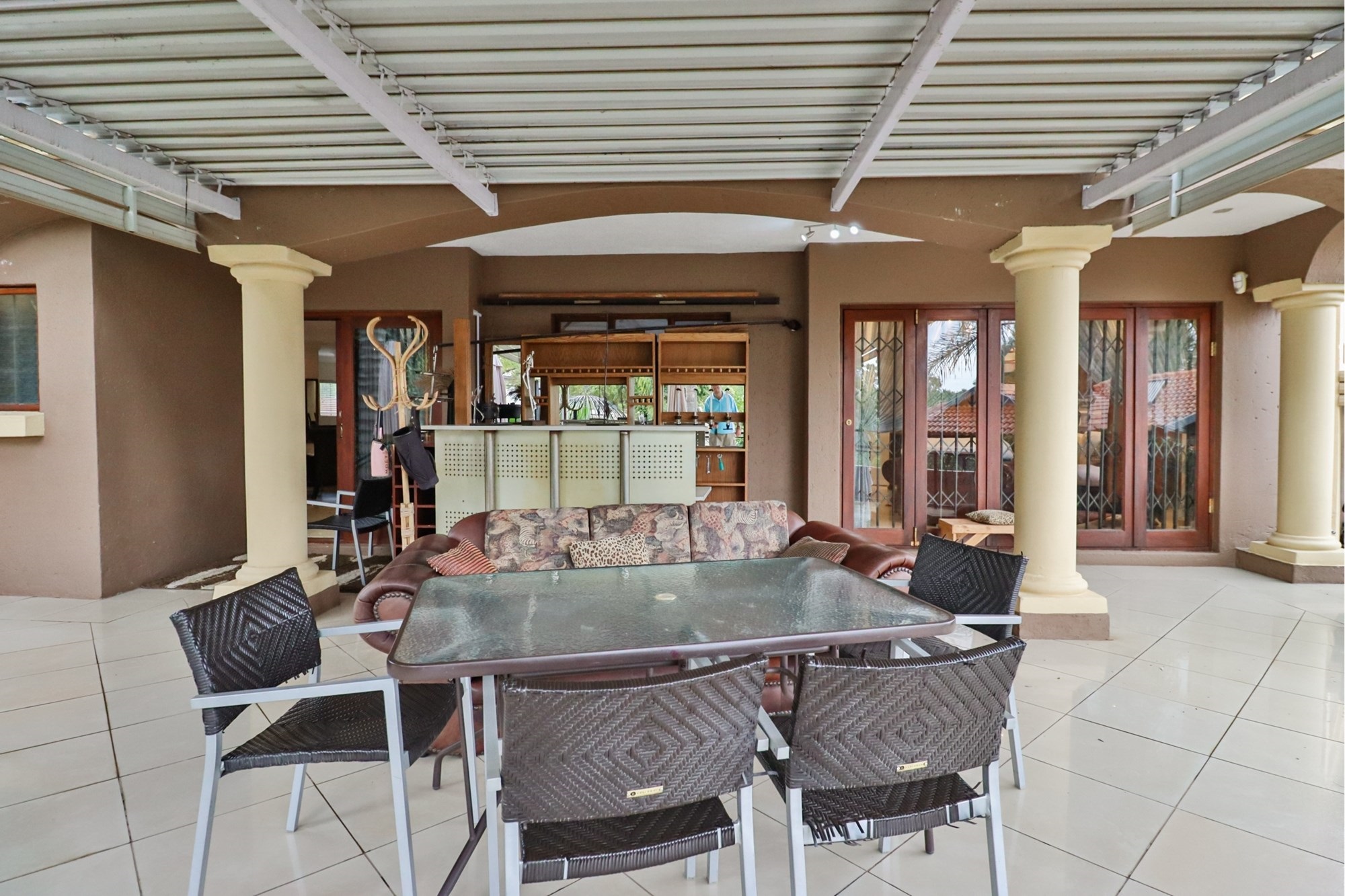 The covered patio outside hosts the entertainment areas overlooking a sparkling pool and a luscious tree-filled manicured garden, irrigated from a fully operational borehole.