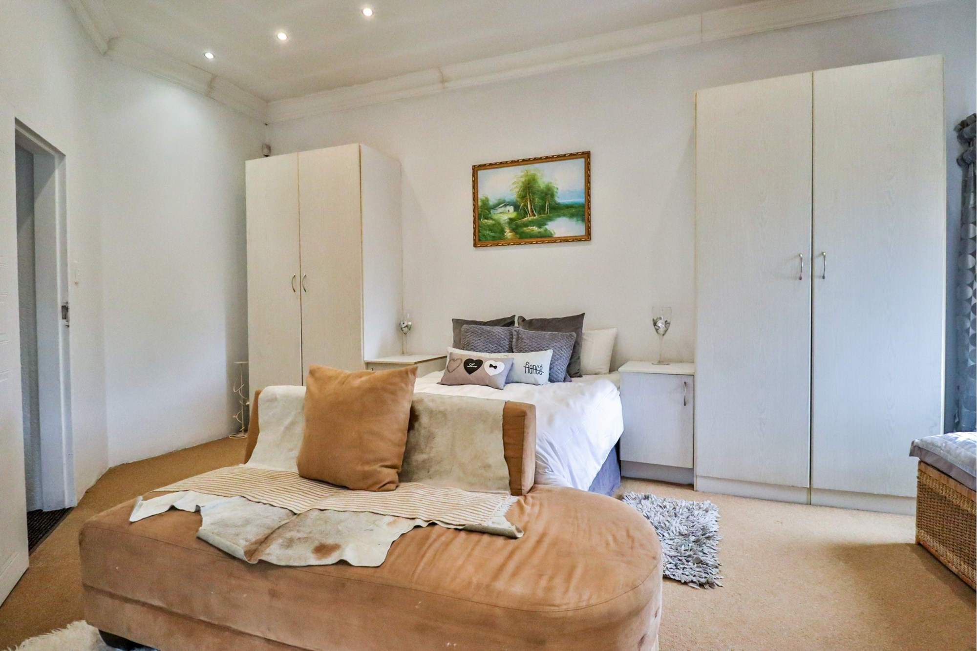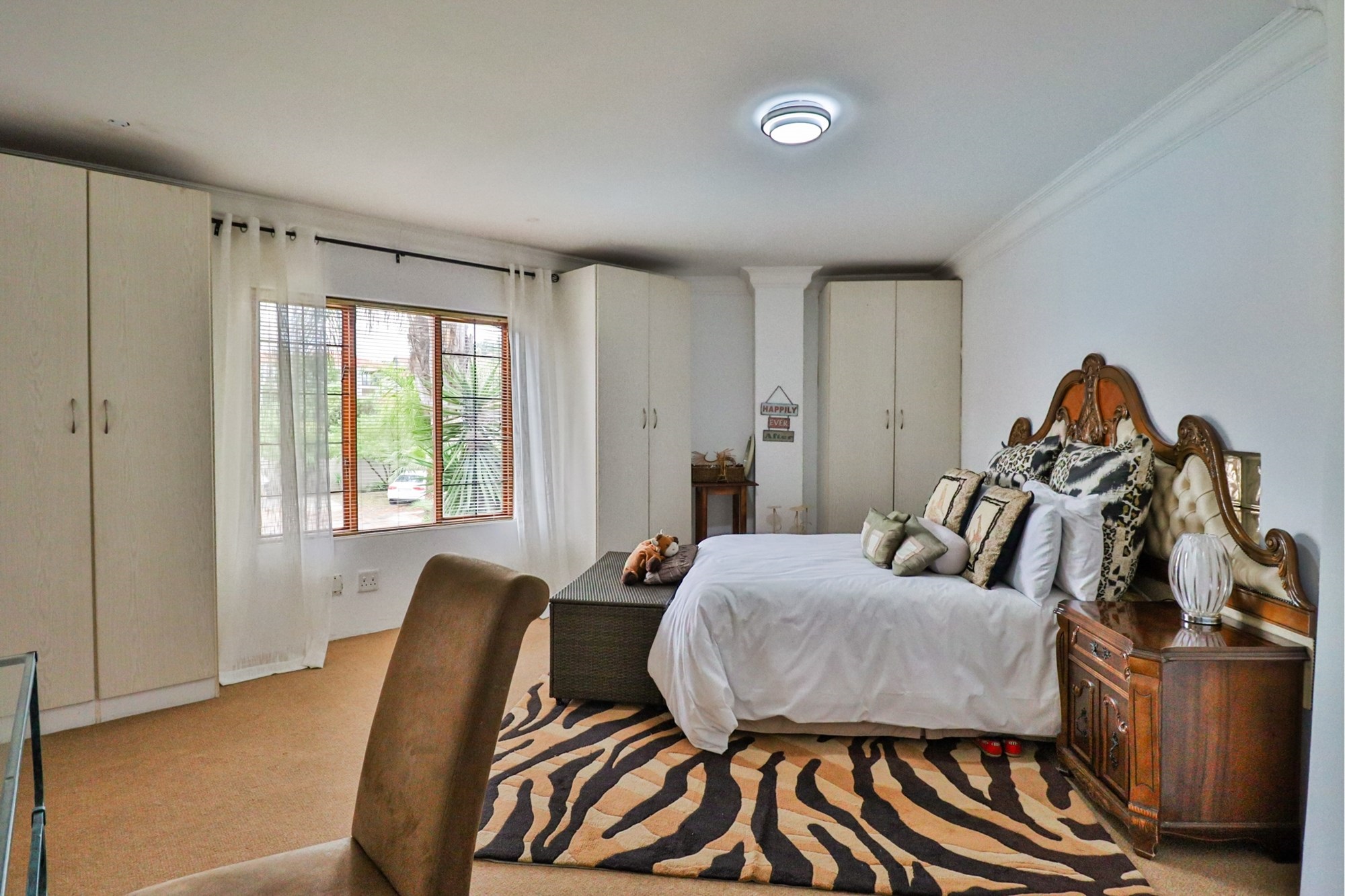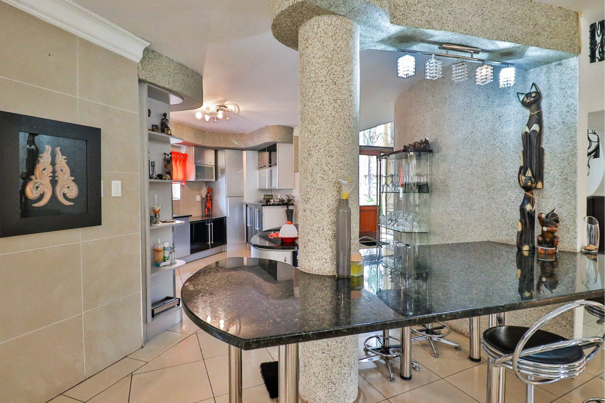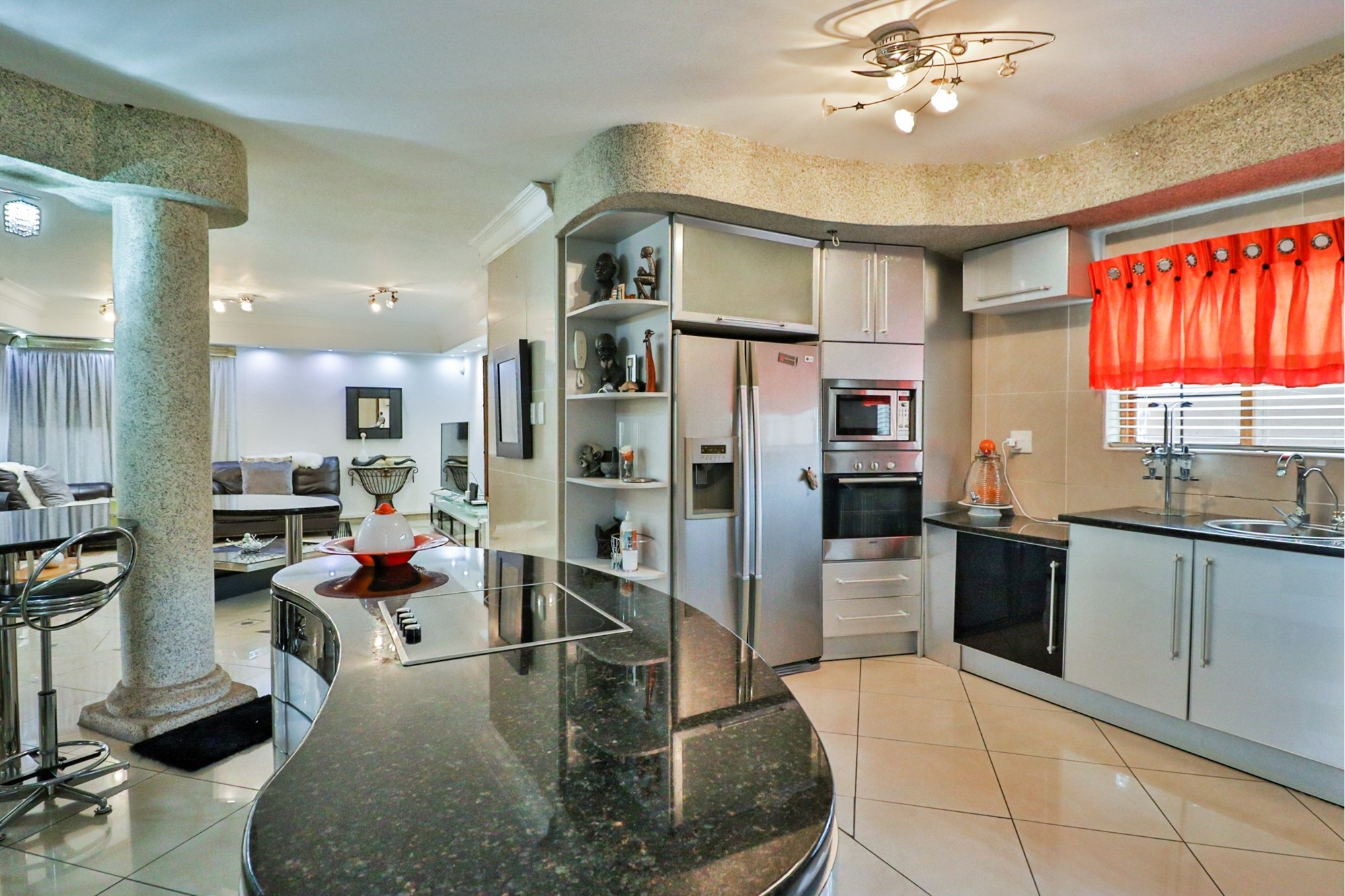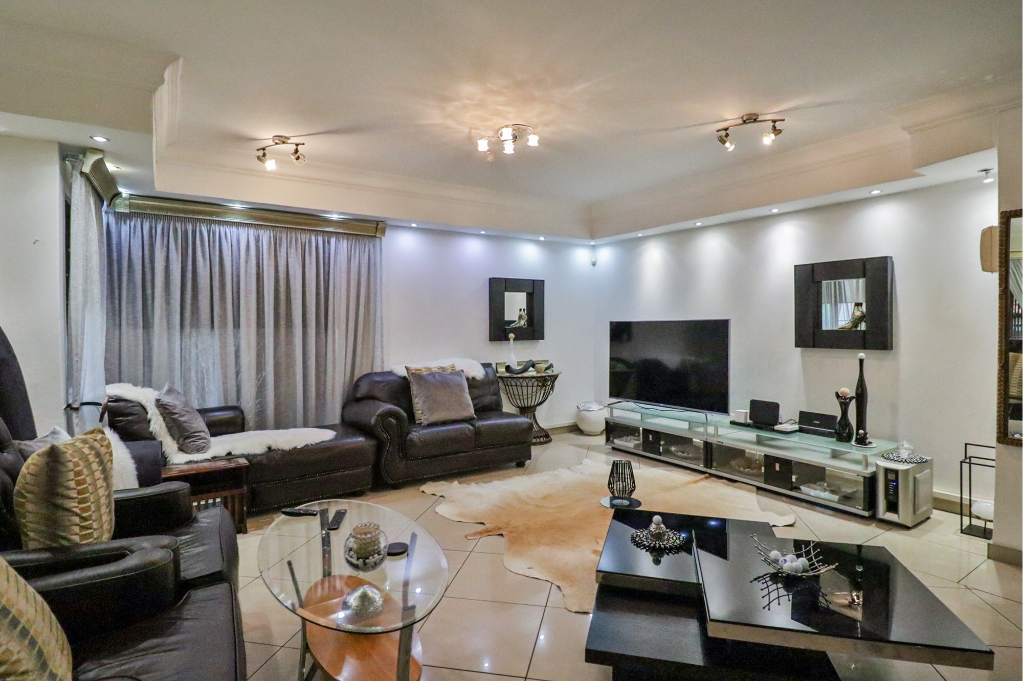 The covered patio outside hosts the entertainment areas overlooking a sparkling pool and a luscious tree-filled manicured garden, irrigated from a fully operational borehole.
