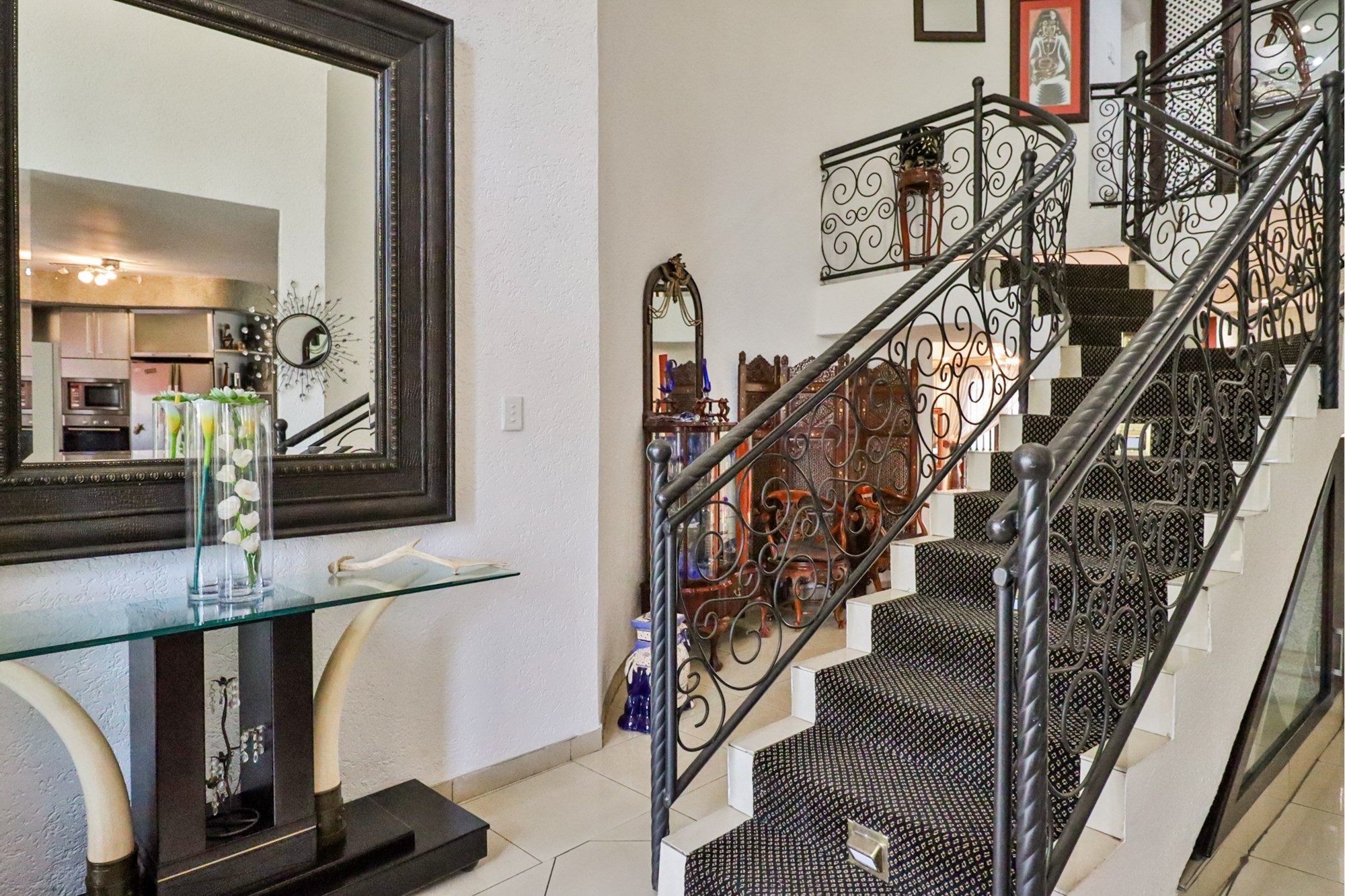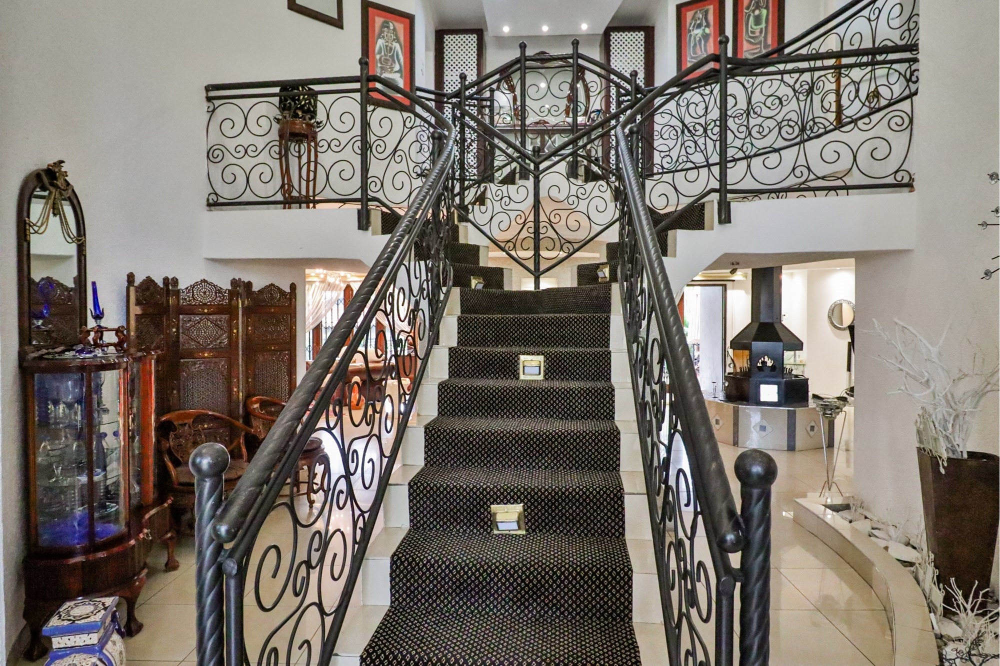 Entering the house, you are welcomed by a double volume foyer and gloriously large windows with lots of natural light. An impressive double staircase invites you upstairs with luxurious carpets and beautiful cast iron railings.