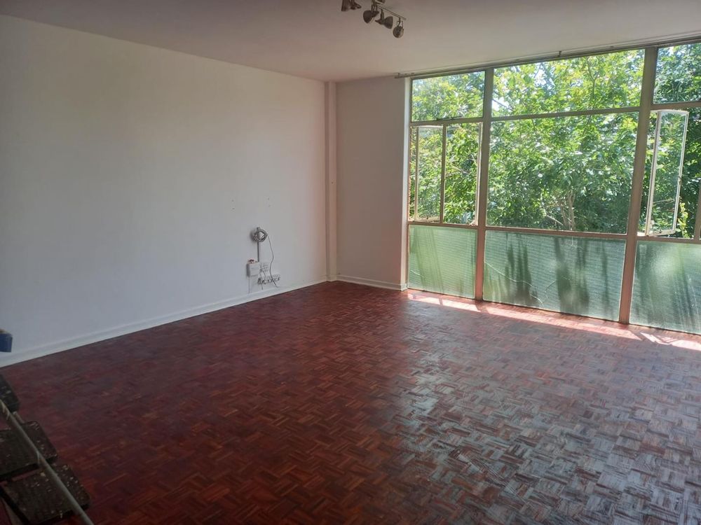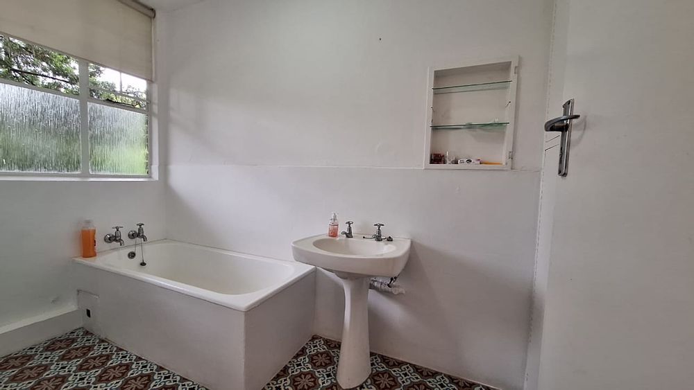 The generous living area is bright and inviting, complemented by original wooden parquet flooring that extends into both bedrooms. The tiled kitchen is well-equipped with ample cupboard and counter space, an electric oven, and a gas hob. Both bedrooms feature double-volume built-in cupboards, while the second bedroom includes a fitted blind for privacy. The bathroom includes both a bath and shower, with an additional guest toilet for convenience.