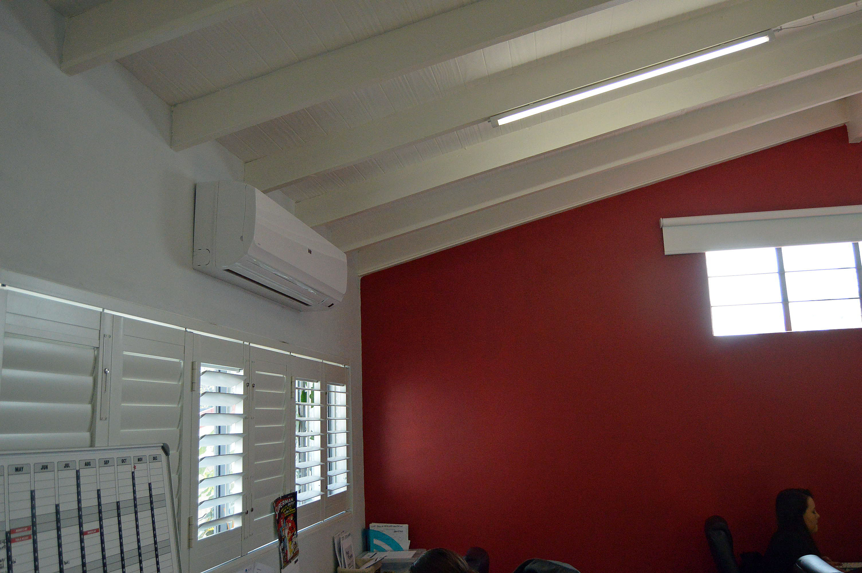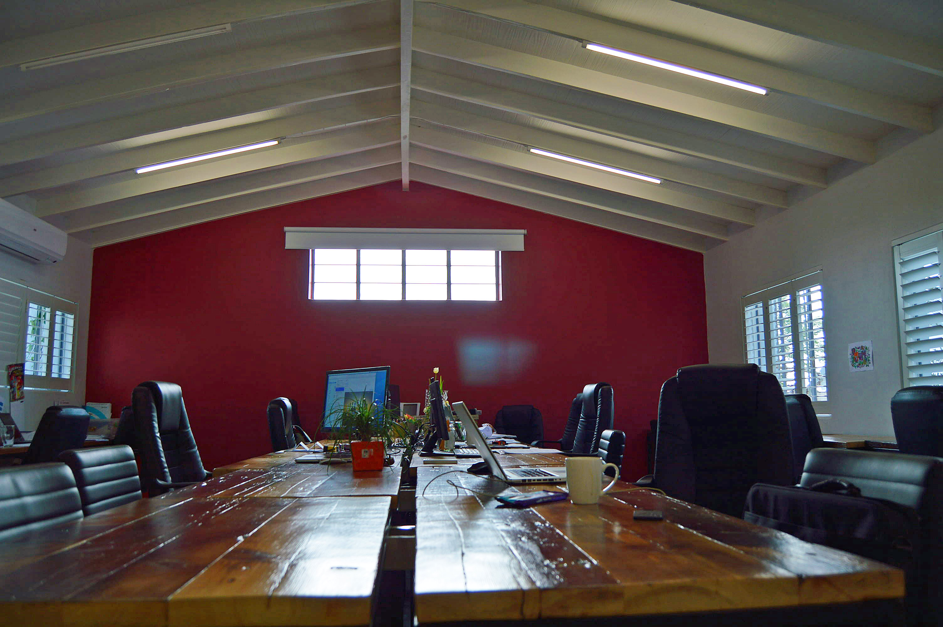 Flexible layout: 164 sqm total across two units; can be used as one large space or split into two offices. High ceilings and a bright interior with white wood slats.