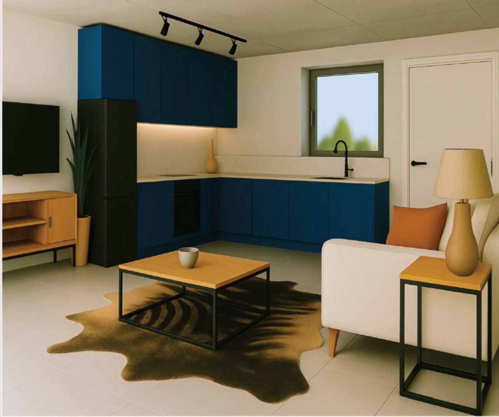 Modern open-plan living spaces featuring bold Kara Blue Peel cabinetry with sleek black handles