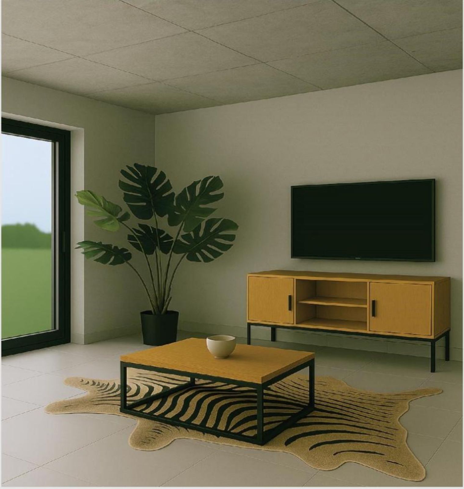 Minimalist living room with raw cement slab ceiling for an industrial-chic finish