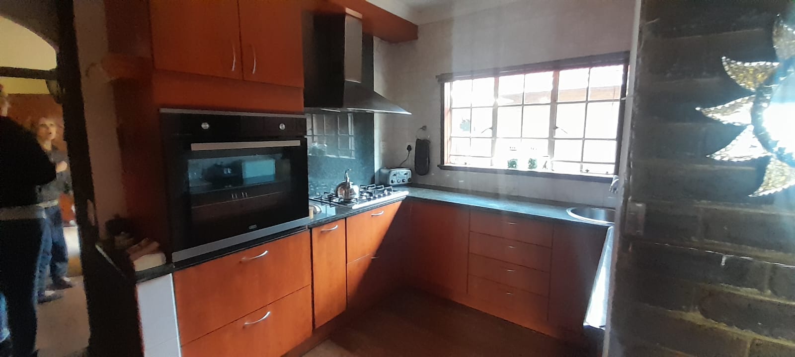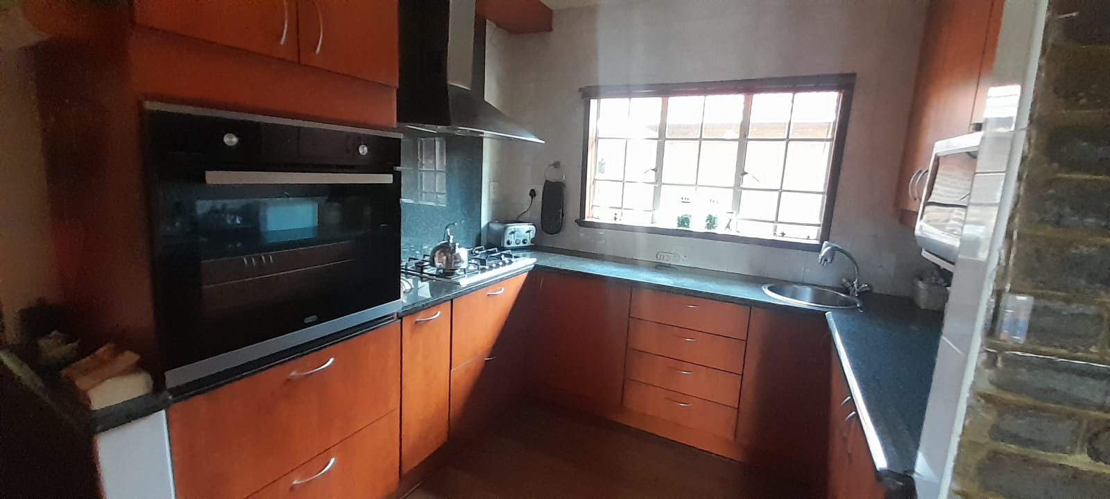 Kitchen with modern gas stove, electrical oven, and a scullery